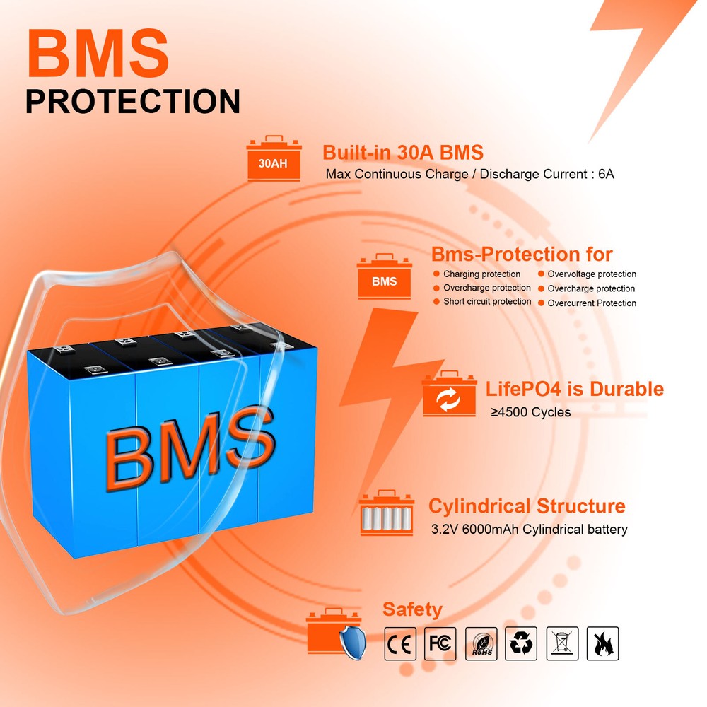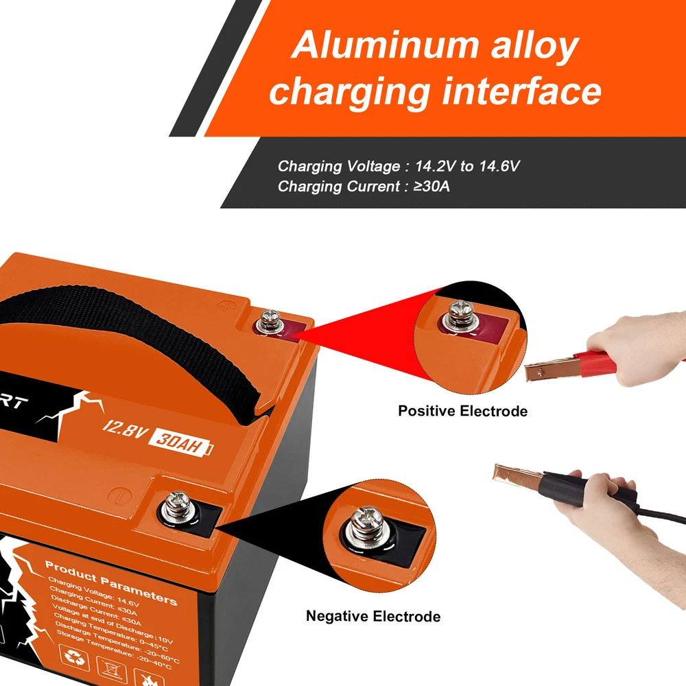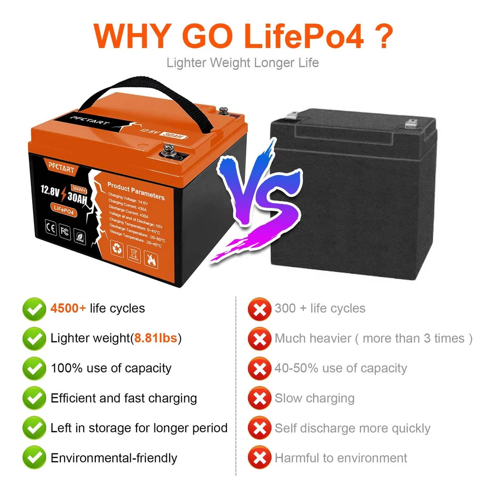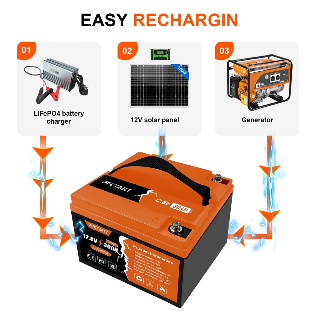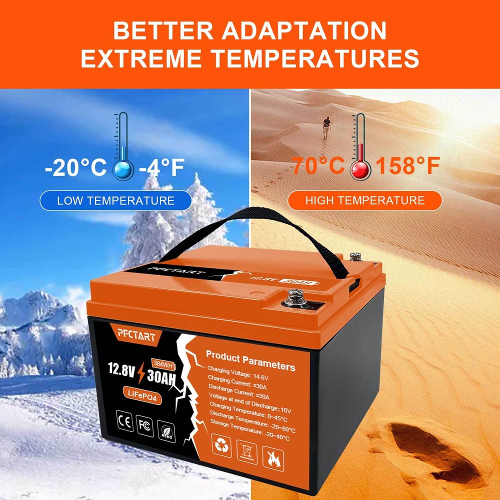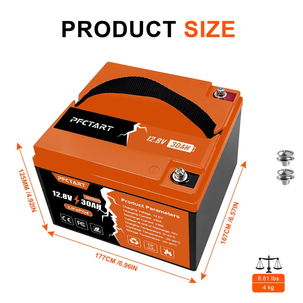 Features 【Automotive Grade Lithium Battery】 PFCTART lithium iron batteries have exceptional quality since they are manufactured by Automotive Grade LiFePO4 Cells with higher energy density, more stable performance & greater power. Highest-level safety based on UL Testing Certificate for the cell inside the battery.This makes li-iron batteries perfect for solar home, RV, campers,motor homes, off-grid applications. 【10 Years lifetime】PFCTART LiFePO4 battery provides 4500+ cycles, which is more than 10 times to Lead Acid with 300~600 cycles. PFCTART LiFePO4 battery has a 10-year service life, three times longer than the Lead Acid’s 3-year lifetime. 【95%* Efficiency】 PFCTART LiFePO4 battery’s flat discharge curve holds above 12.8V for up to 95%,of its capacity usage, providing astronomical boosts in run-time compared to only 50% in Lead Acid. This product is your best choice for outdoor camping power and indoor easy installation. 【1/3* Lightweight】 PFCTART LiFePO4 Battery weighs only 8.81 lbs for one module, only 1/3* the weight of lead acid batteries, which makes it an easy choice for RVs, Marine and Off-Grid Applications when mounting or mobility is in the consideration. 【100% Protection】 PFCTART LiFePO4 battery has built-in BMS (Battery Management System) to protect it from overcharge, over-discharge, over-current, and short circuit with excellent self-discharge rate. Built-in high-temp cut off prevents charging over 167 °F (75 °C). Without memory effect, no matter what state the battery is, it can be used as soon as it is charged. PFCTART LiFePO4 battery is IP65 level waterproof, which set you free from worrying to install indoors or outdoors. Specifications Battery type: LIFEPO4 MODEL: 30Ah 12.8V(4S5P) Rated capacity: 30Ah(384WH) Normal voltage: 12.8V Discharge termination voltage: 10.0V Charging voltage: 14.6V Internal resistance: ≤180mΩ Single cell: IFR 32700 3.2V 6000mAh Standard charging. Continuous current: 0.2C5A Continuous voltage: 14.6V Cut-off current: 0.01 C Standard discharge: Constant current 0.2C5A end voltage 10.0V Max. charging continuous current: 30A Maximum discharge continuous current: 30A Operating temperature range. Charge: 0~45℃ Discharge: -20~60℃ Product size: 177*167*125mm Weight : 4kg BMS Protection Cell overcharge detection voltage:3.90V±50mV Cell overcharge recovery voltage:3.80V±100mV Cell over-discharge detection voltage:2.00V±100mV Cell over-discharge recovery voltage:2.50V±100mV Rated operational charge current:30A Over current detection:60±5A PCM impedance:≤50mΩ Note It does not have series/parallel protocol, please do not use it for multiple series or parallel installations.