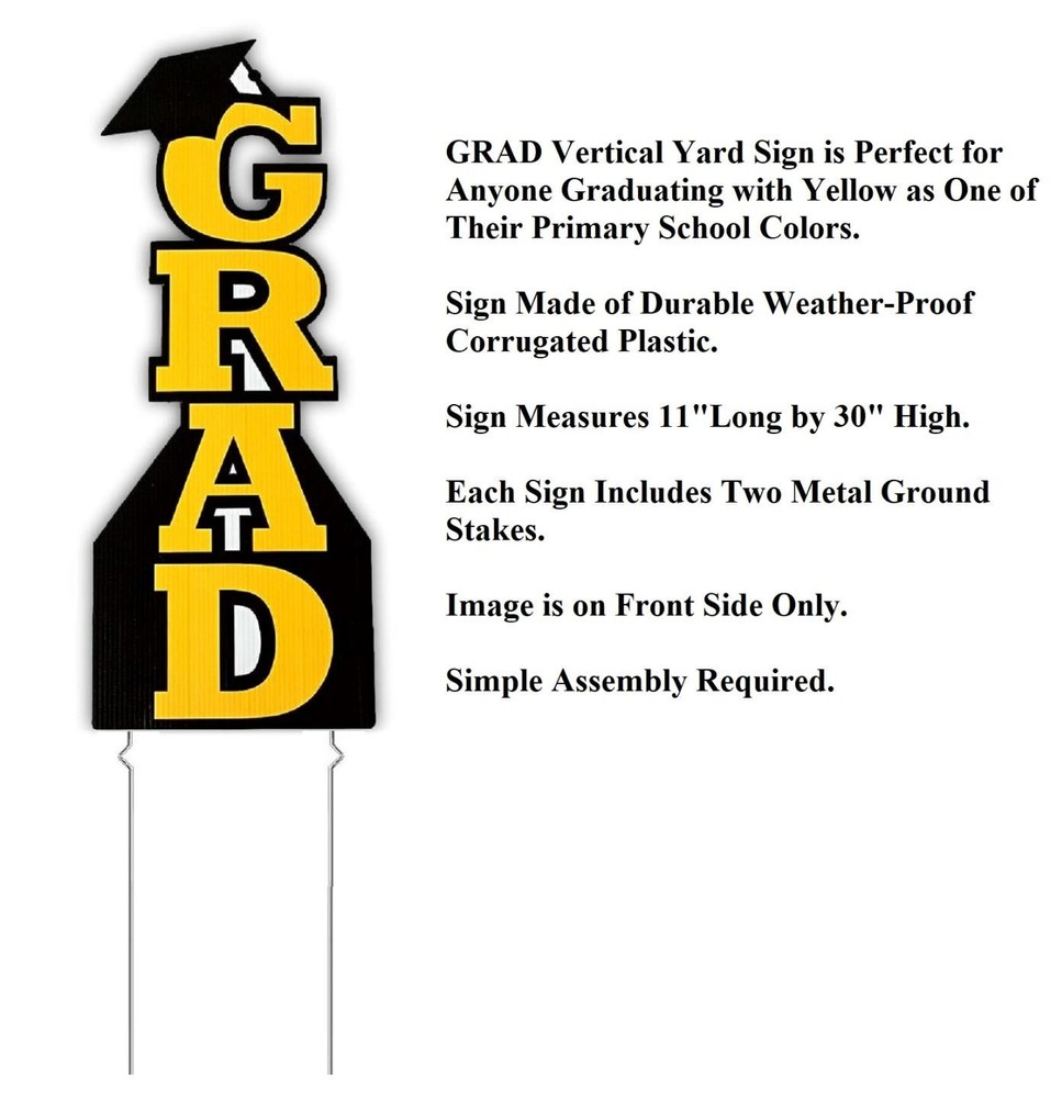 Yellow Vertical GRAD w/ Cap Yard Stake Graduation Party Plastic Sign 30"H #656 Yellow Vertical GRAD w/ Cap Yard Stake Graduation Party Plastic Sign 30"H #656 Click images to enlarge Description Yellow Vertical GRAD w/ Cap Yard Stake Graduation Party Plastic Sign 30"H. Dress up your lawn for a graduation party or just show off how proud of your graduate you are with this yellow colored "GRAD" yard stake. The top of the "G" has a motarboard grad cap and this vertical GRAD sign makes a bold statement in celebrating your graduate. Whether for high school, college, or even moving up from elementary school to middle school, this sign is perfect for party decor. Details: Measures 30"High x 11"Long Made Of Corrugated Plastic Includes Metal Stakes Stakes Securely Into Ground Design Is On One Side Only Requires Simple Assembly Re-Usable Other Colors Available In Our eBay Store, While Supplies Last. ~Buy more than one item at the same time from our eBay store and save in shipping costs!~ (If buying different items, just put them all in your cart before paying, to get the combined shipping discount!) Shipping We use UPS SurePost, UPS, USPS and FedEx SmartPost to deliver our products to your home, depending on which method is more efficient for your order. We use suppliers for some of our orders and our suppliers will choose the service that is used for these orders. PLEASE MAKE SURE YOUR ADDRESS CAN BE VERIFIED BY USPS. Please allow 7-10 days for the item to reach your home. We cannot be responsible for items shipped to incorrect or incomplete addresses, which may result in the cancellation of your order. YES, we do combine shipping! The highest shipping cost item ships at regular price, and each additional item ships at $2.00 more in additional shipping charges. If you are buying several different items from our store, put them all into your cart before paying to get the combined shipping discount. Terms of Sale Unless otherwise noted, we accept returns up to 30 Days after your purchase, through the eBay Returns System. Please use eBay to contact us if there is any problems or issues with your order. In some cases, we order the item purchased from one of our suppliers, and it is shipped directly from our supplier to the customer. There are times when an item unexpectedly becomes unavailable from our supplier. We do our best to check on all of the items availability several timea a day. If an item is unexpectedly unavailable, we will issue a refund immediately. Contact Us Please use the message center in eBay to contact us. We check our message box in eBay several times a day. If you have any questions or concerns with your order, please feel free to contact us. We care very much about our customers being 100% happy with their purchases. We would very much appreciate you letting us resolve any issues you may have with your order by contacting us first, before taking any other unnecessary actions. Images sell! Get Supersized Images & Free Image Hosting Create your brand with Auctiva's Customizable Templates. Attention Sellers - Get Templates Image Hosting, Scheduling at Auctiva.com.