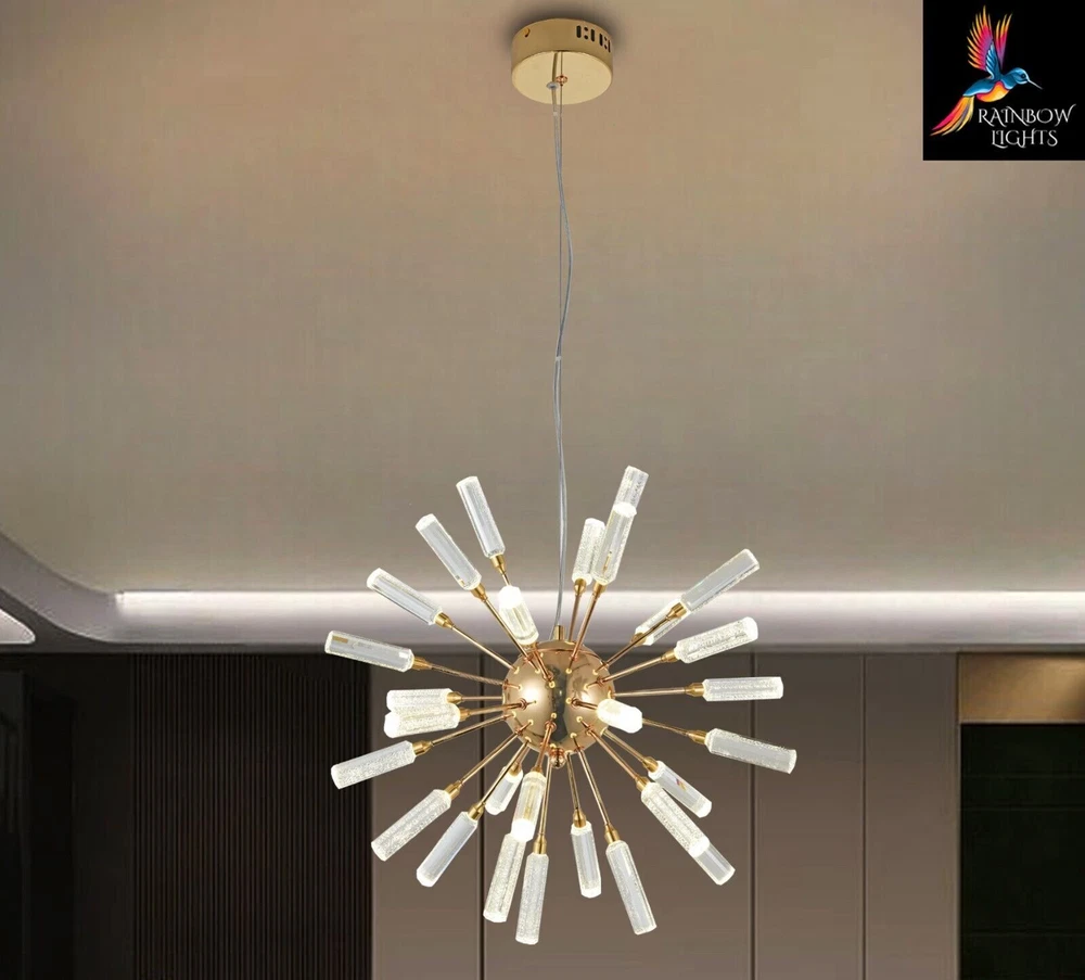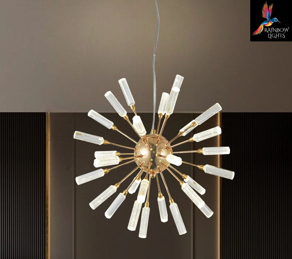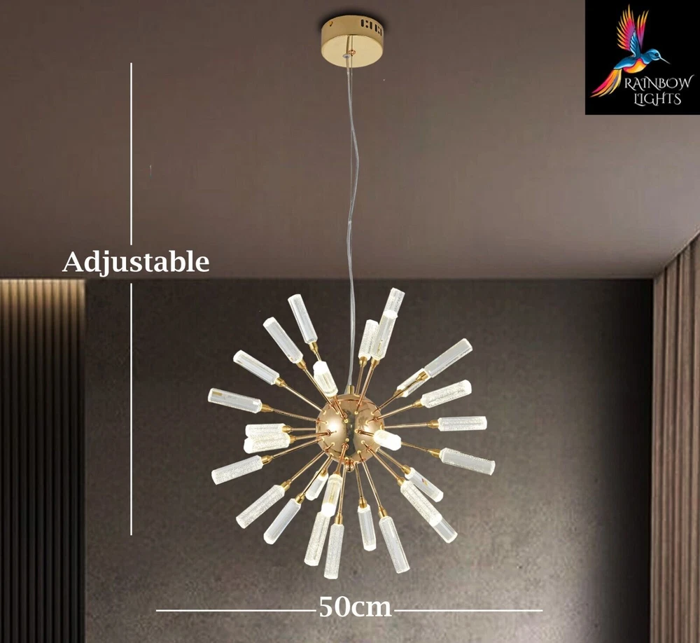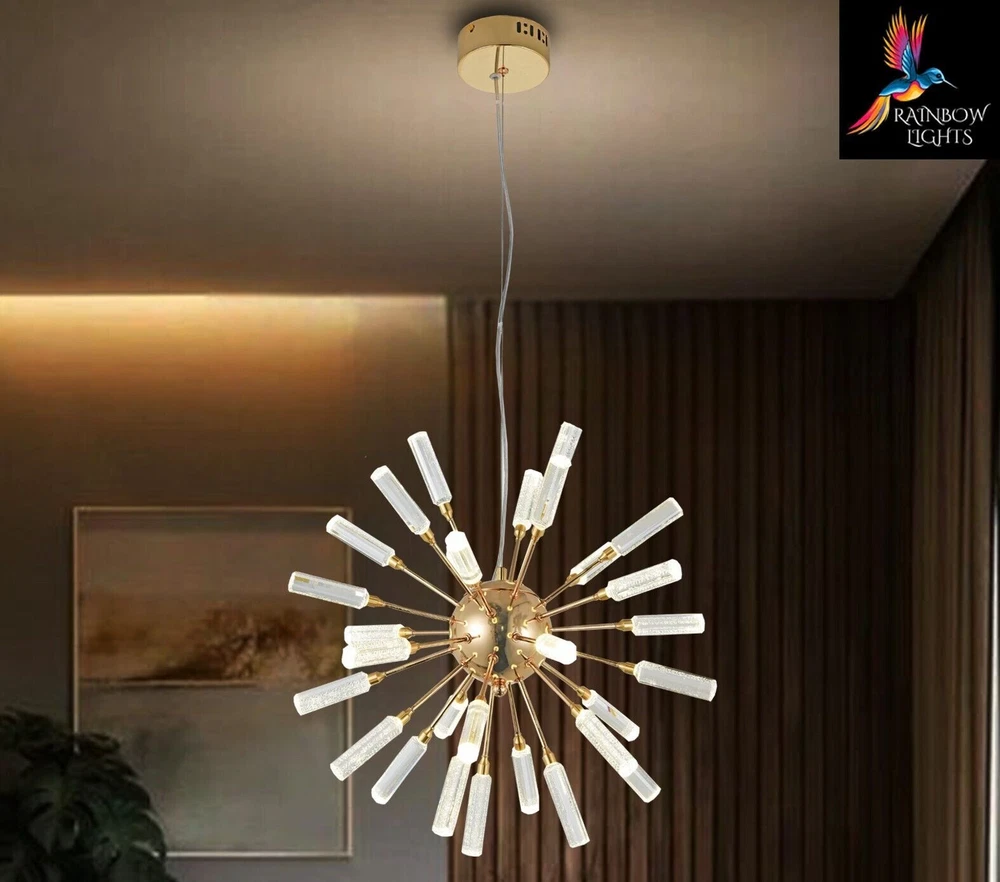 Introducing the Starburst Style Seeded Crystal Stick Sputnik Chandelier, an exquisite addition to your home decor from Rainbow Lights. The Starburst Sputnik chandelier is a unique and timeless lighting fixture, characterized by its striking design featuring multiple arms radiating from a central sphere, reminiscent of a starburst or satellite. Available in a variety of designs, sizes, and finishes such as chrome, brass, and bronze, these chandeliers complement a diverse array of interior styles. Their bold and dynamic appearance serves as a focal point in any space, including living rooms, dining areas, and entryways. Product Specifications: Condition: NEW Material: Crystal and metal Width/Diameter: 50 cm Height: Adjustable Product Type: Sputnik Light Style: Contemporary Number of Bulbs: 30 Bulb Type: LED Voltage: AC110-240V - 50/60Hz Lumens: 80-100 CCT (Color Temperature): Clear Light Source: LED Shade: 3000K (Warm White) Specific Uses: Indoor Weight: 6.6 kg Please note that the bulb is not included in the package. Crystal Chandelier Lighting - Crystal Pendant Lighting - Kitchen island Hanging Light - Dining room Pendant Light - Foyer Chandelier lighting - Bedroom Pendant light Listing and template services provided by inkFrog