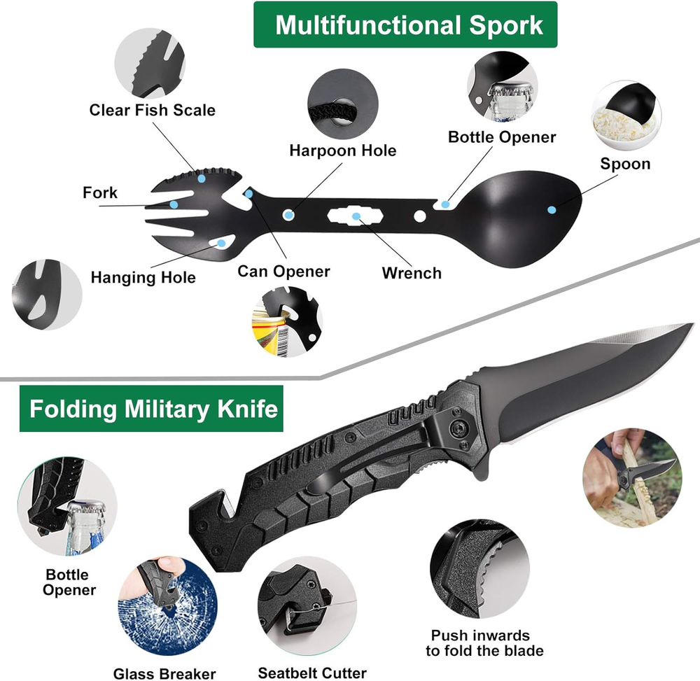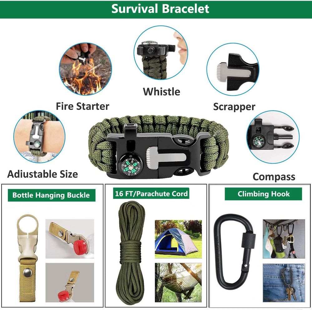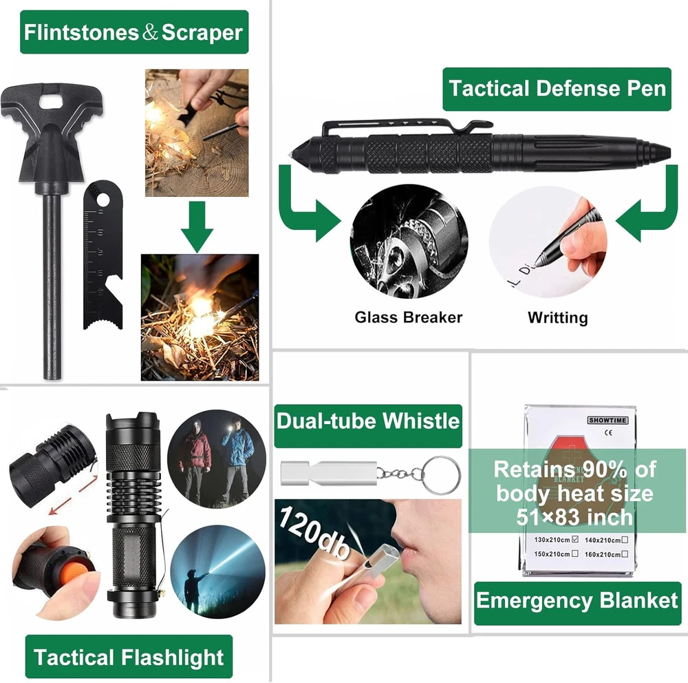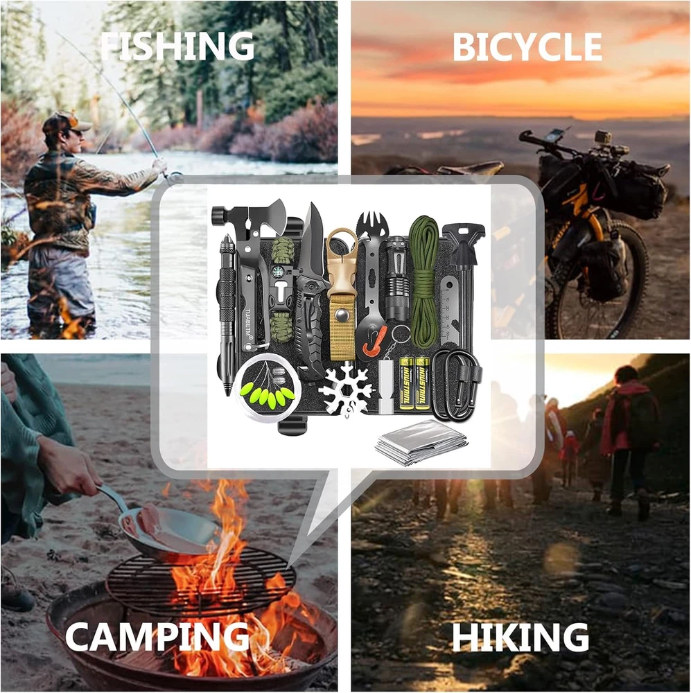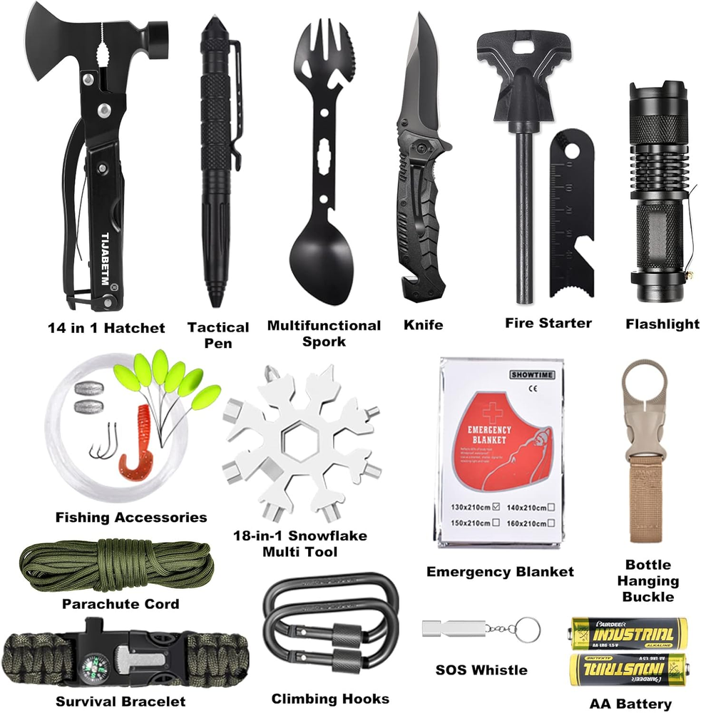 Must Have 30 in 1 Emergency Survival Gear Kits: 14 in 1 A-xe Hammer, 18 in 1 Snowflake Multi Tool, Tactical Pen, Water Bottle Clip, Emergency Blanket, Flint Stone Scraper, Whistle, Survival Bracelet, Flashlight, Multi-use Spoon Fork, Cord , and Multifunctional Storage Box... All in One Survival Gear Kit: The multi-purpose survival gear kits contains everything you need when there is any emergency situation occurs like natural disaster or wilderness adventure. Can meet the storage needs of all emergency supplies. Lightweight and compact, easy to carry and store. Prepared for Any Emergency: The camping accessories contain everything you need when there is an emergency situation. It is the perfect companion to help keep you safe and have peace of mind while you're hiking, camping, hunting, Fishing, backpacking, travel ,wilderness survival adventures. The Ultimate Christmas Stocking Stuffer: Develop Survival Practicals & Skills: Our Survival gear and equipment will help you to build a outdoor adventure interest. Improve survival skills and how to first aid in an emergency or with serious injuries. A Survival Kit for Every Day: Unique Gifts for Men Who have everything,Stocking Stuffers for dad who is outdoor lover . This Survival Gear will brings smile to their face and they are sure to love./Survival Kit Advent Calendar 2024 A Fantastic Gift for Adventure Seekers: Cool Gadget and TOP BEST for men who has everything.If it does not meet your expectations, contact us and we will solve it to make sure that you are happy with your purchase Product Description Buliding on Better Living Founded in 2016,TIJABETM was established with the goal of enriching the lives of customers across the globe by providing thoughtfully engineered consumer products designed with convenience,simplicity, practicality and value in mind. Today,TIJABETM is now a mature brand owner,serving an outdoor equipment.