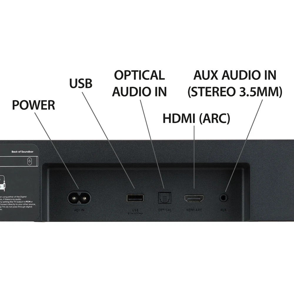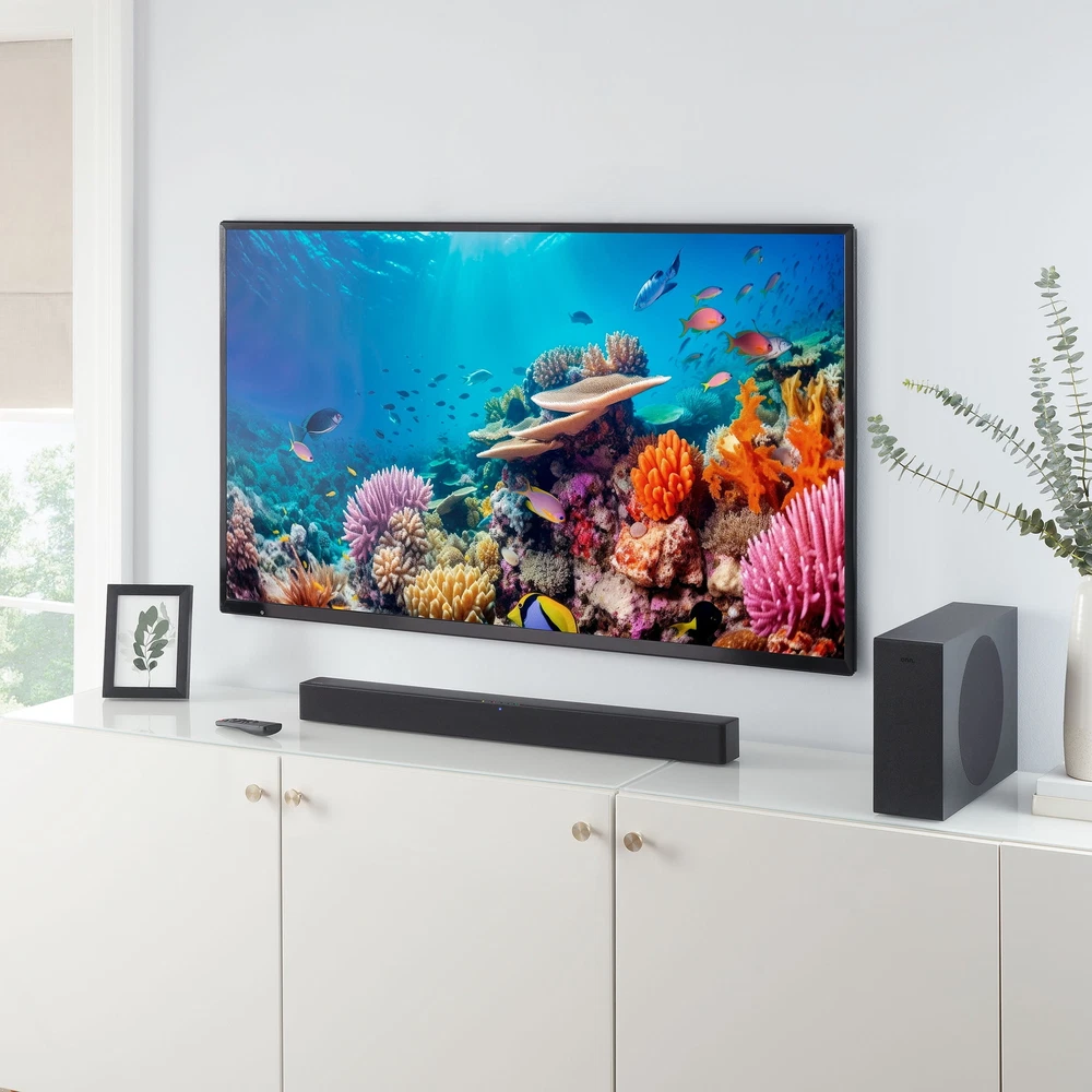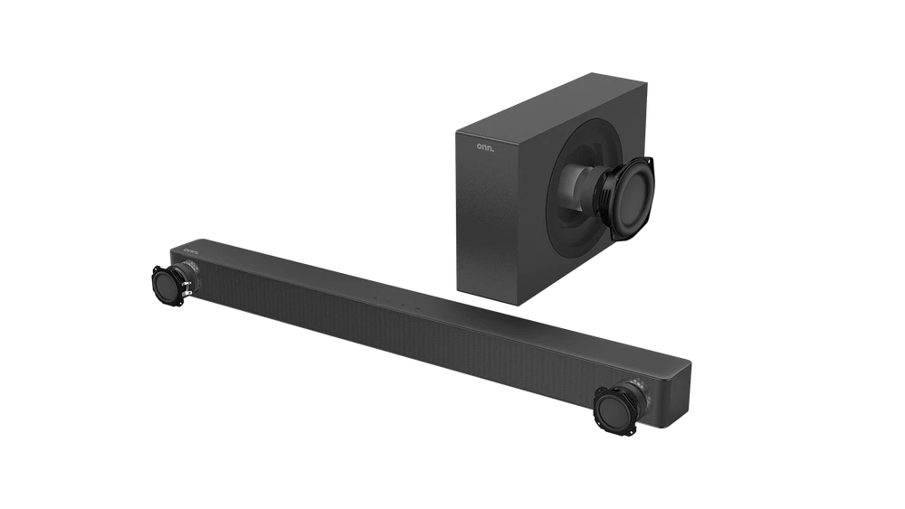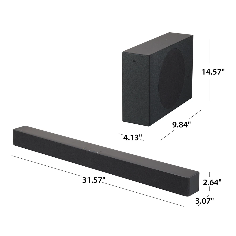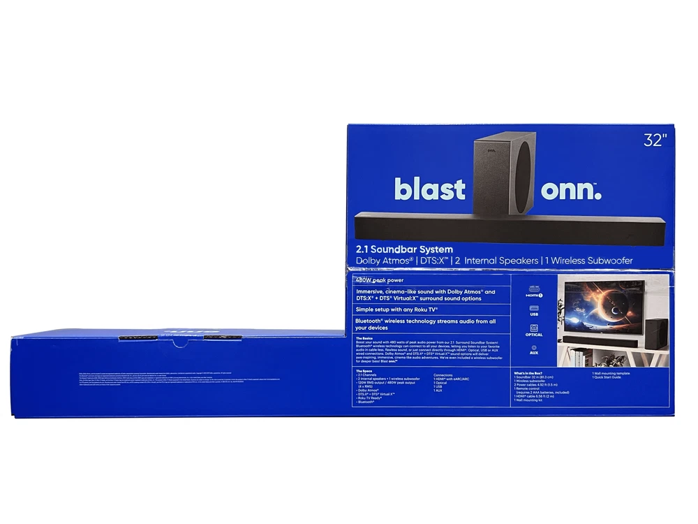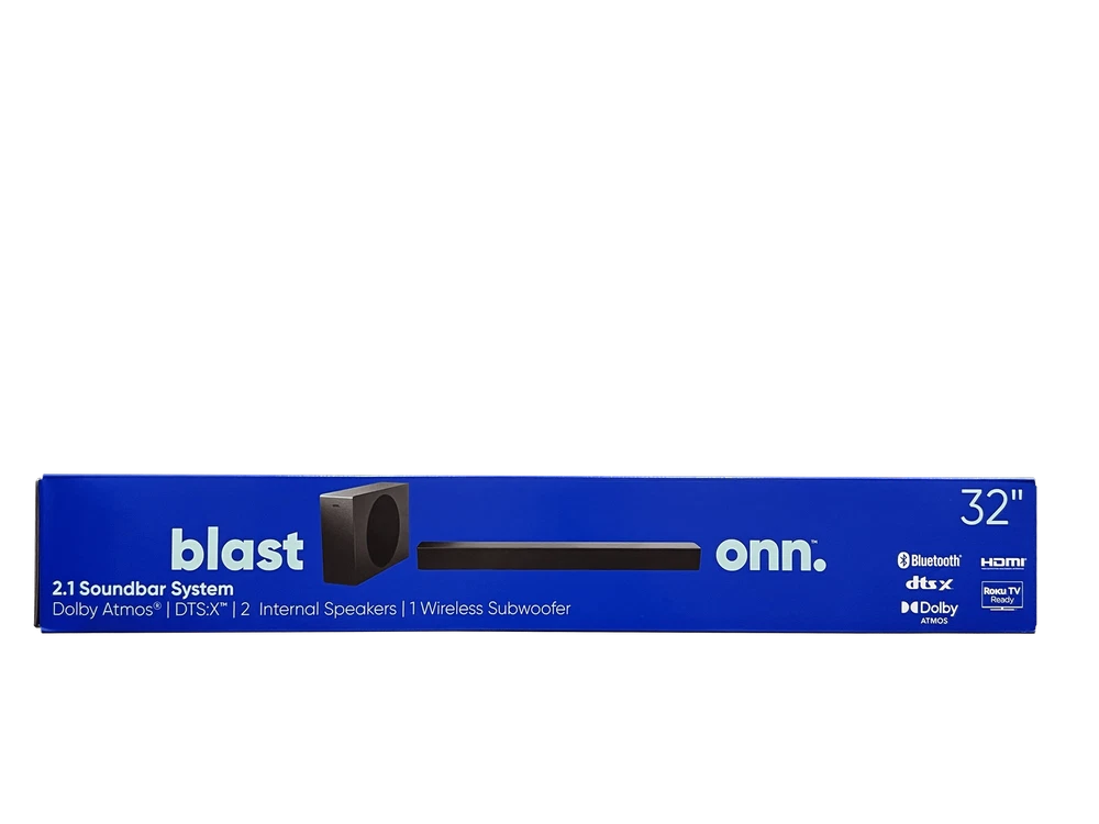 Boost your sound with 480 watts of peak power from our 2.1 Soundbar System! Listen to your favorite audio in flawless Dolby Digital Plus, streamed from your devices with Bluetooth wireless technology or connected directly through HDMI, Optical, USB or AUX connections. We've even included a wireless subwoofer for deeper bass. Blast onn. We're onn. to something here. We took the hassle out of buying electronics and built a brand that's fresh and simple. With delightful pops of color, finding the right product has never been easier. Say goodbye to stressful decision-making and fear of the electronics aisle. Our mission is simple... to deliver great products and make it easy. Choose onn. and get back to using your brainpower for the important things in life...like pondering the question, "What should I binge watch this weekend?" onn. 32" 2.1 Soundbar with 2 Speakers & Wireless Subwoofer 480 W peak power Dolby Audio (supporting Dolby Digital Plus) Simple setup with any Roku TV Bluetooth wireless technology streams audio from all your devices 2.1 channels 2 internal speakers and 1 wireless subwoofer 120 W RMS output/480 W peak output (4 x RMS) Connections: HDMI (ARC), Optical, USB, AUX What's in the Box? 1 Soundbar 32 in (81.3 cm), 1 Wireless subwoofer, 2 Power cables 4.92 ft (1.5 m), 1 Remote control (requires 2 AAA batteries, included), 1 HDMI cable 6.56 ft (2 m), 1 Optical cable 6.56 ft (2 m), 1 3.5 mm AUX cable 6.56 ft (2 m), 1 Wall mounting kit, 1 Wall mounting template, and 1 Quick Start Guide