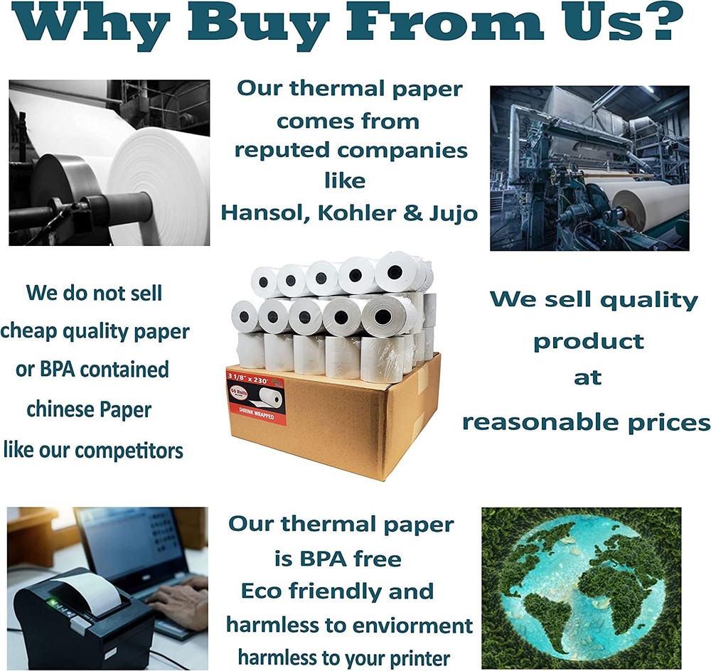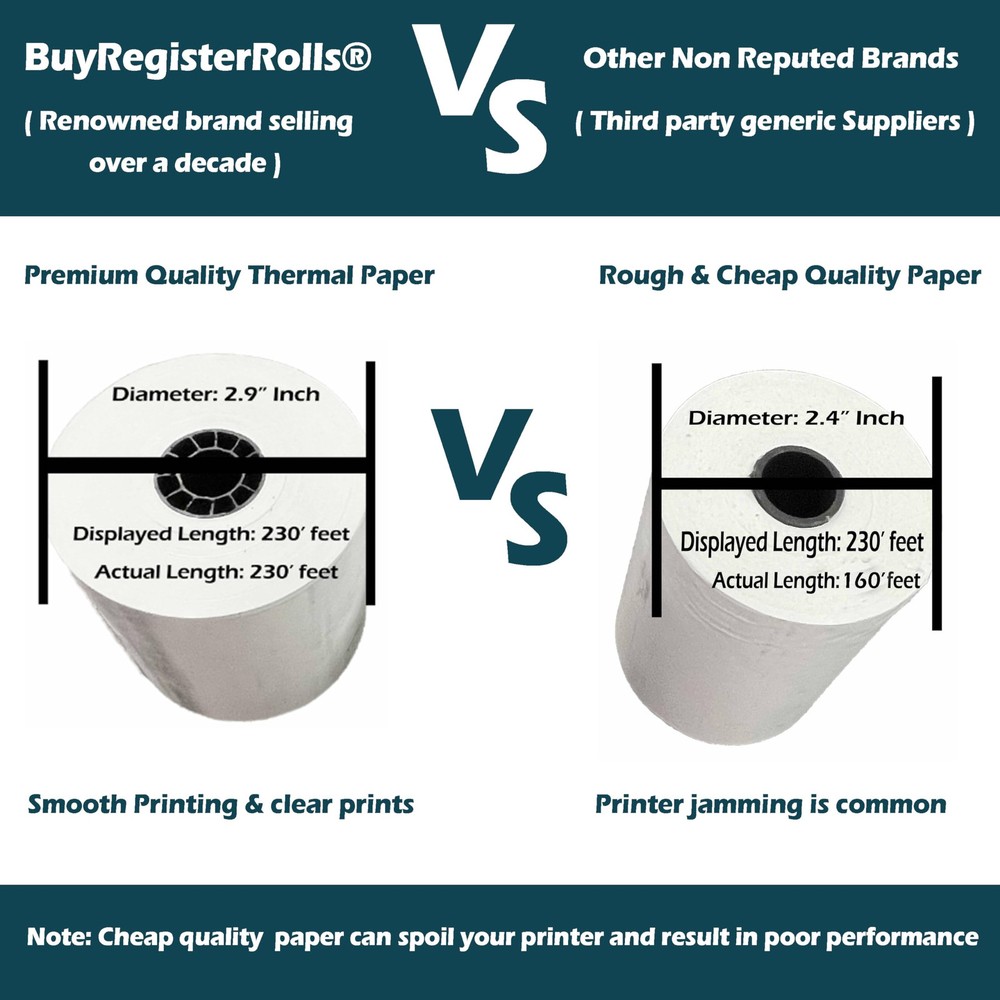 3 1/8" x 230': Thermal Paper Rolls ( 32 Rolls ) Roll Width: 3 1/8 inches ( 80 mm ) Roll Diameter: 2.85 inches ( 72 mm ) Length: 230 feet (70 m) Inner Core Diameter: 7/16" ( 11 mm ) Outer Core Diameter: 7/8" ( 22 mm ) Packaging: Shrink-wrapped in packages of 5 rolls/pack End of paper: Red Warning Stripe at End Rolls. COMPATIBLE WITH -: A715, A716, A756, A758, A760, A793, A794, A795, AZT 381PD, AZT 804R AZT-805W, PRP-300, BTP-2002-NP, SRP-350, SRP-350 Plus, SRP-350I, SRP-350II, CBM1000, CBM230, CBM231, CBM293, CTS310, IDP3210, IDP3310, LT380, CT-S300, M129A, M129B, M129C, TM-T70, TM-T80, TM-T85, TM-T88, TM-T90, TM-T88II, TM-T88III, TM-T88IV, TM-T88V, T77-T, T77TH, TM-T80AS, PT-6215, PT-6215EB, RP-320, RP-500, RP-500, RP-600, PP7000, PP9000, POS X XR500, XR510, XR520, SCP700,Fits many more POS thermal printers