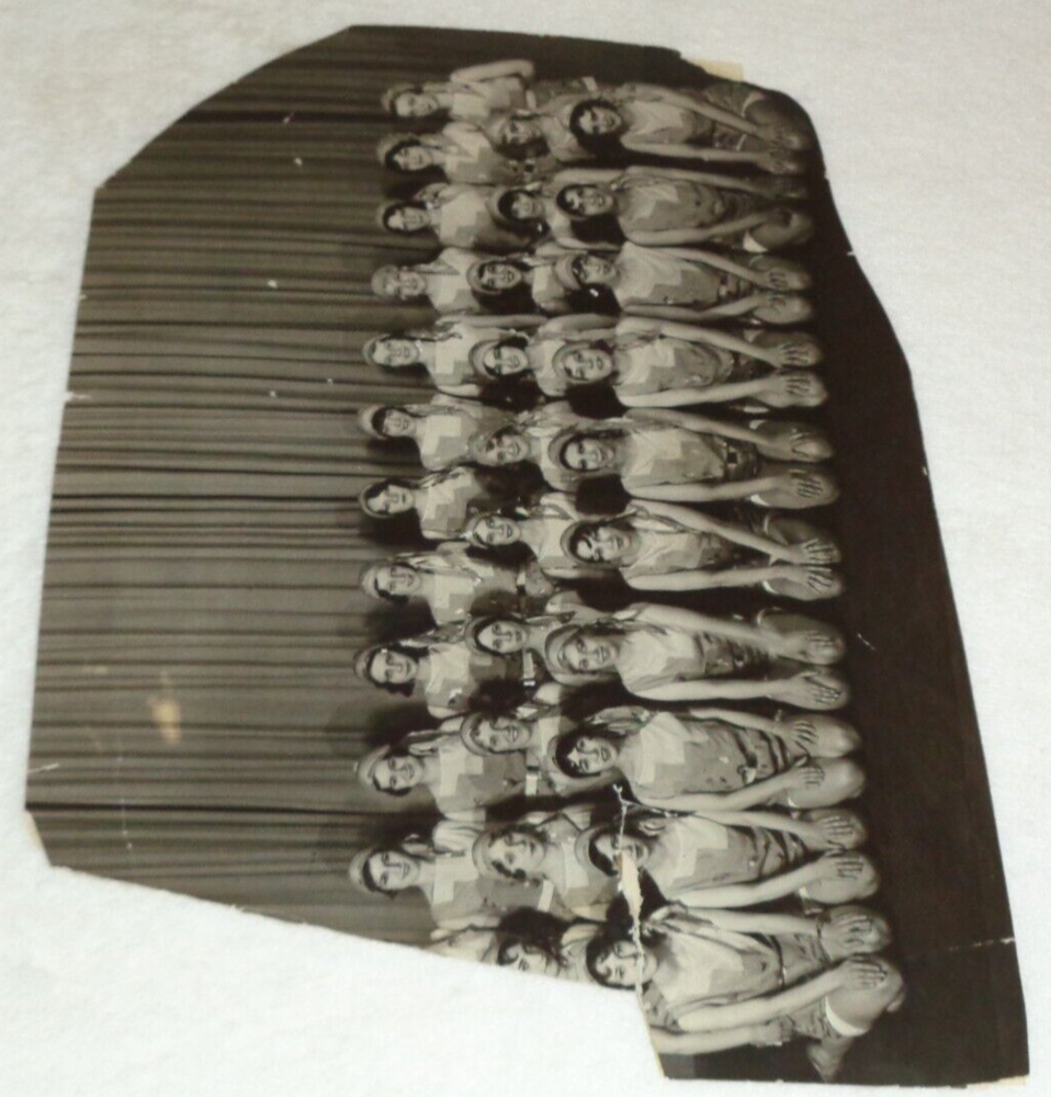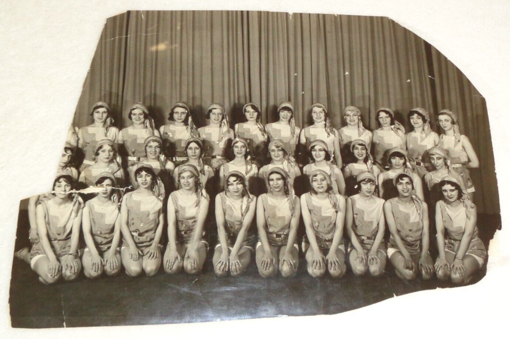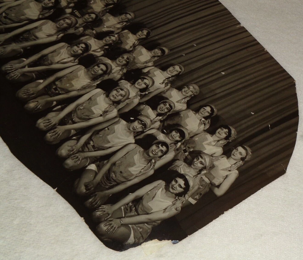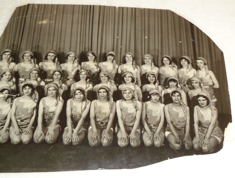 Antique Original The 32 Roxyettes Broadway Dancing Pre-Rockettes 1920s NYC Rare Historical Photo Photo of Russell E. Markert's Thirty-Two Roxyettes at the Roxy Theatre in New York City - Circa. Late 1920s. The Roxyettes later became the famous Rockettes. Measures approximately 6 5/8" x 9 1/8". Photo has uneven sides and has been cut. The left side has been cut significantly, and one of the women is not visible, while another is partially visible. The other edges and corners have also been cut. I don't know why. The right side corners are rounded. There is surface and edge tearing, a heavier tear on the left side of the image, surface scratches, creasing, discoloration and marks from age, handling and storage. There is some bowing to the photo as well. Measures need to be taken to historically preserve this classic image. On the reverse side, tape was placed across nearly the entire surface. Please see photos for more information on condition and ask any questions you may have.