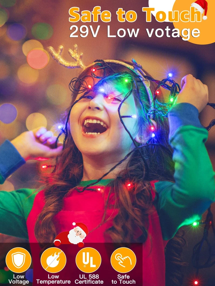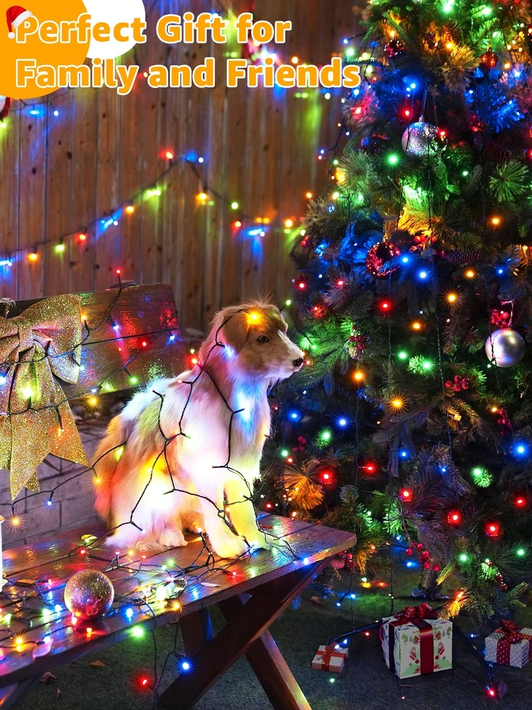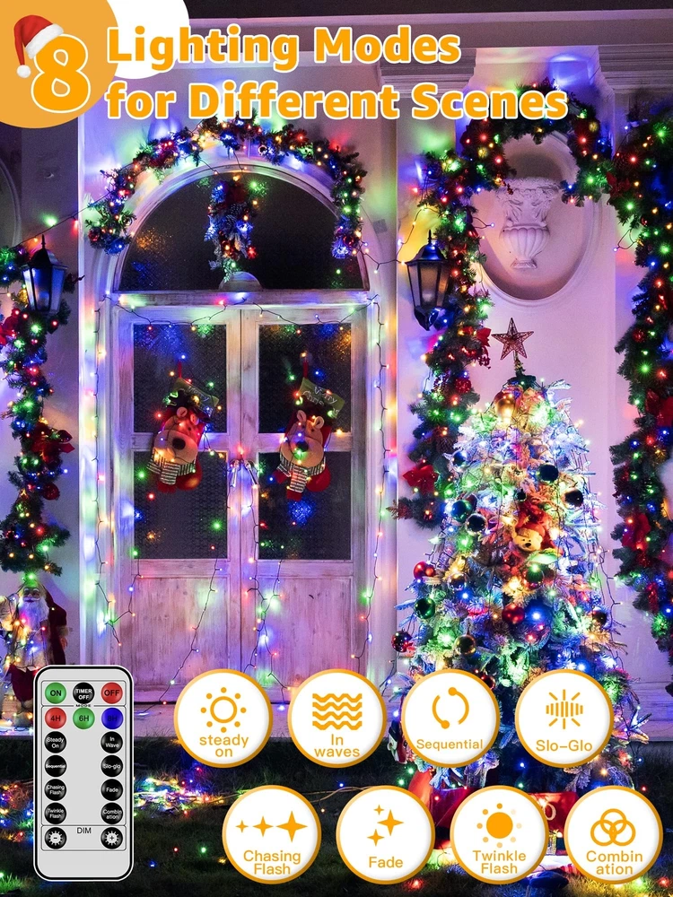 Extra Long and Bright Christmas Lights: The LED outdoor Christmas lights are 1000 LED 328 FT in length and emit a colorful glow that will create a holiday atmosphere in your space 8 Lighting Modes: The Christmas lights for tree has 8 lighting modes; (Steady ON, In Wave, Sequential, SLO-GLO, Chasing Flash, Fade, Twinkle Flash, Combination) Timer Memory Function: The LED Christmas lights features 3 timer function; 4 hrs on & 20 hrs off; 6 hrs on & 18 hrs off; 8 hrs on & 16 hrs off; The memory mode will save the previous settings 4 Dimmable Ways for Widely Use: The outside Christmas lights have 4 brightness adjustments range from 25%, 50%, 75%, 100% to choose Waterproof and UL Certification: The multicolor Christmas lights are certified by UL588; With IP44 waterproof rating; the lights remaining bright even during extreme weather