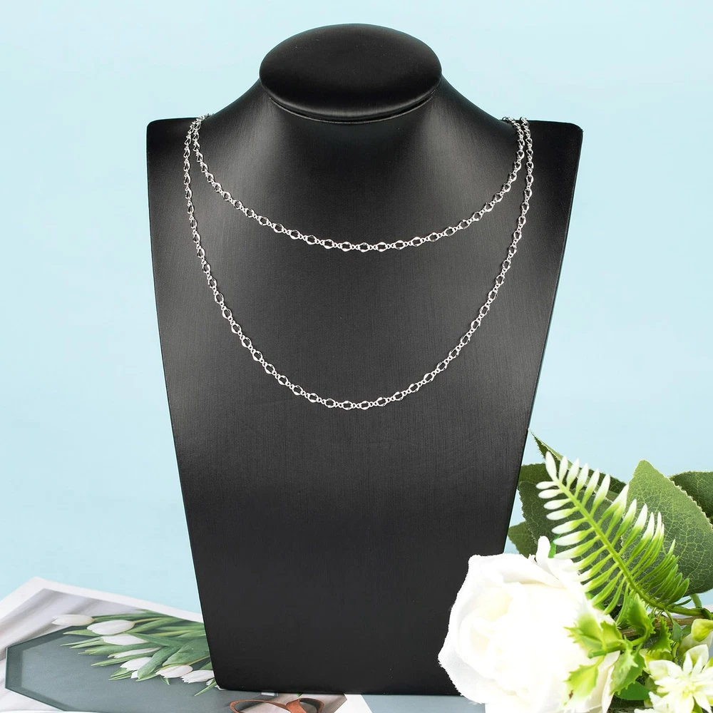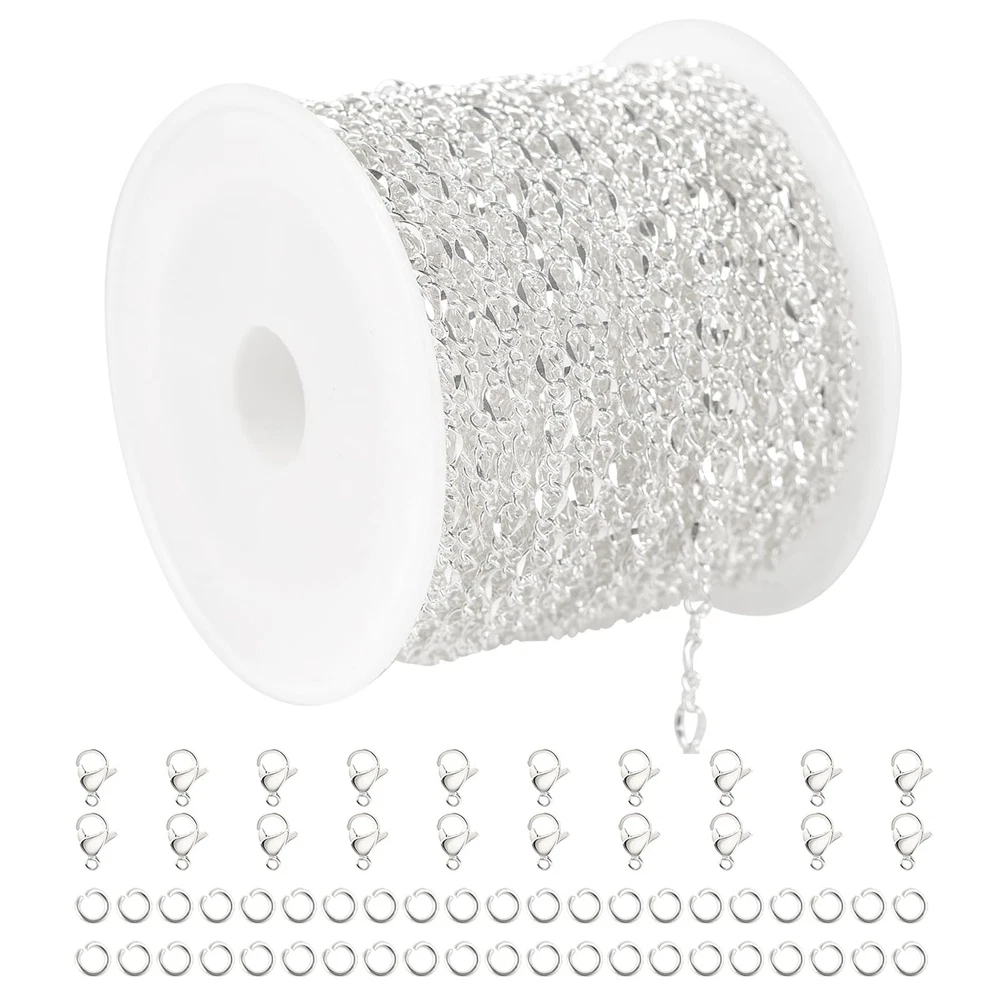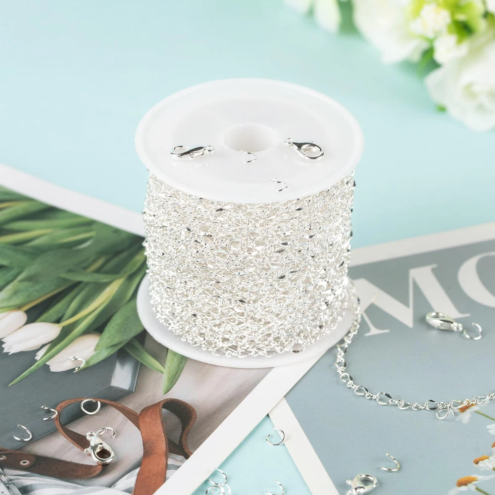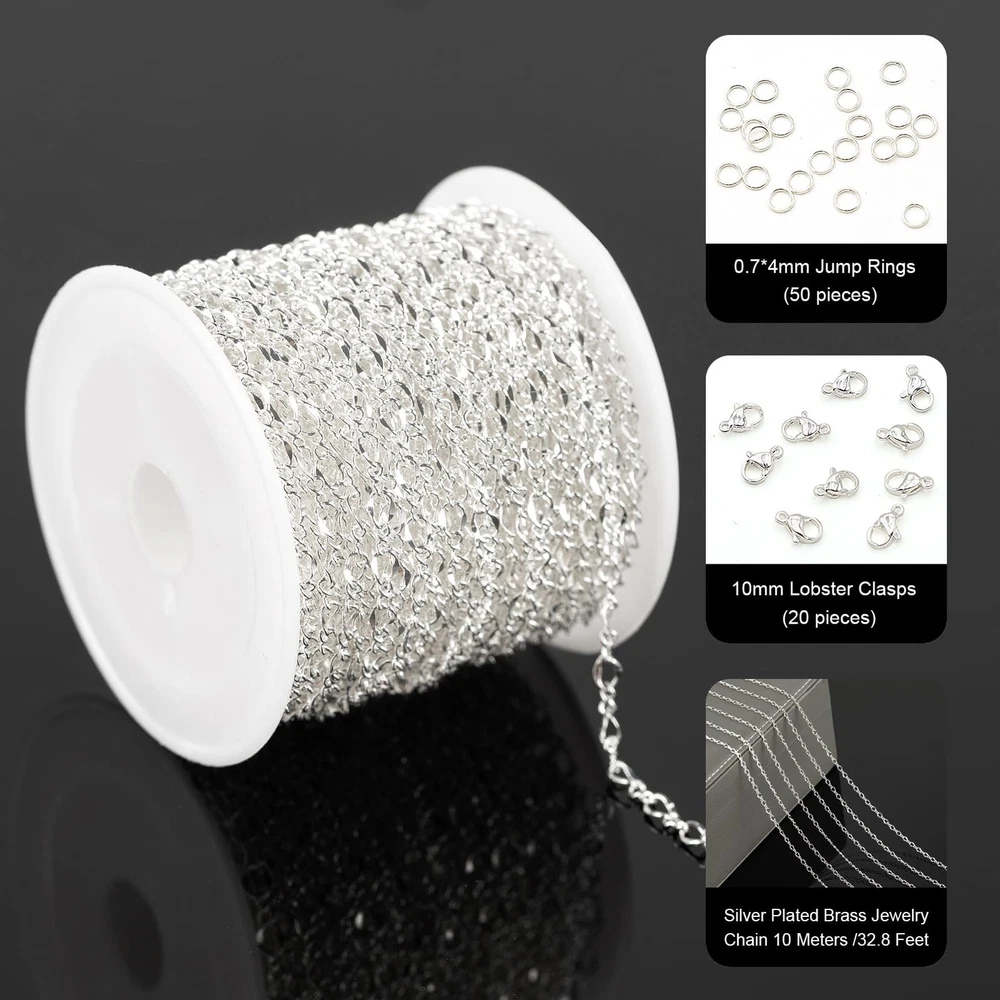 32.8 Feet Silver Plated Brass Chain for Jewelry Making Twist Chain Link for Necklace Bracelet DIY Jewelry Making Supplies Findings Specification: Brand: Material: Silver plated brass chain Lip link size: about 4mm long, 3mm thick Connecting link size: about 3.4mm long, 1.4mm wide Lobster Clasps Size: 10mm long Jump Rings Size: about 4mm diameter Total Length: 10 Meters / 32.8 Feet Usage: Personalized Jewelry Making, DIY Crafts , Decoration Accessories, Gift Idea Features: 1. Easy to Use: It is not finished jewelry. Cut the length you need with jewelry cutters. 2. Multiple Usages: Delicate silver jewelry chain roll, great for diy women necklaces, bracelets, anklets, earrings, belly chains, waist chains, leg chains, thigh chains, and other types of body chains, also can be used as decorative chains to make sunglasses chains, hat chains, costume chains, purse chains, bag chains, boot chains, crafts chains, etc. A great gift idea on Valentine's Day, Mother's Day, Halloween, Thanksgiving Day, Christmas, Graduation, Wedding, Anniversary, Birthday, and other special days. Kindly Notes: 1. Manual measurement, please allow slight errors on size. 2. The color may exist slight difference due to different screen display. Customer Service: Your satisfaction is our top priority. If you are not satisfied for any reason, feel free to contact us, we will reply to you within 24 hours. Jewelry Chain Set--The package includes 1 roll of 32.8 feet/10 meters unique lip chain for jewelry making on a spool, comes with 20pcs lobster clasps and 50pcs jump rings. With matching jewelry findings, you can easily DIY the jewelry chains into personalized necklaces, bracelets, anklets, earrings, layered chains, body chains or any other jewelry crafts. Chain Link Size--The size of the lip link is about 4mm long and 3mm wide; the connecting link size is about 3.4mm long and 1.4mm wide; the jump ring size is about 4mm in diameter and 0.7mm thick, the length of the lobster clasp is about 10mm. Quality Brass Chain--The delicate lip chains bulk is made of solid brass with silver plated, brass chains are lightweight yet sturdy, not easy to break and rust, lead nickel free and Hypo-allergenic, safe for sensitive skin. Multipurpose Chains Bulk--Shiny silver jewelry chain roll is suitable to diy various jewelry projects, unique design makes you stand out from the crowd. Also can be used as attractive decoration chains, creating unique hat chains, clothing chains, sunglasses chains, boot chains, purse chains, etc. Jewelry Chain Roll--The long silver chain is rolled up on a reel to prevent knotting and is easy to use, can be cut into the desired length easily with jewelry cutters, roll it back to the spool when not in use, easy and convenient.