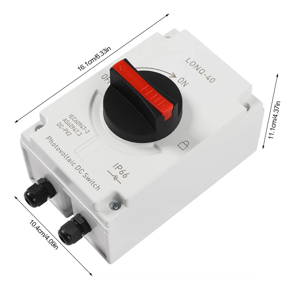 🧡🧡🧡 Welcome to Automaimaimai 🧡🧡🧡 PV Solar Disconnect Switch IP66 Waterproof Photovoltaic Circuit Isolator for Solar Panels 32 Amp DC1200V Description This PV solar disconnect switch is made of insulated, flame-retardant PC and nylon, providing both durability and safety. It is equipped with high-quality upgraded connectors for quick installation. Its powerful DC isolation and excellent protection are ideal for any PV system! Key Features High-quality Materials: The high-quality PC and nylon materials are characterized by good flame retardant, insulation, chemical resistance, drop resistance, aging resistance, and wear resistance, ensuring a long service life. Good Adaptability : After testing, its waterproof grade reaches IP66, the applicable ambient temperature is -40°C to +85°C, and it is also equipped with a silicone waterproof ring, so it can be protected from rain, dust, and other weather factors to adapt any outdoor installation scenario. Circuit Isolation : It is used to quickly disconnect the DC power from the solar panel to the charge controller battery or inverter for the repair, maintenance, installation, and inspection of the system. High Performance : It can cut off the switching current 32A at voltages up to 1500V and it has a load breaking up to 8 times the rated current, meeting the requirements of most PV systems. Arc extinguishing technology is used to effectively suppress arcs, making it safer to use. Easy to Install: Its compact size and complete range of screw fittings make it easy to mount on the wall and take up little space. The ample internal space allows for easy wiring. Independent Poles: With four independent poles, you can use links to change the way the poles are connected. The poles can be connected in series or parallel, or as a variant of series and parallel to determine the load on and off the switch. User-friendly Design: The upgraded connector allows direct wiring without opening the cover, making it faster and safer. It is also equipped with 8 spare connectors for replacement and wire end connectors. Customer Service: We aim to provide quality products and services. If you have any problems, please feel free to contact us. We will reply and solve the problem for you as soon as possible. Details Safety Lock: The safety lock locks the handle in the "off" position to prevent misuse or tampering. The safety lock can be installed by simply pushing out the red part of the handle. Comfortable Handle: The ergonomic handle rotates flexibly for comfortable and effortless operation. Application It is widely used in domestic, RV, oil, metallurgical, and off-grid solar systems, grid-connected solar systems, DC power systems, marine power systems, solar PV systems, or other DC systems. Specifications Material: PC, Nylon Color: White Model: LONQ-40 Product Category: DC-PV2 Poles: 4P Mounting Type: Panel Mount Switch Type: Rotary Switch, Temperature Switch Rated Voltage: 1000-1200VDC Rated Current: 32A Waterproof Rating: IP66 Rated Impulse Withstand Voltage Uimp: 8kV Drop Resistance: 1000/1700 Standard: IEC60947-3, GB/T14048.3 Ambient Temperature: -40°C-+85°C/-40°F-+185°C Insulation Voltage: DC 1500V Connection Type: M20 MC4 Connectors Product Size: 10.4*16.1*11.1cm/4.09*6.33*4.37in Packing Size: 26*11*12cm/10.23*4.33*4.72in Gross Weight: 0.95kg/2.09lbs Net Weight: 0.86kg/1.89lbs Package Included 1* PV Solar Disconnect Switch 4* Expansion Tubes 4* Mounting Screws 8* Cores 8* Upgraded Connectorss 1* Passcode Lock 1* Mounting Wrench 1* English User Manual Notes 1. Please ensure that all electrical connections as well as screws are tightened. 2. We recommend using crimp sleeves for DC multi-strand cables to ensure that the wires do not come loose. Loose cables can cause excessive power loss and generate overheating, leading to serious damage to the switch. 3. Turn the switch on and off several times before use to ensure that a positive snap action can be felt and heard. 4. When used for electrical maintenance and installation, it is important to ensure that the operator holds electrician qualification and takes necessary power off and insulation protection measures. 5. Please read the manual completely before installation and use, and pay particular attention to the safety instructions included. 6. Please allow the slight color difference caused by the shooting light and 1-3cm error due to manual measurement, and make sure you do not mind before you order Payment Delivery details Terms of sales About us Contact us Payment We accept ebay payment 。 Fees such as import duties, taxes are not included in the item price or shipping costs. These charges are the buyer's responsibility. Delivery details Shipping: 2-9 working days to: USA Terms of sales We maintain high standards of excellence and strive for hundred percent customer satisfaction. Feedback is very important to us. We hope that you contact us immediately before you give neutral or negative feedback, so that we can address your concerns. It is impossible to address issues if we do not know about them! About us Your satis faction is our ultimate goal. We work hard to earn your trust and future business. Our certified technicians have tested each item before shipping. The unit comes with 1 year limited warranty on all manufacturing defects. a) If you receive a defective item, you may return it or ask for a discount. Please contact us within 14 days after you receive the package. b) What you returned must be intact and in its original packaging as re? u. Customer is responsible for shipping costs of the returned item. c) We will cover the cost of shipping back t with the shipping rate indicated in the registration page. We will send you a new unit or refund the full payment you paid. Thank you. Contact us Business Hour Business Hour: Monday To Friday: 8:30 AM to 5:00 PM (Beijing China time) Due to time zones, our reply to your questions may not be immediately. But within above working time, we