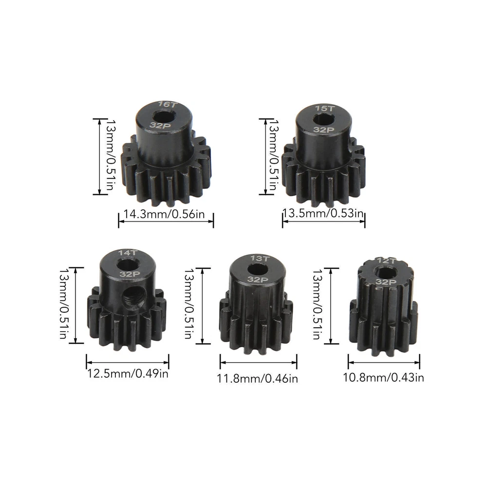 Feature: 1. High Strength: The pinion gear is made of high accuracy chrome molybdenum alloy steel with heat treatment process, and it has super hardness and wear proof, corrosion proof, and long service life. 2. Applicable Model: The exterior of the pinion gear is rust proofed and is an ideal replacement for old or damaged parts for 1/10 RC model car 3.175mm shaft motors. 3. 5 Pinion Gears: Provides 5 pinion gears of 12T 13T 14T 15T 16T, giving you more choices in gear ratio and making your RC car perform better. 4. Stable Performance: Compared with other pinions, our pinions have better machinability, low roughness and low noise, making them roll smoothly. 5. Easy To Install: Exquisite processing makes the gears roll smoothly. Comes with fixing screw holes, easy to install and operate, with machine screws in the package. Specification: Item Type: RC Motor Pinion Gear Material: Chrome Molybdenum Alloy Steel Product Color: Black Gross Weight: 38g / 1.3oz Number of Teeth: 12T 13T 14T 15T 16T Gear Pitch: 32DP / 0.8M Center Aperture: 3.175mm / 0.13in 12T Size: 10.8x13mm / 0.43x0.51in 13T Size: 11.8x13mm / 0.46x0.51in 14T Size: 12.5x13mm / 0.49x0.51in 15T Size: 13.5x13mm /0.53 x0.51in 16T Size: 14.3x13mm / 0.56x0.51in Applicable Model: Suitable for 1/10 RC model car 3.175mm shaft, for Traxxas, for Arrma Package List: 5 x Motor Pinion Gear 5 x Machine Screw 1 x Wrench Note: 1. Due to manual measurement, 1‑3mm error is allowed, thank you! 2. Due to the difference between different monitors, the picture may not reflect the actual color of the item. All the items will be dispatched within one business day by Airmail after the payment is clear. Most times you will receive your order within 10-30 business days after we transfer your package to the delivery company. We cannot guarantee the delivery timeframe if the post office has any unexpected delays due to holiday,weather,customs, or other conditions. Some countries like Russia, Brazil, or some European countries may take up to 50 days or longer for delivery. We appreciate your patience if you haven't received items in 30 days(Russian customers may need more patience by reason of the local delivery system and/or customs). If you are concerned in any way, please feel free to contact us via ebay message instead of leaving negative/neutral feedback or opening a dispute . We will do our best to solve any problem(resend or refund any missingitem). Customs duty is obligation and liability of citizens in yourresponsible for any tax and custom duty incurred. Generally, thedelay or failure delivery is sometimes caused by the policy of different customs. Our listing price includes the value of goods,packaging cost,and export taxes,not including international duties. duties,taxes,and charges are not included in the item price or shipping fee. The duties are buyers' responsibility. Please check with your country's customs office determine what these additional costs will be prior to your purchase. All disputes arising from the duties will be submitted to ebay for solution. Any questions, pls. contact us via ebay message or email us. We will reply your message within 48 hours. If you do not receive our reply within 48 hours, pls. post a message again because sometimes our message system may block some emails. If you are satisfied with our service, pls. kindly leave us a positive feedback and give us the Detailed Seller Rating with all " 5 " in very area. Our aim is to provide Level Customer Service, your recognition will encourage us greatly and serve you better. We strive to keep all our customers satisfy. We will do our up most to exceed your expectations in customer service, communication and dispatching of your orders.
