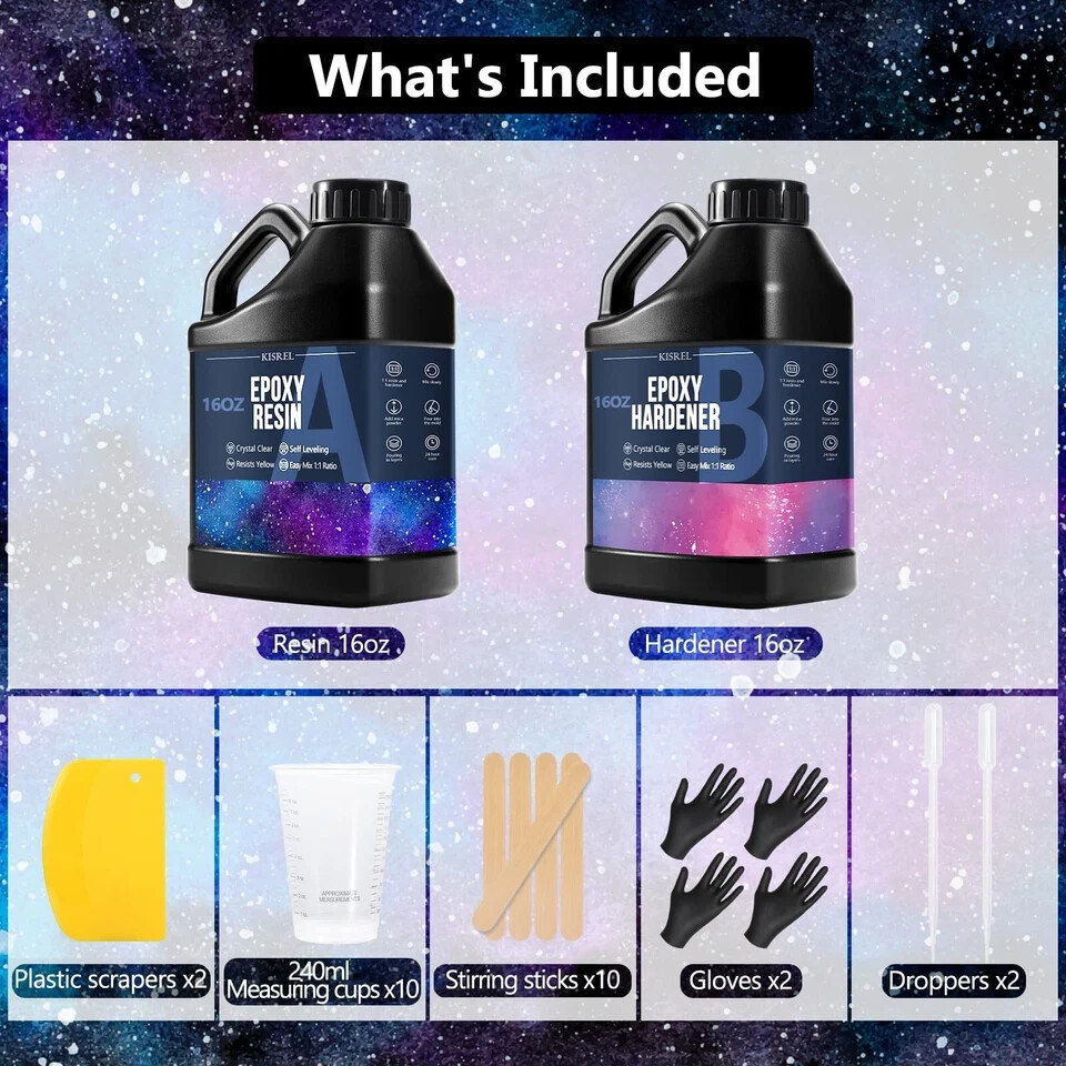 About this item 【Perfect Epoxy Resin Kit】:Includes 16OZ clear resin, 16OZ clear hardener, 10 x 240ml measuring cups, 2 x plastic spatulas, 10 x wooden stirring sticks, 2 x gloves, 2 x droppers. Everything you need to start your project is included, perfect for experienced people and beginners. 【High Quality Resin Epoxy】:Crystal clear, easy to mix, less bubbles and self defoaming self-leveling function, safe and non-toxic, filler does not settle after mixing, easy to complete perfect works without worry. 【Perfect Works】:Glossy surface after the table top epoxy resin is cured, perfect texture, no yellowing and high temperature resistance, wear-resistant and durable, ideal for projects such as desktop coating. 【Easy to Use】:Epoxy resin 1:1 easy to mix, 8 hours drying 24 hours curing, resin heat dissipation temperature is not high will not damage the mold, easy to use very suitable. 【Wide Range of Applications】:Ideal for casting, coating, artwork, suitable for coasters, countertops, crafts, jewelry making, painting, molds, woodwork, etc. Create your great works.