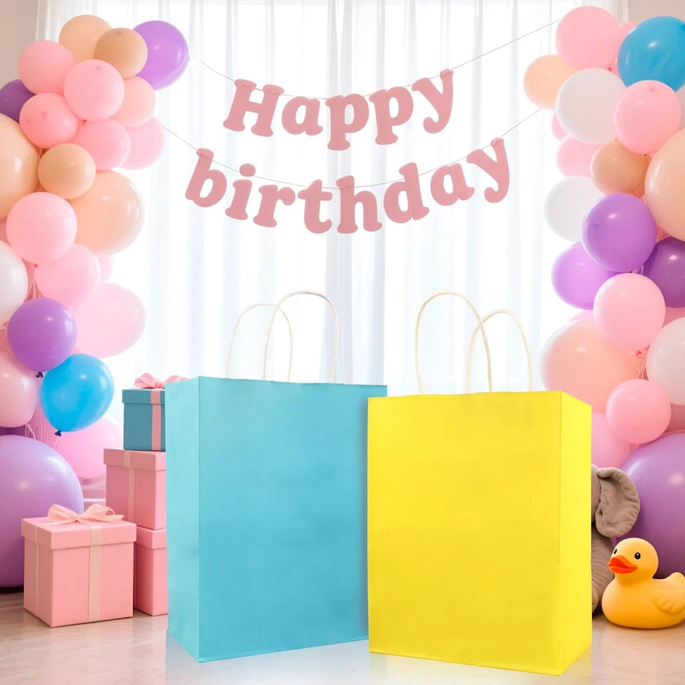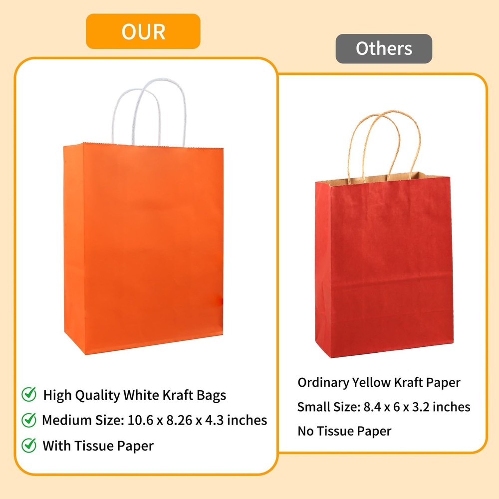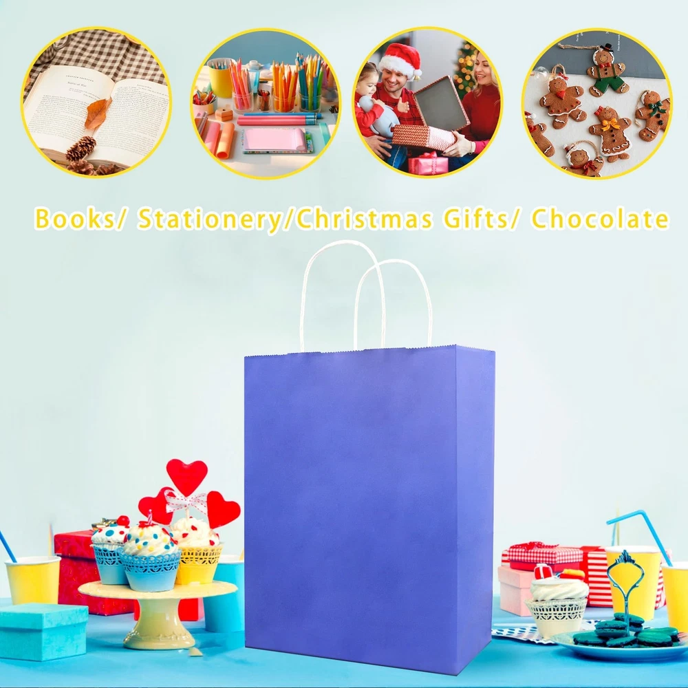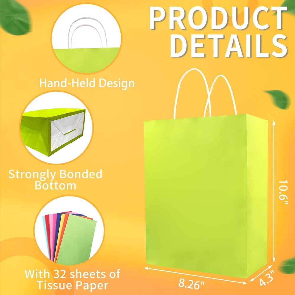 goodie bags are handmade with high-quality kraft paper and fine workmanship. Ideal for use as party favor bags, comes with the same color and corresponding amount of colored tissue paper for gift bags 32-pack gift bag 8 colors, 4 pcs each color, medium kraft paper bags with handles for birthday, daily use, with tissue paper, comes with the same color and corresponding amount of colored tissue paper Each pack bulk gift bags contains: Yellow/ Orange/ Red/ Light Purple/ Royal Blue/ Blue/ Green/ Light Pink 8 Different Colors and 32 PCS Tissue paper Material: High-Quality White Kraft Paper Medium Size: 10.6" H x 8.26" L x 4.3" D Kraft Gift Bags Medium Size: 32 pieces of kraft gift bags with handles, sufficient quantity, and 8 different colors of goody bags can meet your daily and holiday party needs and be used to hold gifts for family and friends. This gift wrap is firmly bonded, can hold up to 8lb of holiday/ birthday/ daily/ wedding gifts Suitable Size: These gift bags bulk with tissue paper measure about 10.6 x 8.26 x 4.3 inches, suitable for creating party decorations. They are ideal for holding lots of gifts like candy, small toys, chocolates, notebooks, etc. Catching the attention of your guests, giving them a nice holiday experience, and creating a wonderful atmosphere Quality Material: The bulk gift bags come with handles that are more labor-saving; These kraft gift bags are made of 120g quality kraft paper; The material for you to use safely, reliable and sturdy, trusty and lovely; And can be reused for many times, creating a happy atmosphere for holiday or birthday party or wedding Exquisite Design: These paper gift bags are designed in a style that perfectly fits into the holiday atmosphere. They contain Yellow/ Orange/ Red/ Light Purple/ Royal Blue/ Blue/ Green/ Light Pink 8 Color, making the whole bag look more eye-catching, and great for daily gift giving Kraft Gift Bags Usage: This medium gift bags with tissue paper is a beautiful and practical way to carry all your candy, ornaments, and holiday party favors for any season. They are ideal for wrapping gifts at Christmas parties, family gatherings, gift exchanges, wedding gifts, and holiday celebrations. The exquisite design of the gift bags medium size can attract attention among many other gifts