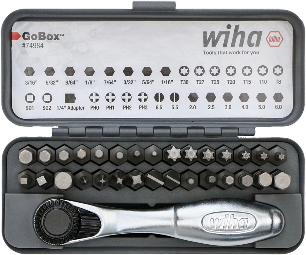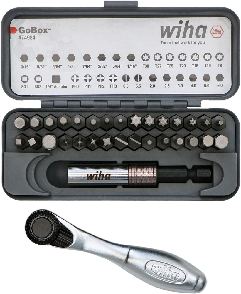Steel Set Includes: Phillips #0, #1, #2, #3 | Slotted 5.5, 6.5mm | Square #1, #2 | Torx T8, T10, T15, T20, T25, T27, T30 | Hex Metric 2.0, 2.5, 3.0, 4.0, 5.0, 6.0mm | Hex Inch 1/16, 5/64, 3/32, 7/64, 1/8, 9/64. 5/32, 3/16" Standard 1/4" Hex to 1/4" Square drive for universal application 72 tooth ratchet system with 5° arc swing for smooth ratcheting in tight spaces Conveniently stored in a pocket-sized metal case for easy storage and security Computer-controlled heat treatment for a new standard in bit performance Exact fit precision machined tips for reduced cam-out Fast action thumb lever for quick rotation change CVM premium quality tool steel for strength and durability Bit Holder 1/4" x 2.625" Bit Ratchet 1/4” x 3.5"/90mm 32 PC Standard Bit Set in Box Items In Set More Details Wiha 32 Piece Standard Bit GoBox features a collection of 1-Inch impact-rated bits in a wide variety of tip profiles including phillips, slotted, square, torx, hex-Inch, hex-metric, and a 1/4-Inch Hex to 1/4-Inch square drive adapter. Wiha standard bit box comes with a smooth-turning 72-tooth reversible mini-ratchet that can access tight spaces other tools can't. The mini-ratchet accepts 1/4-inch hex drive bits, 1/4-inch sockets with the included hex-to-square drive adapter, and a 1/4-inch drive locking magnetic bit holder. The standard Wiha bit GoBox comes with a custom-fit molded tray for easy organization and a pocket-sized metal case for secure and convenient transport in any scenario. With Wiha standard bits you get the tightest-fit precision driver tips from the company that is the standard for precision in the industry. Wiha's exact-fit tips eliminate excessive bit-wobble resulting in a highly stable engagement with the screw head, reducing fastener cam-out that can lead to injury or damage to finished materials. Set Includes: Phillips #0, #1, #2, #3 | Slotted 5.5, 6.5mm | Square #1, #2 | Torx T8, T10, T15, T20, T25, T27, T30 | Hex Metric 2.0, 2.5, 3.0, 4.0, 5.0, 6.0mm | Hex Inch 1/16, 5/64, 3/32, 7/64, 1/8, 9/64. 5/32, 3/16" Standard 1/4" Hex to 1/4" Square drive for universal application 72 tooth ratchet system with 5° arc swing for smooth ratcheting in tight spaces Conveniently stored in a pocket-sized metal case for easy storage and security Computer-controlled heat treatment for a new standard in bit performance Exact fit precision machined tips for reduced cam-out Fast action thumb lever for quick rotation change CVM premium quality tool steel for strength and durability Bit Holder 1/4" x 2.625" Bit Ratchet 1/4” x 3.5"/90mm