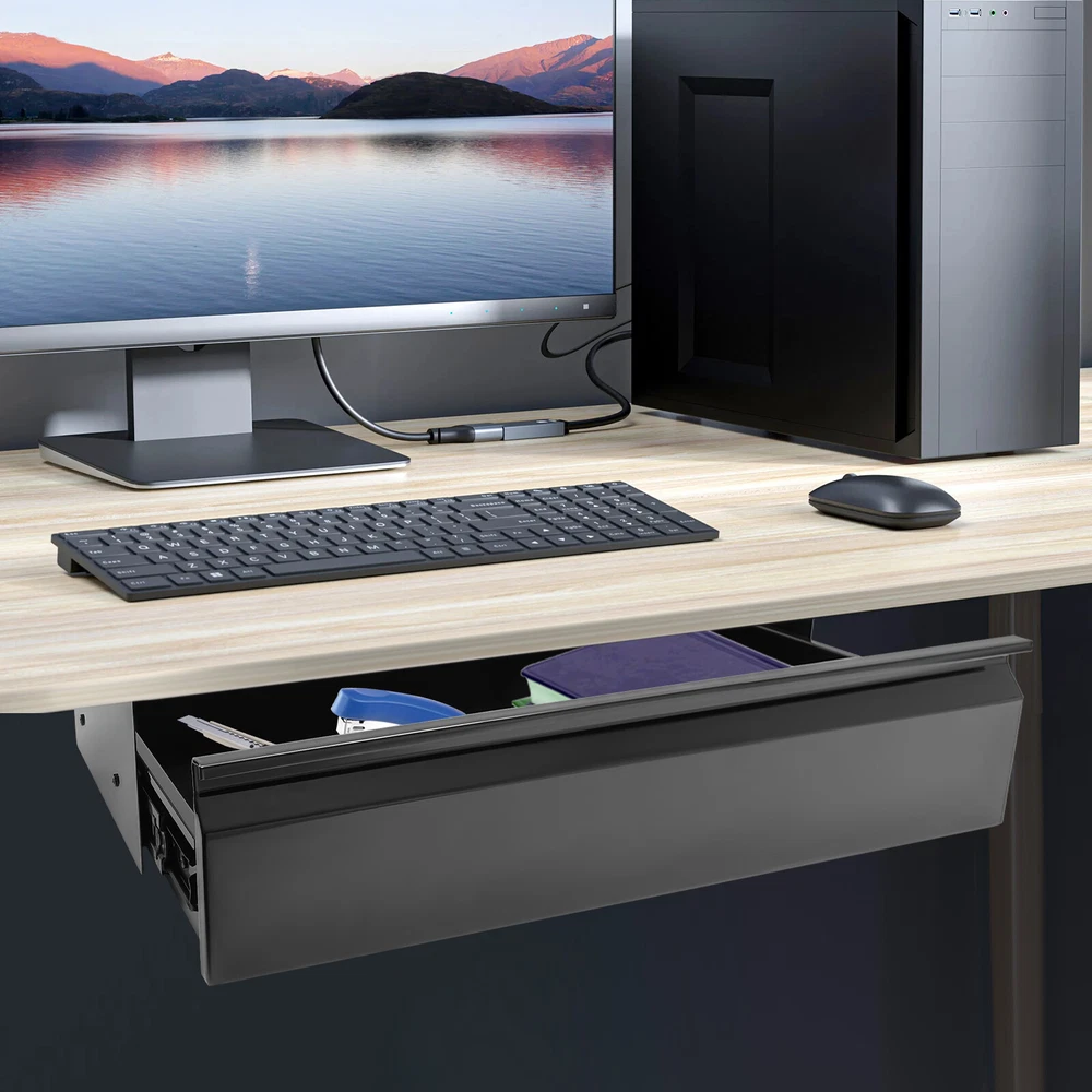 33?? Black Space Saver Sliding Under Desk Storage Drawer Pull-out Drawer Welcome Under Desk Mounted Sliding Pull-out Drawer, Storage Organizer for Sit Stand Workstation, Pull-out Drawer Description Even with limited desktop space, our sliding pull-out drawer makes full use of space in the name of magic, without losing order and aesthetics. The slide design allows for silent pull-outs, creating an unrivaled experience for you . Buy it quickly and enjoy a more convenient life. Key Features Sturdy and Durable: It is made of high-quality iron with a plastic spraying process, which is non-toxic, odorless, anti-corrosion, and rust-resistant , ensuring its beauty and long-term use. Excellent Organizer: You can put your mouse, charger, sticky notes, etc. in it, and can be used at hand, bringing convenience and keeping your desktop tidy at the same time! Maximize Your Desk Space: You can hide it under the table, and it does not take up space in your space and can store a variety of items so that your desktop is not messy. Thoughtful Design: You can retrieve your materials quickly and quietly with its smooth sliding mechanism. Simple Installation: With complete accessories and simple structure, you can put it all together yourself and put it to use right away! Easy to Clean: Thanks to its simple construction and smooth surface, you can wipe the stains off its surface with a damp rag. Ideal Gift: Thanks to its practicality and beauty, you can give it to your friends as a Christmas or housewarming gift! Protective Package: We use bubble bags and sponges to package this product to minimize damage to the product during shipping. Details Rounded Corners: The rounded edges are burr-free , which is comfortable to touch a nd can care for your skin. Recessed Handle: It makes it easy for you to pull out or in the drawer. Pre-drilled Holes: They can help you install the product more easily. Application It is used to install under the table and can store various items, such as a keyboard, mouse, books, iPad, phone, pen, pencil, glue, eraser, adapter, earphone, cutlery, cosmetics, or other small items used regularly. It is designed to fit both standing desks and standard fixed-height workstations. Specification Material: Iron Process: Plastic Spraying Color: Black Shape: Rectangular Assembly Required: Yes Mount Type: Under Table Mount Applicable Table Thickness: 20mm/0.79in Product Outer Size: 84.5*23.36cm/33.3*9.2in Product Inner Size: 76.45*22.86*6.1cm/30.1*9*2.4in Package Size: 84*25.5*6cm/33.07*10.04*2.36in Load Capacity: 2kg/4.4lbs Net Weight: 3.5kg/7.72lbs Gross Weight: 4kg/8.82lbs Package Included 1* Sliding Pull-out Drawer 1* Chinese Accessory List All Accessories for Assembly Notes Please check that the desktop type is appropriate before purchasing. It is not suitable for desk with lips and rough surface. Please note that this product does not contain any other items shown in the picture. Please ensure that your desk can support the total weight of the drawer and load capacity. Please allow the slight color difference caused by the shooting light and 1-3cm error due to manual measurement and make sure you do not mind before ordering. Payment Delivery details Terms of sales About us Contact us Payment We accept ebay payment 。 Fees such as import duties, taxes are not included in the item price or shipping costs. These charges are the buyer's responsibility. Delivery details Shipping: 2-9 working days to: USA Terms of sales We maintain high standards of excellence and strive for hundred percent customer satisfaction. Feedback is very important to us. We hope that you contact us immediately before you give neutral or negative feedback, so that we can address your concerns. It is impossible to address issues if we do not know about them! About us Your satis faction is our ultimate goal. We work hard to earn your trust and future business. Our certified technicians have tested each item before shipping. The unit comes with 1 year limited warranty on all manufacturing defects. a) If you receive a defective item, you may return it or ask for a discount. Please contact us within 14 days after you receive the package. b) What you returned must be intact and in its original packaging as re? u. Customer is responsible for shipping costs of the returned item. c) We will cover the cost of shipping back t with the shipping rate indicated in the registration page. We will send you a new unit or refund the full payment you paid. Thank you. Contact us Business Hour Business Hour: Monday To Friday: 8:30 AM to 5:00 PM (Beijing China time) Due to time zones, our reply to your questions may not be immediately. But within above working time, we will reply your email within 24 hours. If it's non-workdays, please kindly be patient and wait till Monday. Please contact us with ebay message. Please feel free to contact us if you have any questions. Monday To Friday: 8:30 AM to 5:00 PM (Beijing China time) Due to time zones, our reply to your questions may not be immediately. But within above working time, we will reply your email within 24 hours. If it's non-workdays, please kindly be patient and wait till Monday. Please contact us with ebay message. Please feel free to contact us if you have any questions. Feature! Stable performance, durable Warranty 10 years Manufacturer Warranty 4 Years Feature * Durable Material,Good quality Brand Unbranded Type Sliding Pull-out Drawer Material Iron MPN Does not apply Process Plastic Spraying Gross Weight 4kg/8.82lbs Color Black Shape Rectangular Assembly Required Yes Mount Type Under Table Mount Applicable Table Thickness 20mm/0.79in Product Outer Size 84.5*23.36cm/33.3*9.2in Product Inner Size 76.45*22.86*6.1cm/30.1*9*2.4in Package Size 84*25.5*6cm/33.07*10.04*2.36in Load Capacity 2kg/4.4lbs Net Weight 3.5kg/7.72lbs