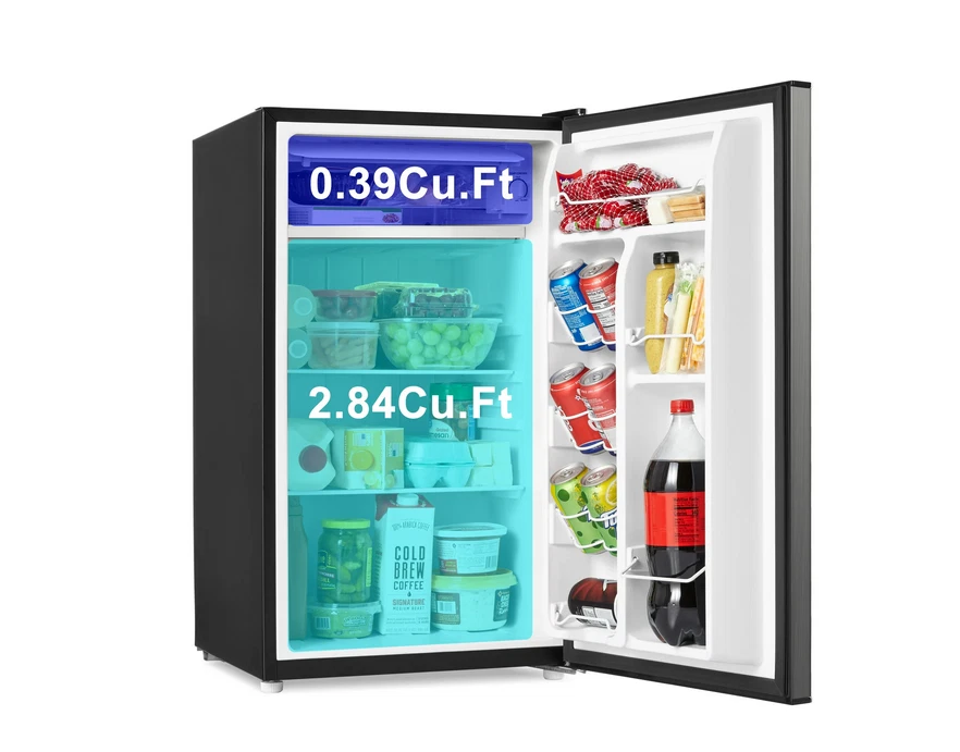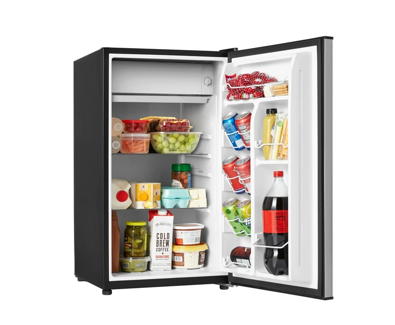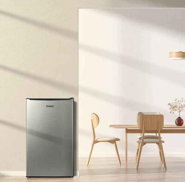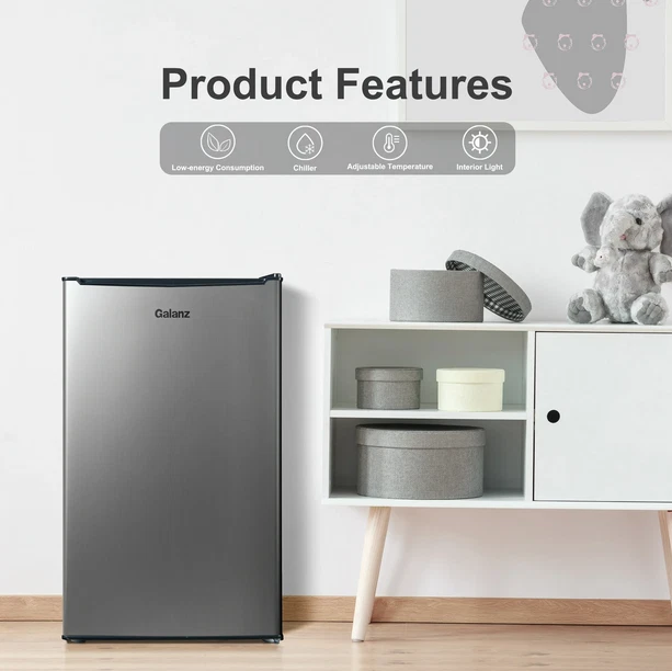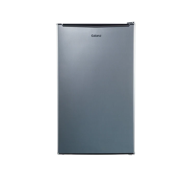 About this item Product details Enjoy the convenience of having your favorite chilled food, drinks, or snacks whenever you want with the Galanz 3.3 Cu ft One Door Mini Fridge in stainless steel look. The Galanz 3.3 cu ft One Door Mini Fridge is an ideal size for the dorm room, game room, exercise room, office, garage, bedroom, or any other living space. The Galanz 3.3 Cu ft One Door Mini Fridge features a full-width freezer compartment . The convenient reversible door allows you to choose to open from the left or right side making the Galanz 3.3 Cu ft One Door Mini Fridge suitable for any layout. Condition: New, Stock Number: GLR33MS1E02 3.3 Cu ft Capacity Stainless Steel Look Estar Certified Low Energy Consumption Reversible Door 2 Adjustable Leveling Legs Temperature Control Dial Adjustable Mechanical Thermostat Control 2 Liter Bottle Door Storage 7 Can dispenser 1 Full Slide Out Glass Shelf Reversible Door Condition: New Stock Number: GLR33MS1E02 Specifications Power Type Electric Volts 120 V Brand Galanz Model VIPRB-GLR33MS1E02
