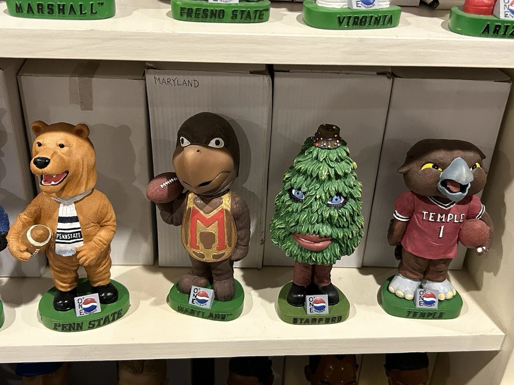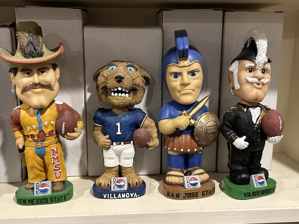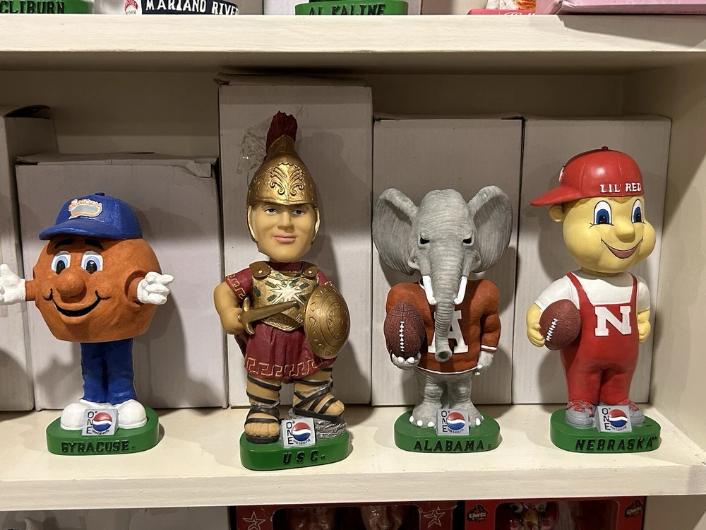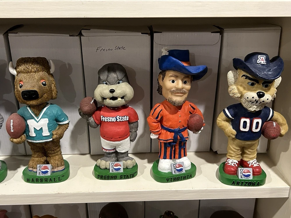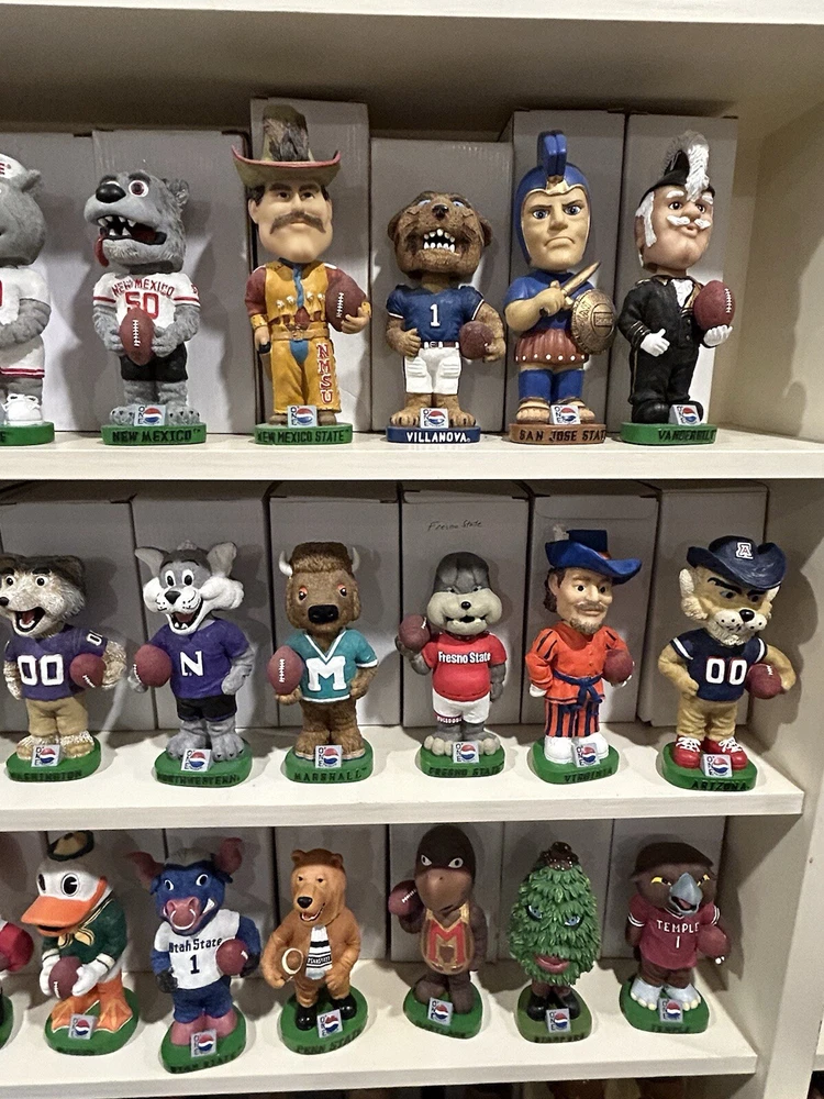 (33) PEPSI ONE NCAA College Mascot Complete Bobblehead Set with Boxes Please view images these are all in Near Mint Mint condition with the boxes. This collection took me 3 years to complete and is very hard to replicate. Any questions please message me. Professionally packaged WITH CARE for shipment PLEASE VIEW ALL MY BOBBLEHEADS ITS TIME TO SELL. I WILL BE LISTING OVER 800 FROM 2000-2003 ERA PLEASE VIEW DETAILED PICTURES THIS IS THE EXACT BOBBLEHEAD AND ORIGINAL BOX YOU WILL RECEIVE. SELLING AS IS NO RETURNS I have had this since it was released stored in my Bobblehead cabinet in beautiful condition. It hasn't been touched in over 20+ years until I took the pictures to list it. ANY QUESTIONS PLEASE MESSAGE ME