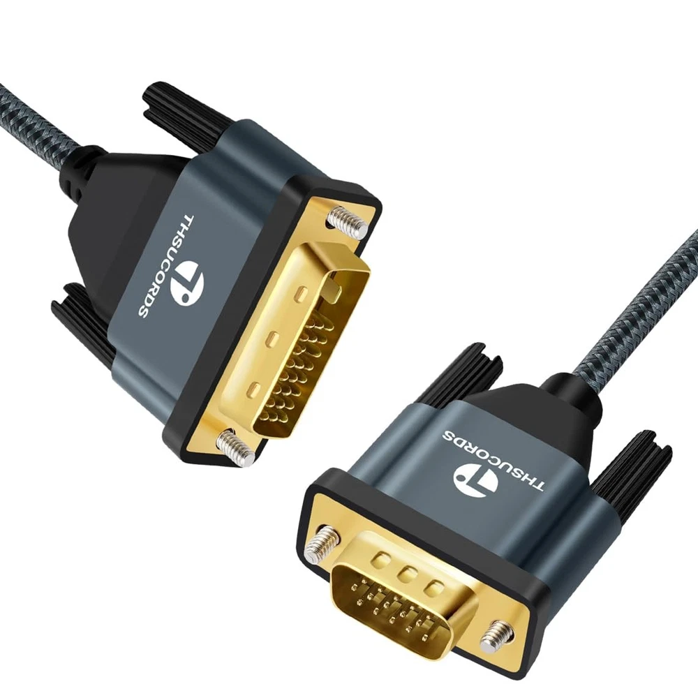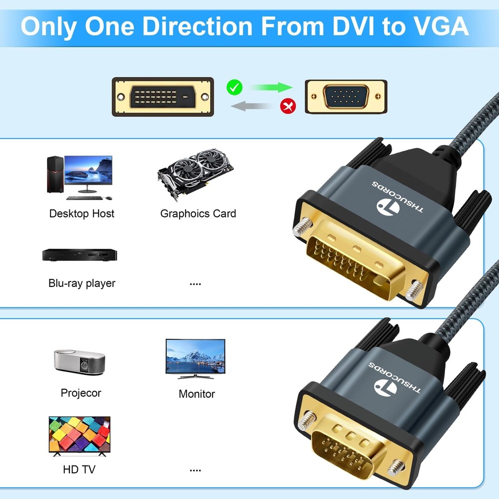 The DVI to VGA cable is composed of high-purity oxygen free copper and gold-plated interfaces, as well as nylon wrapping, which is durable and has strong stability for transmitting video bottles. This is a unidirectional cable and does not support audio transmission. Our cables also have high resolution. Supported PC resolutions: 800x600, 1024x768, 1280x768, 1280x800, 1280x960, 1280x1024, 1440x900, 1600x1200, 1680x1050@60Hz , 1920x1080@60Hz , 1920x1200@60Hz, Supported HDTV resolutions: 480i, 576i, 480p, 576p, 1080i, and 1080p @60Hz. Also applicable to laptops, computers, PC mainframes, graphics to HDTVs, LG/HP/DELL monitors, displays, monitors, and projectors. 【Uni-Directional DVI to VGA Adapter 3.3FT】The DVI 24+1 to VGA cable can output DVI from a desktop computer to a VGA monitor or projector. Note that this signal transmission is unidirectional and cannot be transmitted from the VGA to DVI port. 【Stable and Durable Cable】Our cables are composed of high-purity oxygen free copper, with metal plated interfaces and nylon braided wrapped cables, which have strong stability and durability, and signal transmission is not easily affected by external interference. 【High Resolution Video Transmission】The DVI-D to VGA adapter supports resolutions up to 1080P@60Hz and PC graphics resolutions up to 1920 x 1200 @60Hz, Note that only video transmission is supported and audio transmission is not supported. 【Wide Compatibility】DVI to VGA is widely used in everything from computer consoles, laptops, graphics cards to monitors, projectors, HDTVs, and other digital devices. Plug and play, without the need for any external devices for assistance. 【Product After-Sales Service】Our product warranty period is one year. If you have any problems with the product during this year, please feel free to contact us and we will solve it for you. If you have any inquiries about our product, please feel free to contact us at any time.