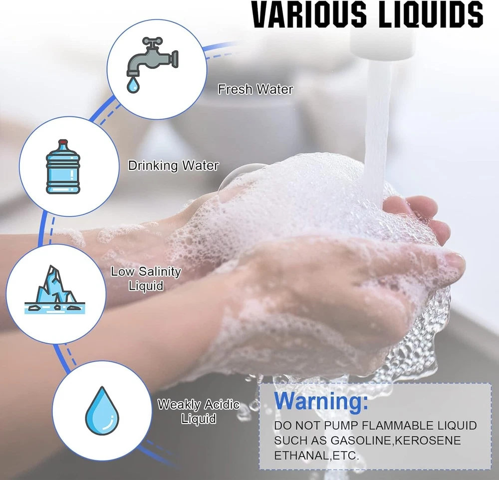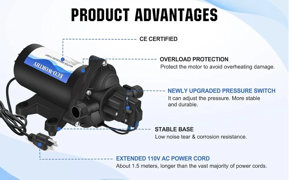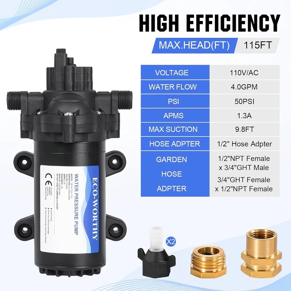 33-Series Industrial Water Pressure Pump 110V AC 50PSI RV Fresh Water Diaphragm Pump include Garden Hose Adapters for Irrigation Marine Boat Sprinkler Faucet Diaphragm Pump: 110V AC water diaphragm pump provides flow capacity. Turns on and off using water pressure at 50PSI, Max amps. AC power supply, no need to carry marine battery with you Smart Pressure Switch: Turns on and off on demand. It’s quiet, shuts itself off when the faucets are closed and runs when the faucets are opened. It also can adjust according to your needs, adjustable pressure range is 45-70PSI Reliable Performance: Self-Priming up to vertical feet, lift up to 148 feet. Thermal overload protection is built into the water pump to make it safe to use. When the temperature is above 70℃/ 158℉, it will automatically disconnect the circuit to protect the motor Multipurpose: The nemesis of low water pressure. Support continuous operation for more than 1 hour. The water transfer pump is suitable for many fields, like RV, Marine, Boat, Irrigation, Sprinkler, Faucet and so on Your First Choice: We always pay attention to customer shopping experience. If you have any doubts, you can always talk to us through the order form. We will always be here