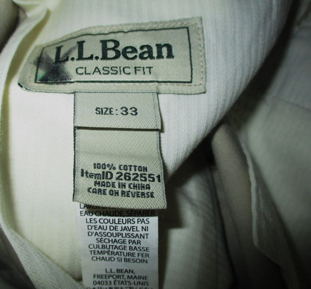 See my EBAY STORE at “SAMTPC53” to view 100’s more of my Men's Pants!!! Combine Shipping: (on multiple items you pay full price on heaviest item first and then HALF PRICE shipping on ALL other items. Men's Khaki Chino Pants. Brand: L.L. BEAN. Description: men's 100% cotton L.L. BEAN khaki chino pants, flat front and no cuffs, zipper and button on front, belt loops, small waist pocket on front, 2 front side pockets, 2 rear pockets, see pics. Color: Khaki Tan. Size: 33W, 26L (please see measurements). Measurements: 33" waist, 26" inseam, 11" rise. Material: 100% Cotton. Condition: Excellent condition, NWOT.