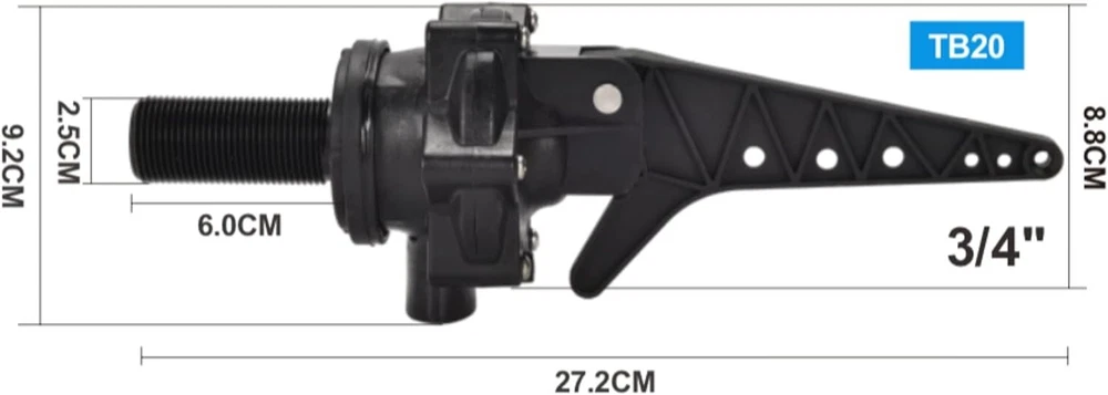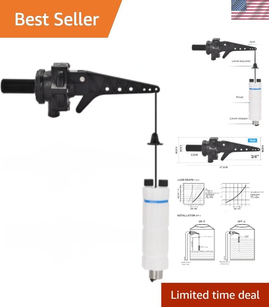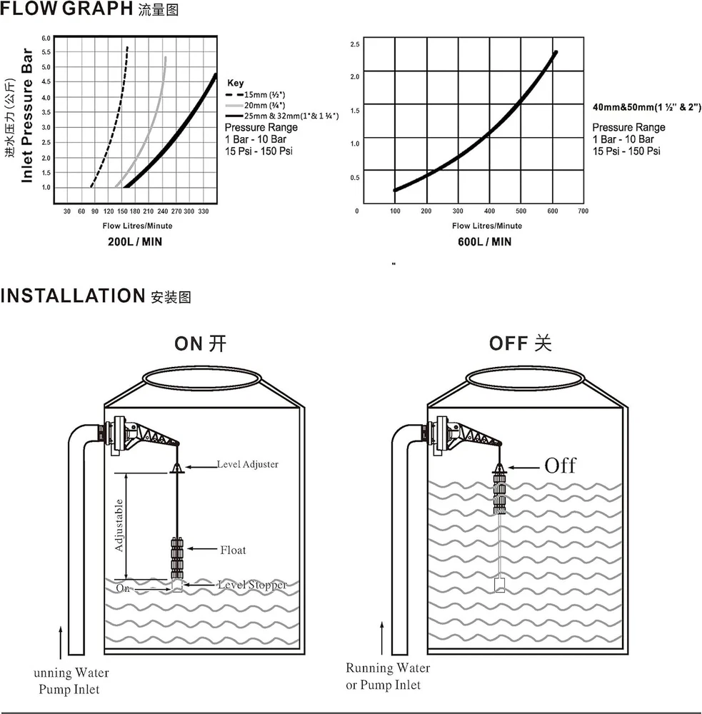 3/4" Tankbuddy Valve PumpBuddy High Flow Large Water Discharge 20mm Float Valve Double Water Level and Adjustable Water Level TANKBUDDY VALVE is patented product, It is ideal for water tanks which are filled by running water or a pressure system controlled by water pump. The valve gives a level difference which is adjustable from 50mm up to to minimise starting and stopping of running water or the pump system(Level difference accept Customization). 2.APPLICATION:water tank、water tower、water pool、Irrigation、 animaldrinking、Sprayequipment、swimmingpool etc. PRINCIPLE:It fits easily through a thin walled tank or screws into a threaded tank the tank empties,the float travels down the cord until it hits the level valve then opens immediately to give a full we discharge te water, the valve now runs constantly and the float rises until it hits the level adjuster. This lifts the arm and the valve shuts down. 4.ADVANTAGE:High flow, Start and stop levels can be easily adjusted to give water level differentials from 50mm to m, Keeps pump operation to a minimum, Valve Seal Access System for quick access to valve seal, Ideal for all makes and models of tanks, Available inlet sizes. 5.Instruction is included in the package. You can install and use it according to the instruction. If you have any after-sales questions, please feel free to contact me. Installation Instructions 1. Flush Debris from pipelines thoroughly before fitting 2. Ensure valve is mounted horizontally in tank with outlet pointing down 3. Use thread seal tape on Inlet thread 4. Inject water into floats up to water line 5. Set level stopper at desired approximate lower on position and tie off cord at end of arm. (Use double hole end loop system for easy adjustment and tie off) 6. Ensure float is in correct position between stops 7. Set adjustable level adjuster for desired off position 8. Cut off excess cord to desired length
