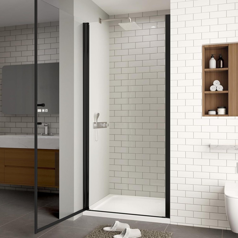34-35.4" W x 72" H Frameless Pivot Shower Door, 1/4" (6mm) Clear SGCC Tempered Glass Shower Door, Pivot Swing Shower Glass Door in Matte Black Finish, Reversible Installation Item Description About this item Adjustable Sizing: This frameless shower door 34" width and 72" high, the width can be adjusted from 34" to 35 3/8", with a 3/8 inch adjustment at the pivot and 1 inch on the other side, walk-in opening size: 29 19/32 inches. (34-inch shower door fits a 36-inch shower base) Safe and Easy-to-Clean: This pivot shower door is built with 1/4" (6mm) SGCC certified clear tempered glass, ensuring exceptional durability and resistance to pressure and impact. Its smooth surface facilitates effortless cleaning. Magnetic Seal: Our shower door is equipped with a magnetic seal design, providing improved sealing and a smoother, quieter closing experience. This design offers superior water resistance compared to standard seals, effectively separating dry and wet areas and maintaining a dry and clean bathroom. Sturdy and Long-lasting: Our glass shower door is constructed with a premium aluminum frame and a 304 stainless steel handle, both of which are corrosion-resistant and rust-proof. This ensures that your shower door will remain reliable for years to come. Easy Installation: Our pivot swing shower door can be installed on either the left or right side, depending on your needs. The hinges and pivots can be rotated 180 degrees, allowing for easy opening and closing functionality. It comes with detailed installation instructions for your convenience. We recommend professional installation to ensure optimal results. › See more product details Premium stainless steel hardware is resistant to wear and tear, not easy to corrosion, long-lasting. Offers better sealing and a smoother, quieter closing experience than regular water stops. Effectively separating dry and wet areas and maintaining a dry and clean bathroom. The max adjustment range is 3/8 inch and can be adjusted according to the size of your shower space. This design ensures that the shower door can adapt to different sizes of shower rooms, providing more flexible installation options. The max adjustment range is 1 inch and can be adjusted according to the size of your shower space. This design ensures that the shower door can adapt to different sizes of shower rooms, providing more flexible installation options. Payment We accept payment only through PAYPAL Shipping We ship products worldwide through standard express courier service, it will reach within 7 to 10 days to abroad buyers, we ship the product after recieved clear payment and give full information about shipment to the buyer Return We accept product return within 7 to 21 days from delivery date but product should be in original position and not in damaged condition,the return shipping charges will be buyer responsibility