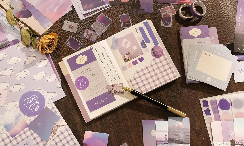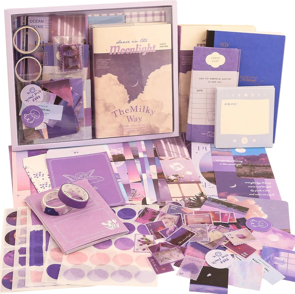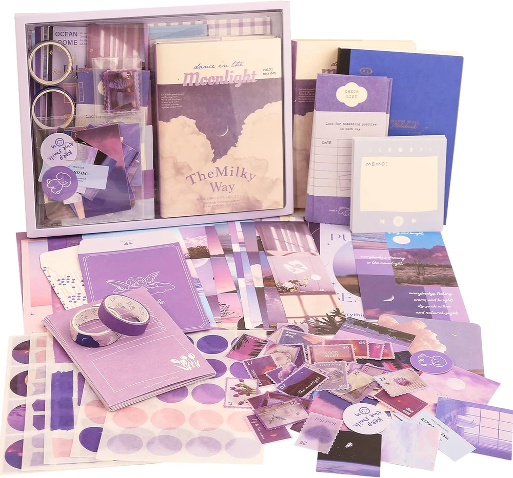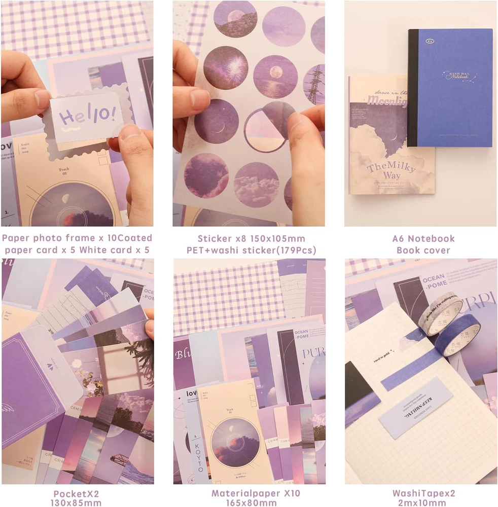 The retro scrapbook paper supplies kit includes 348 sheets. Scrapbooking supplies kit contains:1 A6 grid notebook with vintage poster book cover, 2 washi stickers, 60 note papers, 2 envelopes, 10 scrapbook papers, 10 folding labers, 10 material background papers, 5 card, 10 paper photo frames, 31 calender stickers, 179 stickers and 5 coated paper cards. A large vintage junk journal collection of all kinds of vintage ephemera junk journal goodies! 256 Page A6 grid notebook can carry all your idea, plans, daily, experience. The size of scrapbooking notebook is 5.8" x 4.1", which is convenient for you everywhere and scrapbook. Scrapbooking notebook also highlight important diary and planner just in case you forget it. This scrapbook supplies comes with assorted vintage paper in various designs, their classic prints include plants, flowers, figures, architecture, sky, clouds, moon, ocean, mountain,letter sheet and so on, which look very classic and purple aesthetic scrapbook journal kit, not easy to go out of date, bringing you enjoyment. These different series and sufficient quantity washi paper stickers can meet your daily use and replacement. Scrapbooking supplies kit include:A6 grid notebook with vintage poster book cover, washi/pet sticker, note paper, envelope, scrapbook paper, folding laber, card, paper photo frame, calender stickers, washi tape. the retro journaling paper supplies made of high-grade durable materials. These decorative tapes can be repositioned and torn. Accurate printing, showing clean, bright colors. This set of stickers is perfect for handmade gifts. Decorative masking DIY tapes: perfect for decorating your scrapbook, bullet journals, photo albums, day-planner, diaries, handmade cards, file folders, home decoration, bookmarks, envelopes,wrapping, wall, gifts, decoupage, gift wrapping,postcards, boxes & packages, menus, letters, maps, thank you notes, school projects and much more. Product Description A mixed 348 piece paper, sticker and scrapbook pack with mixed sizes and designs. Fantastic set for creating your junk journal pages, collages, crafting projects, wrapping, cards and books. PRODUCTION INFORMATION A6 Grid Notebook(256page) with vintage poster book cover Washi/PET sticker×8 sheets(179pcs) Note paper×60(3 types*20) Envelope×2(5.1in*3.34in) Scrapbook paper×20(10 sheets:6.5in×3.15, 5 sheets:5.9in×5.9in, 5 sheets:8.34in×6.3in) Folding laber×10(6.6in*1.77in) Card×15 Paper photo frame×5 Calender stickers×31 Washi tape×2(0.4in*78.8in)