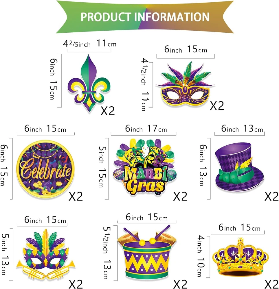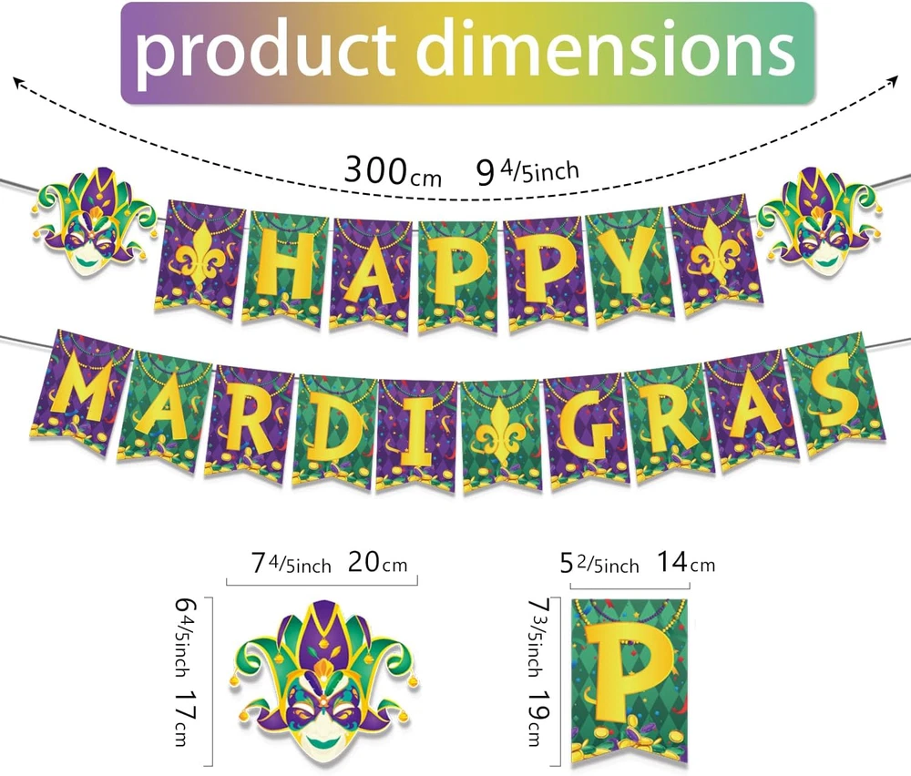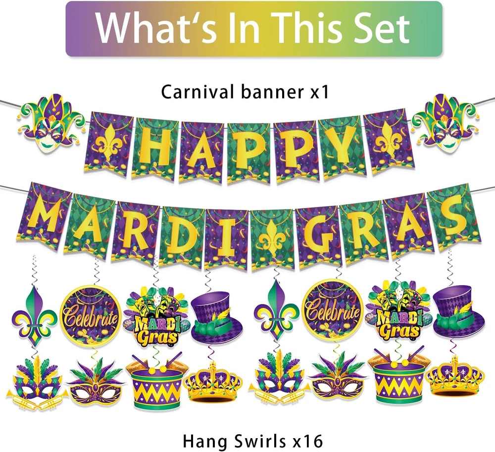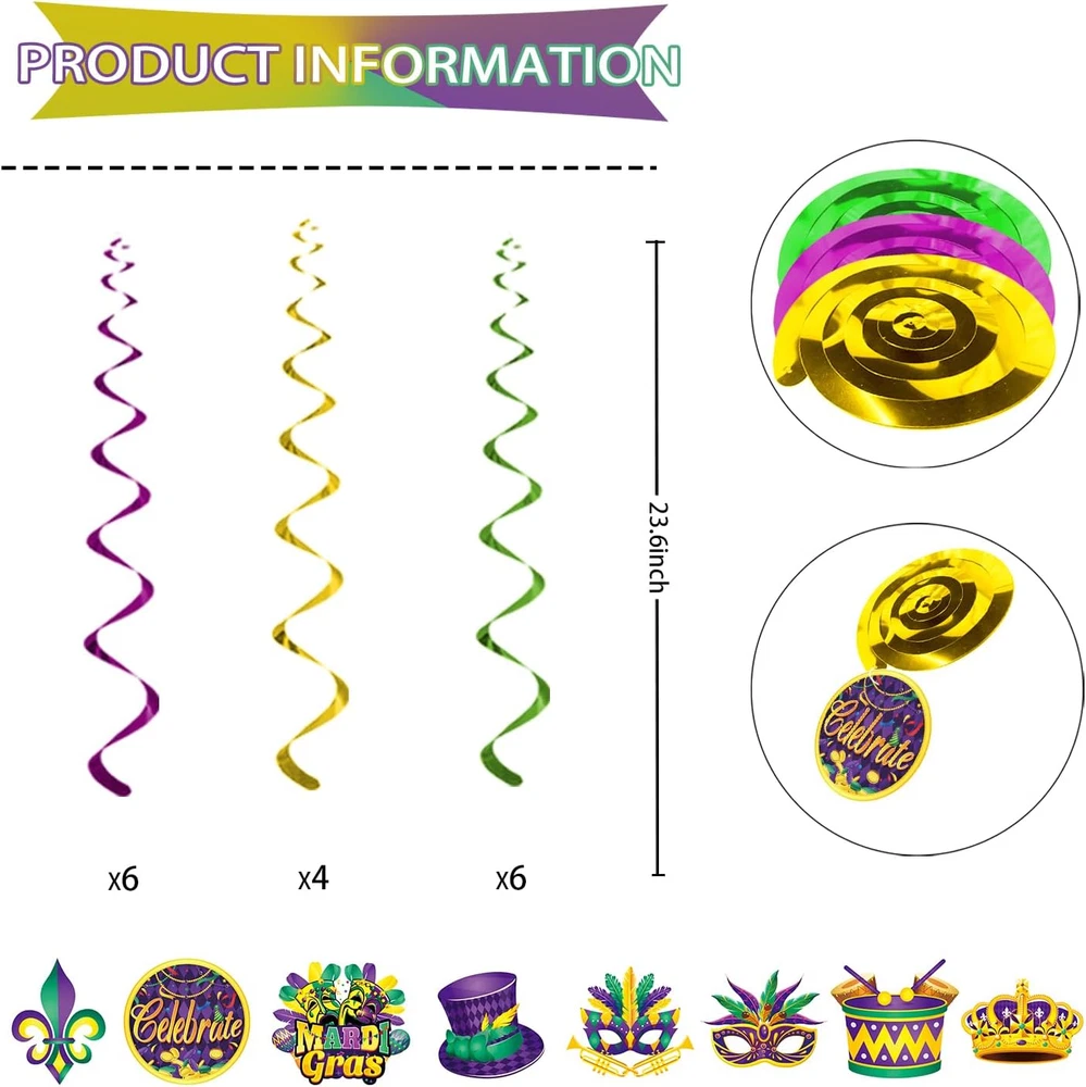 Cartoon Character: Mardi Gras Occasion: Birthday Color: Green, Purple, Gold Item Weight: 3.84 ounces Country of Origin: China Shape: Irregular shape Type: Does not apply Included Components: Birthday Banner, Cutouts, Mardi Gras Decor Hanging Swirls Pattern: Mardi Gras Theme: Mardi Gras Material: Cardstock, Paper Brand: Does not apply