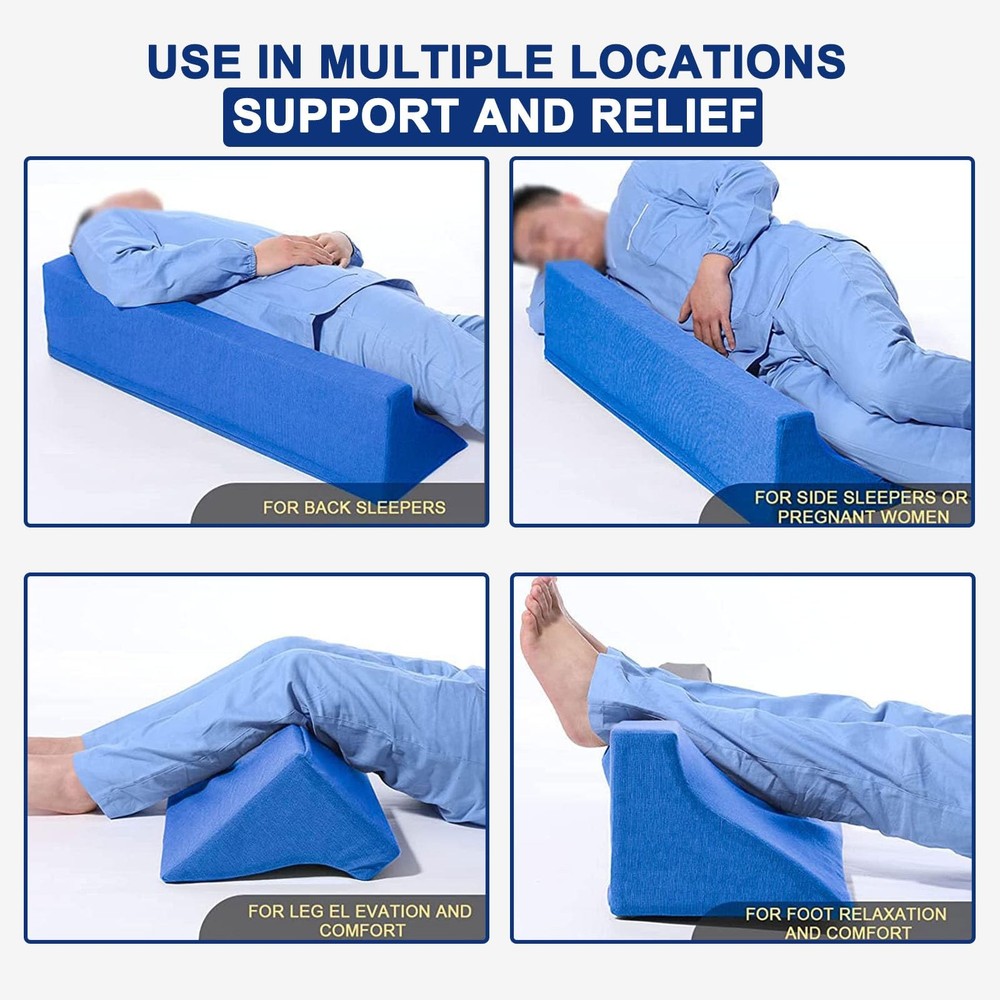 Product Description 1. Use By Multiple People: The elderly, bedridden patients, handicap, lower limb fracture patients, due to surgery those who could not move but stay in bed for rest, pregnant women, use in seating for lumbar,back,legs ,belly support. 2. It can help patients turn over, change their posture, assist leg passive lifting, improve leg blood circulation. 3. At the same time is conducive to supporting pregnant women's belly to create a good environment for pregnant women to sleep. 4. Right angle helps relax your neck, being good for acid reflux, poor circulation, allergies or any other condition which breathing may be impaired in supine position. This is a home care pillow. ▶【34in Lengthened 30° Wedge Pillow 】The unique R-shaped wedge pillow can provide good support and stability for your head, neck and shoulders, helping to maintain a natural body posture. The inclined 30-degree angle can help relieve fatigue and pain. The length of 34in can extend completely from the shoulders to the hips for most adults, providing more comprehensive support. ▶【Great for Side Sleeper】This bed wedge pillow can be used for multiple needs such as relieving the pain in your leg, knee, shoulder, back, neck, and more. Perfect for bedridden patients, surgery recovery, the elderly, and pregnancy women and other side sleeper. Used in seating for lumbar,back and belly support. ▶【Non-Slip Bed Wedges & Body Positioners】The bottom of body positioners is designed with silicone points, it can provide better friction between the pillow and the bed surface, preventing the pillow from sliding or moving during use, enable you to enjoy a stable sleeping posture. ▶【Compressed Packaging, More Convenient】The wedge pillow for sleeping is made of high density memory foam, soft but not deformed. The size is 34.2in length, 10.6in width and 9.1in height, which is larger than most wedge pillows on the market. The packaging adopts vacuum compression. The wedge pillow for side sleeping will return to full state after three days. ▶【Soft, Breathable Material & Easy to Clean】The wedge pillows for after surgery come with a removable pillowcase. The blue surface of the bed positioning wedge is not easy to get dirty, skin-friendly, and breathable. The pillowcase is machine washable. The waterproof pillowcase inside can prevent liquids, sweat, grease, etc. from penetrating into the pillow. This helps to extend the service life of the pillow and keep it dry, clean and hygienic.