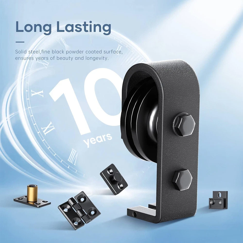 Store category Sign Up Now ! You may also like Product Description Bullet Points: Wide Range of Applications: This Rail Sliding Barn Door provides versatile elegance to your living room, dining room, or study, goodly saving space in various life situations. Its design concept enhances the ambiance of your space, making it perfect for different applications. Effortless Glide & Seal: Equipped with 2x scroll wheels and 3x hinges, our Rail Sliding Barn Door ensures a smooth operation, while the 1x sealing strip provides a warm fit, meeting your needs with sufficient quantity. Reliable Endurance: Crafted from high-quality carbon steel, this sliding barn door rail ensures a wear-resistant, solid, and enduring addition to your space. Install with Ease: Our Rail Sliding Barn Door kit includes detailed instructions and clear pictures to guide you intuitively through the streamlined setup process. Upgrade your space effortlessly with a quick and easy installation. Good Smoothness: Glide with ease on a 6mm thick track with the reliable bearing and nylon wheel combo of this Rail Sliding Barn Door rating for a high carrying capacity. Practical and durable, perfect for all your heavy-duty sliding needs. With 2*roller swivel stands, it slides smoothly on a solid, 6mm thick track. Pictures and text provide a detailed view of this durable, stylish door. Specifications: Colour: Black Material: carbon steel Track size: about 34 inches/86CM Track splicing method: 3 pieces Scope of application: Door panel thickness 0.5-50MM Packing List: 3*track 2*scroll wheel 2*roller swivel stand 1*roller holder 3*spacers 3*hinge 1*floor rail 1*sealing strip 1*screw pack 1*instruction manual 4*pipe clamp 35mm 4* wood screws Payment Delivery details Terms of sales About us Feedback & DSRs Payment Before you palce an order, please kindly make sure that you have a paypal account. We accept PAYPAL payment only. Payment should be completed within 2 days after auction closed, or unpaid dispute will be filed for an closing auction. An unpaid case will be filled after 4 days. Delivery details We ship to your eBay address. Each package will be shipped to US by UPS Regular Parcel with tracking number. Please check your shipping address carefully before checkout, it can't be changed if order completed. All items will be shipped within 1-2 business day upon receipt of payment.Orders placed on weekend will be shipped within 3 days. If you do not receive your item in 7-10 business days.please contact us immediately for further assistance. We will be responsible for any damages or losses incurred in the shipping process. About us We maintain high standards of excellence FIVE STAR and strive for 100% customer satisfaction! Positive Feedback is very important to us. We hope that you contact us immediately Before you give us neutral or negative feedback, so that we can satisfactorily address your concerns. We promise to offer the lowest price and high quality produce. Our working time: From Monday to Friday(9:30 am to 18:00pm), we don't working on holidays ,hope you can understand and know that , thank you. Please always talk to us via ebay Message. We appreciate your business and look forward to growing our e-Bay sales with satisfied customers. Feedback Contact us If you have any questions, please feel free to contact with us by ebay Message during our business hours ( 9:30a.m. to 5:30 p.m.), or email us through eBay, we will try our best to help you to resolve it. For any presale or after-sale questions,please do feel free to email us! Due to the time difference, each email will be replied within 1 working day,and weekend will be delayed a bit. Feedback