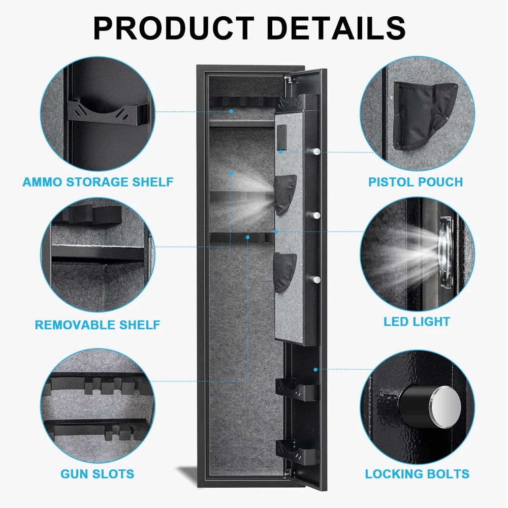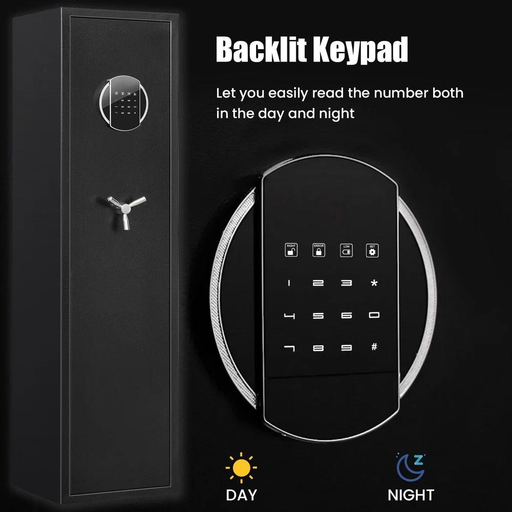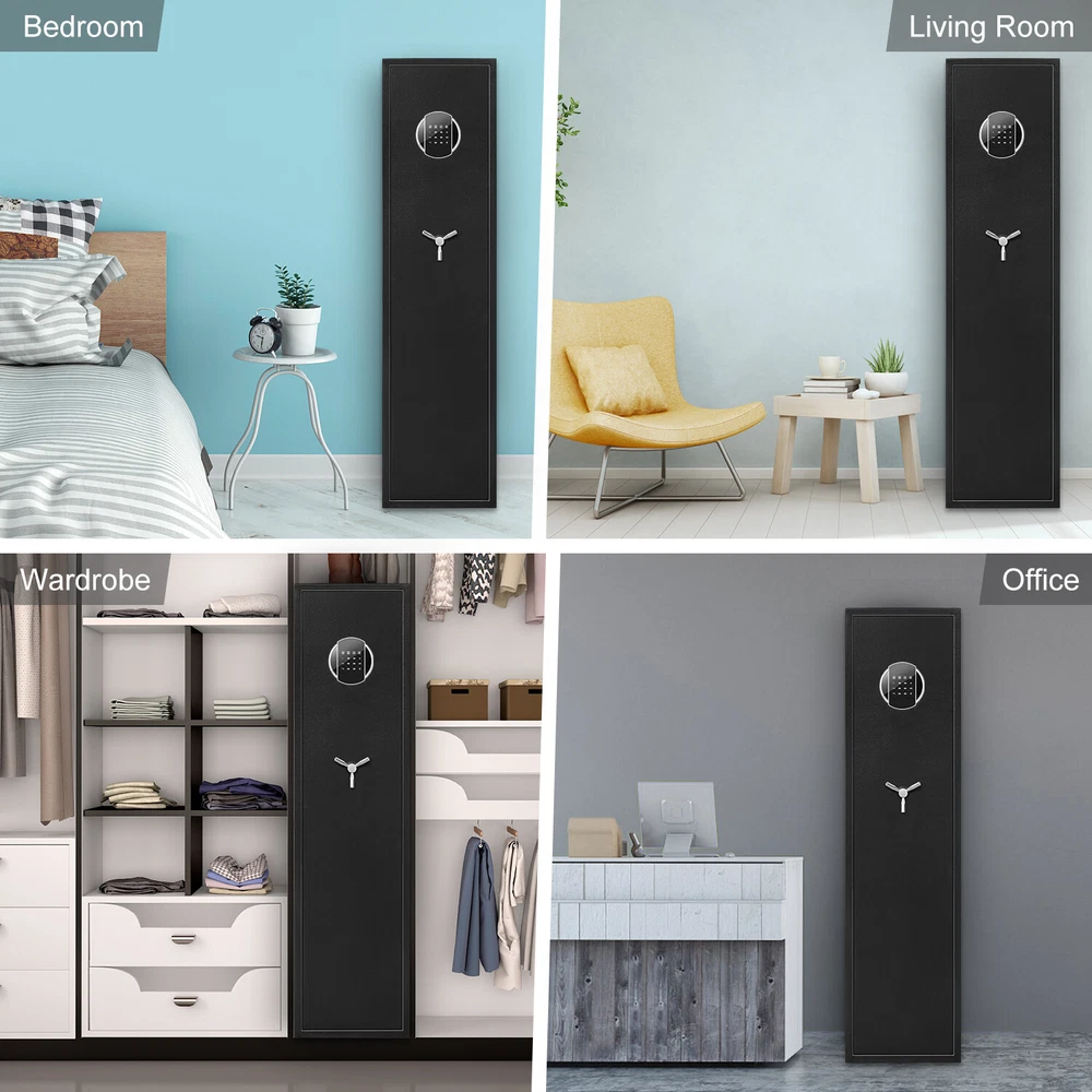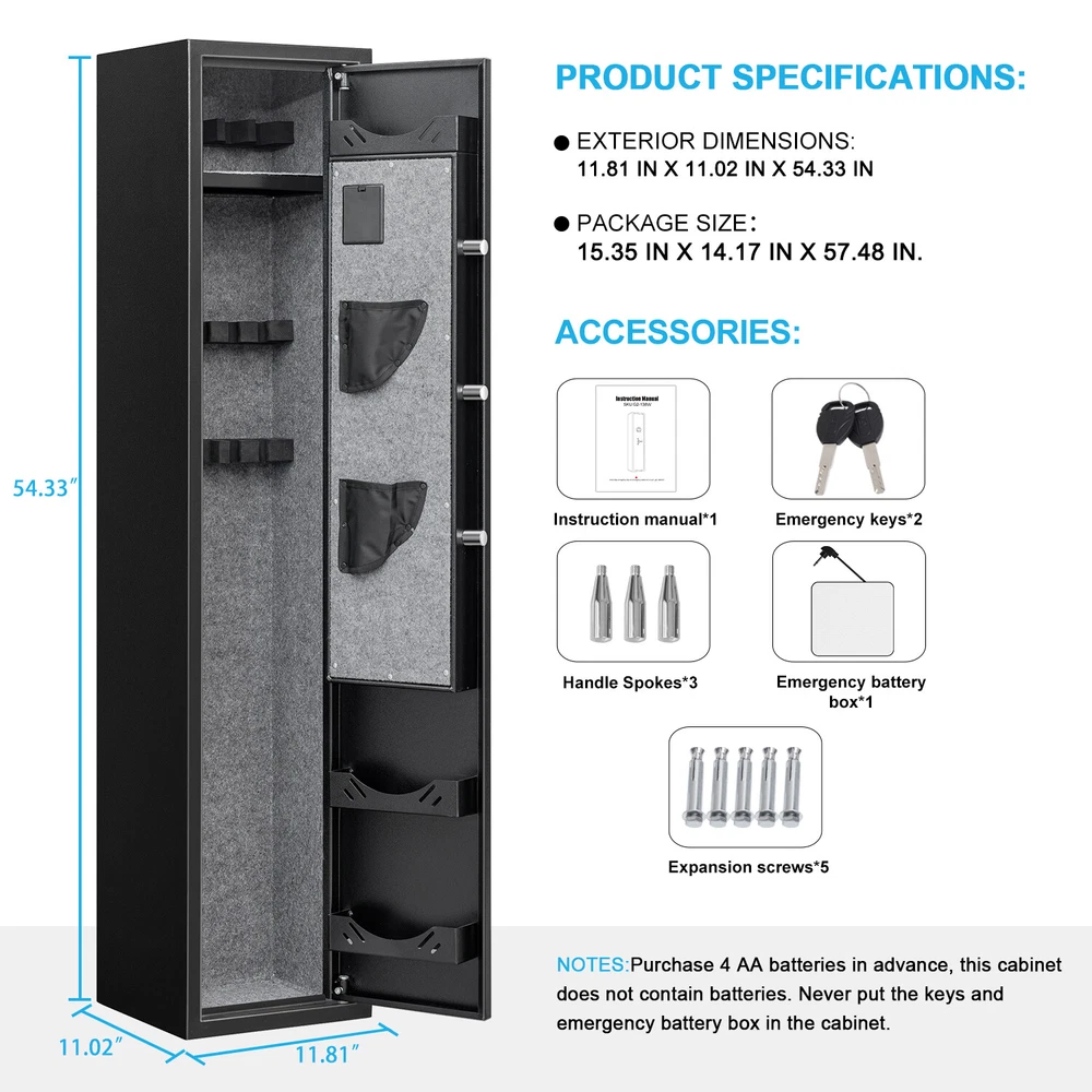 Description Larger and deeper Rifle Safe: Compared to similar rifle safes for home on the market, the Silkight gun safe rifle is larger and deeper which can store 3-5 rifles up to 52 inches with or without scopes optics or shotguns. The interior features a soft foam barrel holder and carpeted floor to protect your gun. Product exterior dimensions: 11.81 IN X 11.02 IN X 54.33 IN. Solid & Durable: Made of reinforced solid thickened cold alloy steel, our gun safes for rifles and shotguns is built to last. 3 solid locking bolts, which can protect the gun safes from tampering and prying, add more security. Besides, packed with thick cardboard and foam box, avoid or reduce the damages on your gun safes & cabinets during violent transportation. Dual Alarm System & Built-in LED Light: The gun locker has a dual alarm system that activates after 3 consecutive incorrect passwords or violent vibrations, best to keep children or other unwanted visitors away, which can be stopped by entering the correct password. Built-in LED light let you use this gun storage cabinet even in the dark. Three Unlocking Methods: ①: Code + Handle for quick access and daily use ②: Emergency key + Handle for the first opening, code forgotten or weak battery ③: Emergency battery box + Code + Handle for weak battery and lost key. Multi unlocking ways offer you more convenience, you can always open the large gun safe whenever you forget code, lost key or weak battery. We also provide lifetime key matching service in case of any emergency. Warm Design: Our rifle safe has a removable shelf and adjustable pistol rack for easy storage of up to 3-5 guns. It can store long guns up to 53.5'' when you remove the shelf. Besides, 3 adjustable gun slots can be adjusted to fit your different height of rifle, and you can store up to 5 long guns. And the soft velvet interior can protect your guns or other valuables from scratching. Additionally, the triangle handle is sleek and wear-resistant. It can be removed to prevent theft. Easy to Install & Widely Used: Our shotgun safe is fully assembled and there are 5 pre-drilled holes in the back and at the bottom, you can easily fix it to the wall or floor with the 5 expansion bolts included. Besides, this slim gun safe design can be placed at home like living room, bedroom or closet, also ideal for office or hotel. Complete Accessories & Friendly Customer Service: Package include: 1 x Rifle gun safe, 2 x Emergency keys, 5 x Expansion screws, 1 x Emergency battery box, 1 x User manual. Please double-check all parts after receiving. Any problem about this large gun safe like lost, damage, open or setting issue, please contact us at any time. You will always enjoy 7*24h friendly customer service from Silkight. Besides, we will provide lifetime warranty for each shotgun safe we sold.