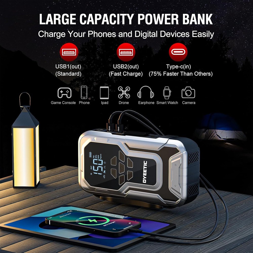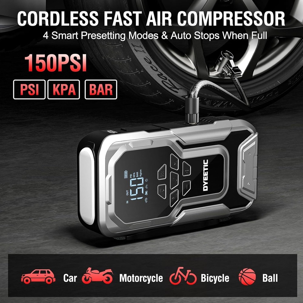 Car Jump Starter with Air Compressor, 3500A 12V Lithium Battery Silver Product Details Brand: Dyeetic Product Dimensions: 8.5"D x 4.1"W x 5.9"H Item Weight: 2.8 Pounds Amperage: 3500 Amps Peak Output Current: 3500 Amps Manufacturer: Shenzhen Kalaifu Technology CO., Ltd Model: D18 Item Weight: 2.8 pounds Item model number: D18 Batteries: 1 Lithium Ion batteries required. (included) Manufacturer Part Number: D18 Brand: Dyeetic Product Dimensions: 8.5"D x 4.1"W x 5.9"H Item Weight: 2.8 Pounds Amperage: 3500 Amps Peak Output Current: 3500 Amps Battery Cell CompositionVoltage: Lithium Ion12 Volts Vehicle Service TypeBattery Capacity: Passenger Car, Bus, ATV, Motorcycle, Van, RV, UTV, Truck, TractorPassenger Car, Bus, ATV, Motorcycle, Van, RV, UTV, Truck, TractorPassenger Car, Bus, ATV, Motorcycle, Van, RV, UTV, Truck, Tractor See more 21800 Milliamp Hours 【Start Most 12V Cars Dead Batteries】This Dyeetic jump starter delivers a peak of 3500A, enabling it to start dead batteries in seconds. Its upgraded 4-cell lithium battery is compatible with 12V vehicles, including those with up to 10.0L gas and 8.0L diesel engines. It supports over 50 jump starts on a single charge, making it perfect for passenger cars, SUVs, lawnmowers, motorcycles, trucks, and boats. 【Powerful Cordless Air Compressor with 4 Extra Nozzles 】The 150psi digital air compressor can inflate a car tire to 20 PSI in just 2 minutes. You can preset the desired pressure (PSI, BAR, KPA), and it will automatically shut off once reached. The large LCD screen provides accurate tire pressure readings and offers multiple mode selections for cars, bicycles, motorcycles, and balls. 【10 Intelligent Safety Protection】DYEETIC has been proud of its outstanding safety standards for decades. This jumper box features a mistake-proof design, eliminating worries about incorrect connections or sparks. With 10 intelligent safety protections and real-time alerts, it ensures fast starts in extreme environments (-4°F to 140°F) and can remain on standby for up to 24 months. 【Large Capacity Power Bank with Fast Charge Port and 3 Modes LED Light】 More than just a jump starter, it also functions as a 21800mAh power bank with two output ports (1 fast charge port), capable of charging smartphones and tablets and more. The built-in flashlight has three modes (Flash, Strobe, and SOS), providing essential lighting during emergencies or outdoor adventures. 【Big LCD Display and Portable Carry Case】The large LED display shows real-time battery levels and alerts you to potential errors. The jump starter is lightweight and compact, making it easy to carry in a backpack for outdoor camping or travel. It comes with a portable carry case for added convenience, it is a practical consideration that can minimize the space it occupies in the trunk, glove box, or under the vehicle seat.