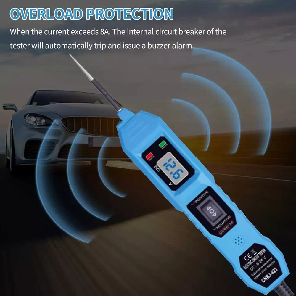 Features: Multi-features: Component Flexibility. Voltage Detection. Diode Detection. Continuity Testing. Ground Detection. Tracking to locate short circuits. Positive and negative detection. Overload Protection. Lighting. Sound Alert. LCD High Definition Display: When the probe detects a positive pole or performs a positive activation, the front red LED lights up with a blue LCD voltage display. When the probe detects a negative terminal or performs a reverse activation, the front green LED lights up with a blue LCD voltage display. Lighting Design: Unique design for easy maintenance lighting at night. Easy to use at night. Wide Range of Products: Support all 3.5-36V electrical system testing, including cars, pickup trucks, off-road vehicles, motorcycles, construction vehicles, boats, etc. Specifications: Item name: Automotive Circuit Tester Model: CNBJ-823 Item color: Blue DC voltage range: 3.5-36V Over-current protection current: 8A Rated current: 1-8Amp Accuracy: ±2% Line length: 4.5 meters Operational temperature: -10 to 60℃/-4 to 158℉ Relative humidity: < 80% Item size: Approx.26*4*2.8cm/10.23*1.57*1.10in Total weight: 390g/13.75oz The package: 1 * Automotive Circuit Tester