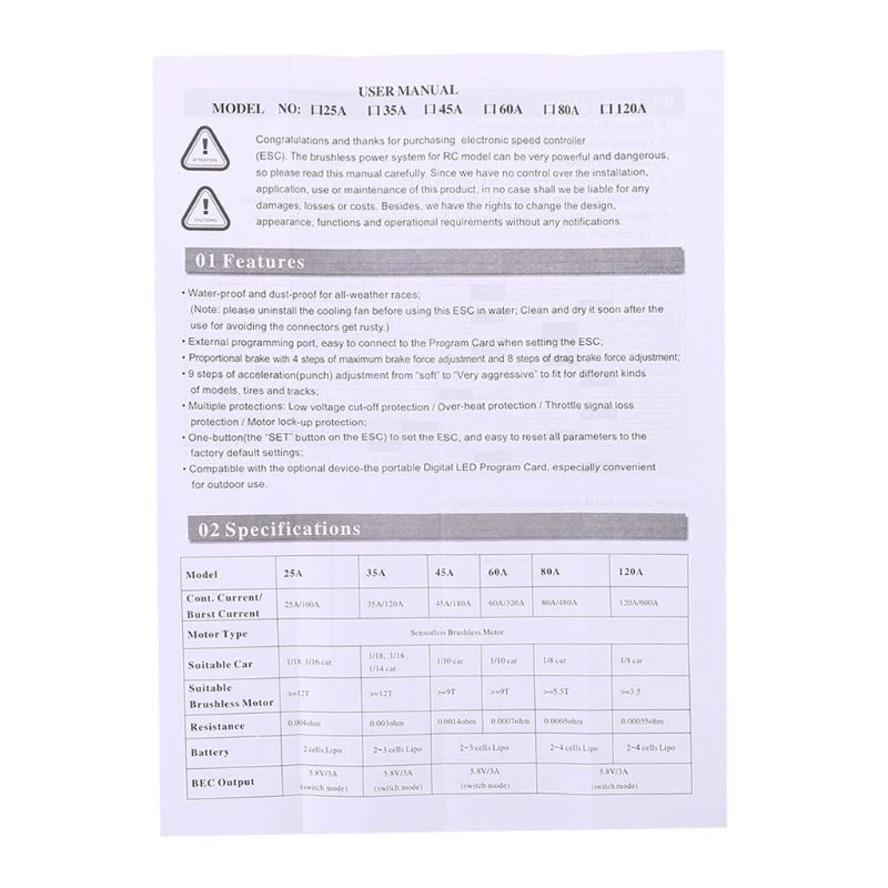 Features: 1. Water- proof and for all-weather races; (Note: please uninstall the cooling fan before using this in water and dry it soon after the use for avoiding the connectors get rusty.) 2. Specially designed for car with excellent start-up, acceleration and linearity features. 3. for sensorless brushless motor. 4. The strong current capability, excellent heat dissipation. 5. Multiple for features: Low cut-off for for litium or /Over-heat protectionThrote loss for / Motor blocked for 6. Easily programmed and for pocket-sized program card. Specification: Name: 35A Cont.Current/Burst Current: 35A/120A Motor Type: Sensorless Brushless Motor for 2S Lipo or 6 cells NiMH 1. on-road: 28XX-Size or smaller motor with the KV<6000KV 2. off-road Monster 28XX-size or smaller motor with the KV <4000KV for 3S Lipo or 9 cells NiMH 1. on-road: 28XX-Size or smaller motor with the KV<4000KV 2. off-road Monster 28XX-size or smaller motor with the KV <3000KV Suitable Car: 1/16 1/14 Car Resistance: 0.0004ohm 2-3S Lipo/4-9Cells NiMH BEC Output: 5.0V/2A(analog Dimensions/Weight: 40x31x17mm/44g Package Included: 1 x 35A 1 x English Manual This is Electronic Speed Controller for car. High power system for model is very so please read this manual carefully. Since we can'for t control over the correct use, installation, application, or maintenance of our products, we'veno liability shall be assumed nor accepted for any damages, losses or costs resulting from the use of the product. Any claimsarising from the operating, failure of malfunctioning will be denied. We assume no liability for injury,consequential damages resulting from our product or our workmanship.