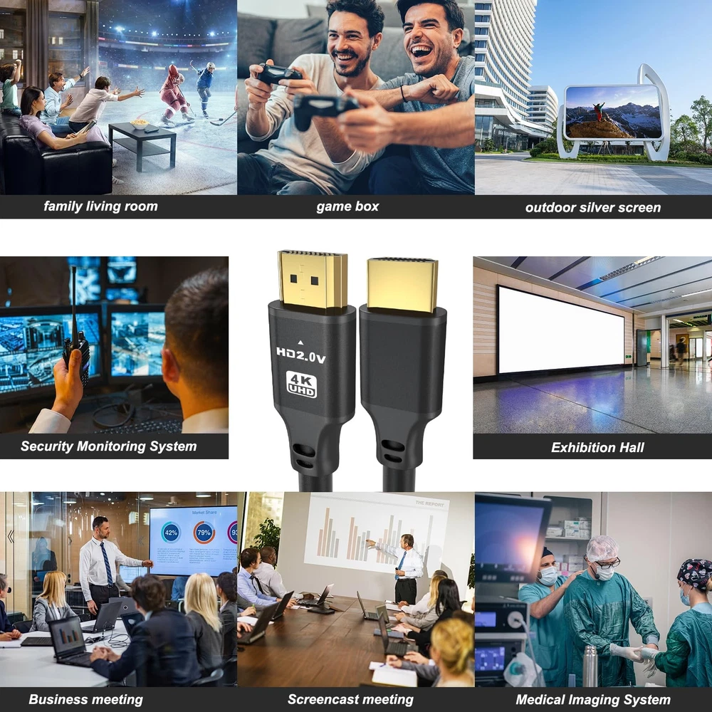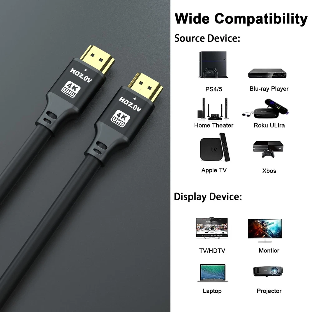 4K HDMI cables 【Ultra High Performance】Upgraded HDMI 2.0 HD cable supports 18Gbps, support frequency 4K/60hz, 3D video, 7.1 surround sound, HDR, ARC and even Ethernet data, it can provide more ideal depth, brightness, detail, contrast and wider color gamut for Ultra HD movie experience and 3D visual effects. 【Quality Experience 】No double image, no flashing screen, TMDS transmission differential signal, aluminum foil ground woven (round) multiple shielding, transmission stability without loss.Large screen projection, office/speech more clear and efficient, automatic synchronization of audio and video, no manual adjustment, enjoy sound vision. 【Sturdy and Durable】Using 24K gold-plated material, the interface is firm and not easy to fall off,corrosion and oxidation resistance, long-term use of rust, signal transmission is still stable. And each of our cables and even each component has been strictly tested for performance and presented to you after passing the test 【4k HDMI Cable 2.0】Supports for an HDMI Audio Return Channel (ARC), HDMI Ethernet Channel (HEC), 48-bit color depth, 32 channel audio, Dolby True HD 7.1 audio, and 3D video, giving you an immersive, multi-dimensional experience. 【Wide Compatibility】Suitable for any device with HDMI port, including PS5 / PS4 , X-box series One , DVD / Blu-ray players, Roku TV, HDTV, laptops, projectors and other devices. Ideal companion for home theater, medical, conference room and gaming imagination.