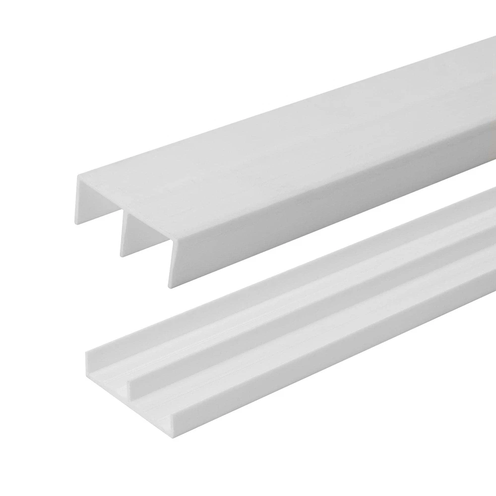 Plastics' plastic sliding door track features an upper track, and lower track. It is designed for installing by-passing 3/4" thick sliding doors with a 13/16” gap. Popular applications include sliding door track, sliding showcase doors, bookcases, small cabinets, vanities, medicine cabinets reptile tanks, vivariums, honeycomb panels and more. Our sliding door track system allows wood doors to slide smoothly and quietly without requiring glides, wheel or lubricant. Installation is fast and easy. Simply apply screws, glue or double-sided tape. Each plastic channel is 1-13/16” wide x 36" long and comes in a single pack. Our upper/lower sliding door track is manufactured from durable Styrene that can withstand years of use. It features a solid white finish. Upper Track Dimensions: 1-13/16" W x 3/4" H x 36" L. Lower Track Dimensions: 1-13/16" W x 3/8" H x 36" L. FITS 3/4" THICK PANELS. This plastic sliding door track system works with 3/4" thick wood panels. Perfect for sliding showcase doors, bookcases, cabinets, reptile tanks, honeycomb panels and more. SMOOTH, QUIET OPERATION. Allows panels to slide smoothly and quietly without glides, wheels or lubricant. DIY FRIENDLY. Sliding door track is easy to install using screws, glue or double-sided adhesive. The 36” long plastic channel can be trimmed to fit your needs. PREMIUM QUALITY. Made of durable Styrene with long-lasting white finish. COMPLETE SLIDING DOOR TRACK SET. Your order contains an upper track (1-13/16" W x 3/4" H x 36" L) and a lower track (1-13/16" W x 3/8" H x 36" L)