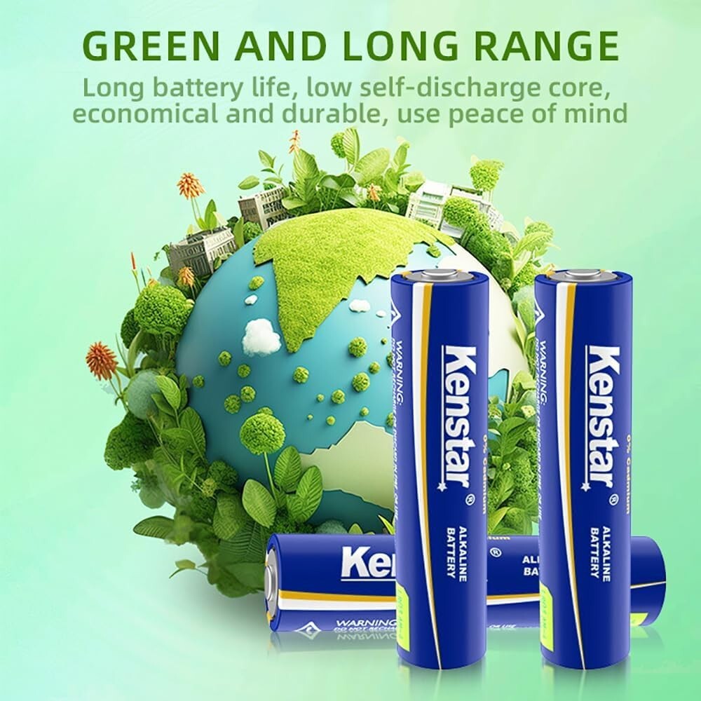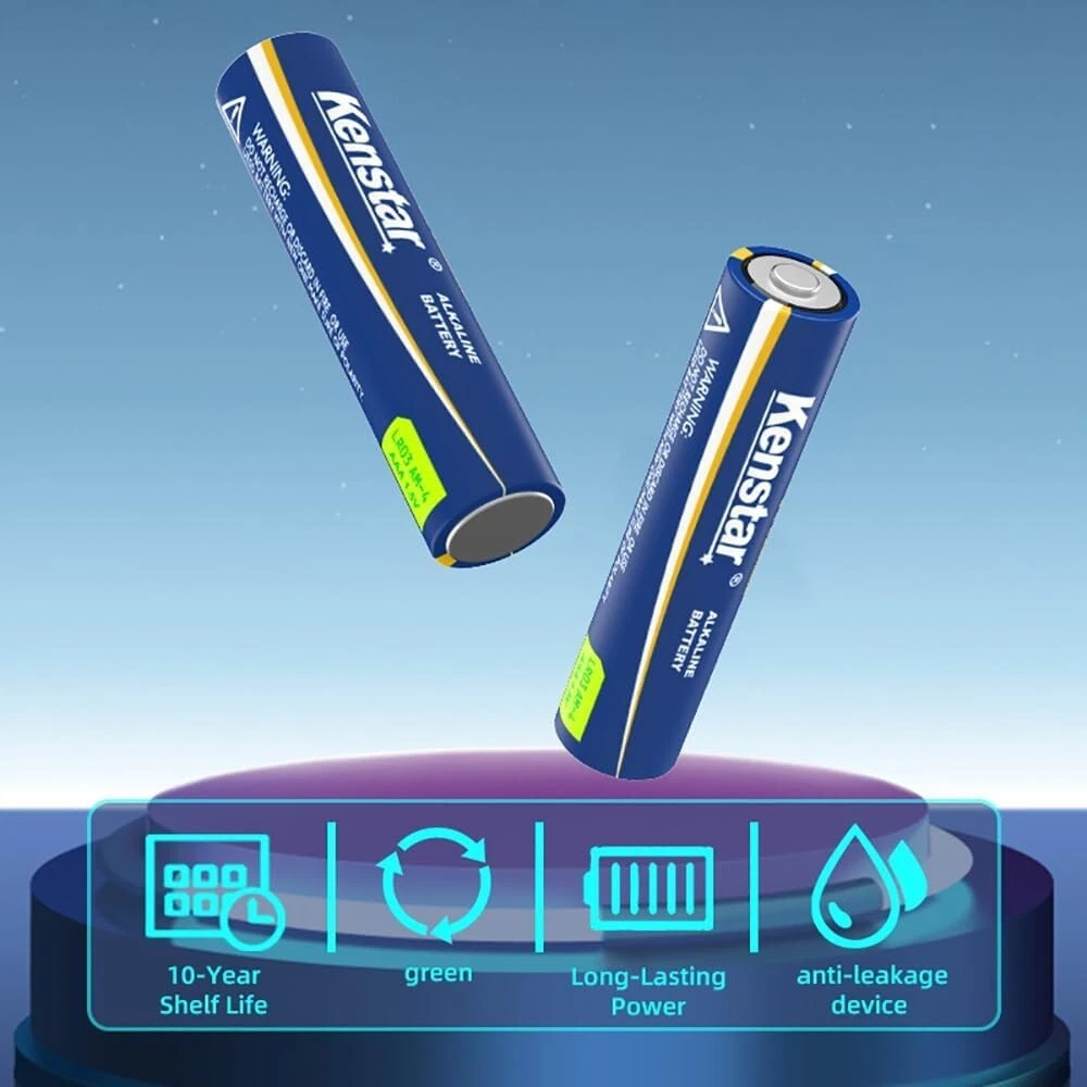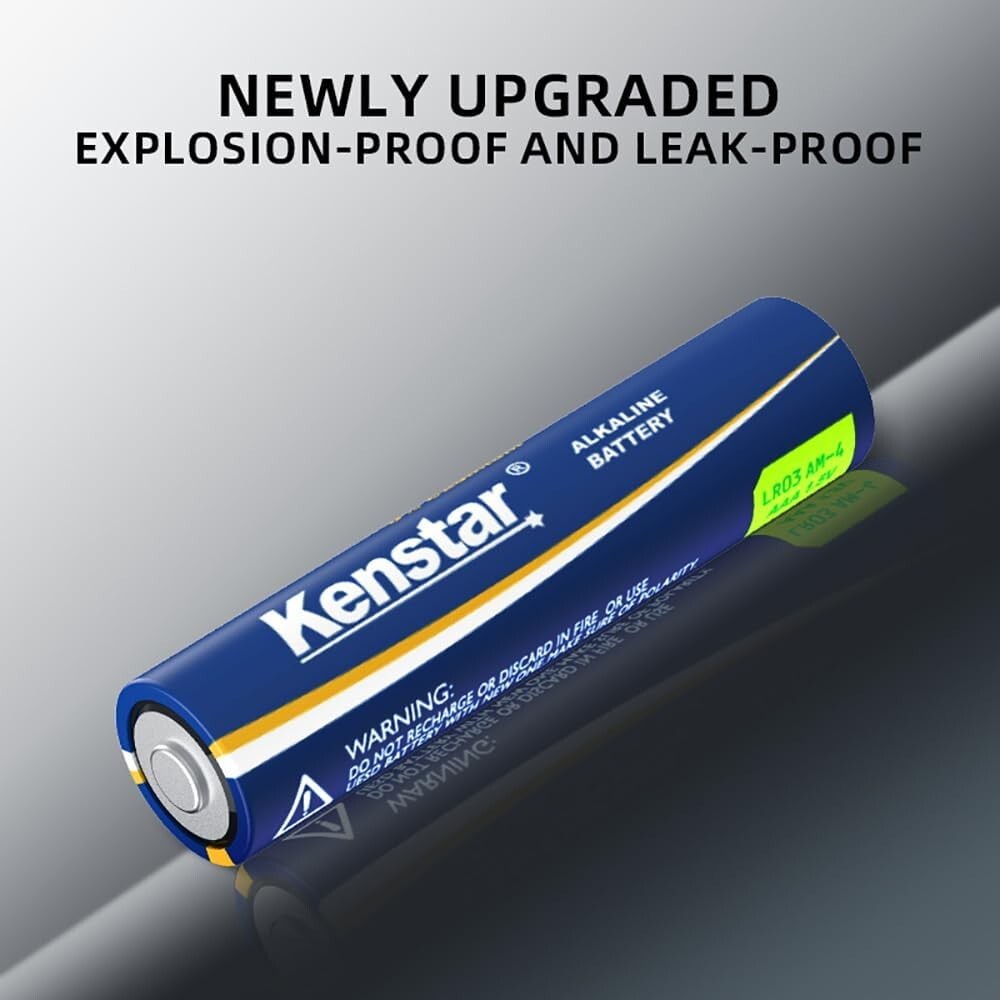 Kenstar AAA Batteries 36 Pack, High-Performance Alkaline Triple A Battery for Household and Office Devices, 1.5 Volt, Leakproof, Long Lasting, 10-Year Shelf Life Number of Batteries 36 AAA batteries required. (included) Battery Cell Composition Alkaline Recommended Uses For Product TV Remote Unit Count 36.0 Count About this item Reliable Power: Kenstar AAA alkaline batteries, offering a 870 mAh capacity and 10-year shelf life, provide long-lasting and dependable power for various devices like remotes, game controllers, and smart home gadgets. Premium Quality: These batteries feature a double-layer internal structure encased in stainless steel, ensuring 100% leakproof operation and added durability. Eco-Friendly Choice: Kenstar's 1.5V AAA batteries are free from mercury and cadmium, making them an environmentally conscious option for your family.