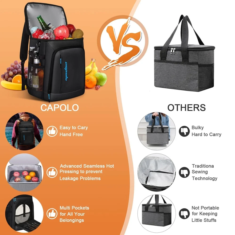 ABOUT THIS ITEM: Upgrade Insulated & Leak-proof & Sweat-Free Material:Upgrade 4 layers(others 3) of material to effectively lock temperature.The inner layer uses a silver PEVA seal and adopts a seamless hot pressing process for leak-proof .210D waterproof wear-resistant lining lowers the risk of tearing or coming apart. Thickened 8mm (others 5mm) foam Insulation helps to prevent heat transfer. Waterproof nylon outer adds abrasion protection. (The zipper isn't leakproof, kindly take care to avoid tipping over) 36 Cans Large Capacity & 4 Compartments: Capolo soft cooler with 4 compartments offers convenient organization options, and helps you keep your item neat and organized, eliminating the need to search the entire bag.36 Cans Main Compartment, perfect for keeping your food and drinks chilled on the go. The top compartment offers a separate dry storage space, ideal for snacks or personal items. Plus, 2 additional pockets with 2 mesh slots for utensils, napkins, or any small travel essentials. Lightweight & Ergonomic Design: Tailored with adjustable shoulder straps and thickened 10mm back foam(others 8MM), it offers personalized support, ensuring your load is evenly distributed for maximum comfort during any adventure. The generous foam thickness is a barrier, blocking cold air from contacting your back and further enhancing your comfort. Bid farewell to cumbersome traditional soft coolers, upgrade your journey experience today, and invest in a Capolo cooler bag! Experience Unmatched Convenience and Detail: The Capolo beach cooler bag stands out with its meticulously crafted details. Adjustable side buckle designed to hold tall bottles adjusts for optimal bag shape retention and serves as a makeshift handle for easy two-person carry. We provide an opener ensuring you can enjoy your favorite beverages hassle-free anytime. Reflective strips on the shoulder straps increase visibility during low-light conditions, ensuring your adventures are safe at any hour. Water-resistant Outer: Water-resistant Outer to protect your items from raindrops, sweat, and moisture, Be well suited as a backpack lunchbox, travel cooler, camping cooler, insulated backpack, etc.