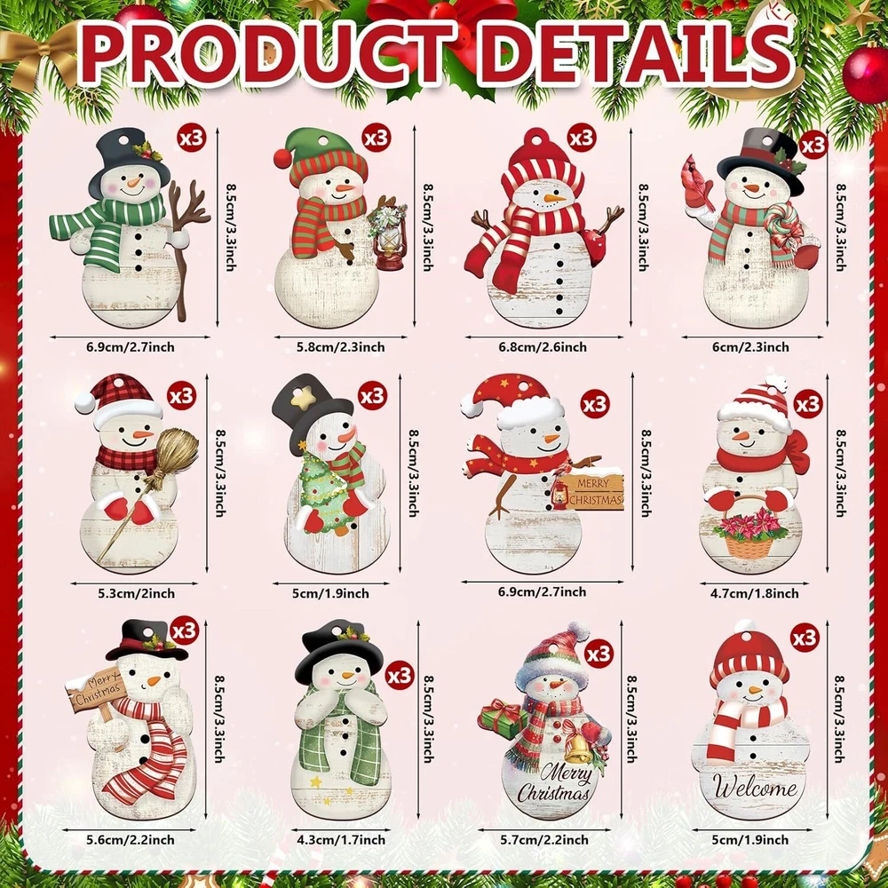 AutoDS Template Store New Arrivals Add to Favorite View Feedback Contact 36 Pcs Christmas Snowman Ornaments Decoration Wooden Red Snowman Christmas Tree 36 Pcs Christmas Snowman Ornaments Decoration Wooden Red Snowman Christmas Tree Christmas Ornaments Set :Snowman ornaments include 12 styles 36 pieces of snowman Christmas tree ornaments, with 36 hemp ropes, 3 pieces for each style, rich quantity can easily meet your daily use, Christmas party, and winter decoration needs Easy to Use: Christmas ornaments are printed with high-definition patterns. Each piece of wood has a small hole, which can be tied to the line with rope, ribbon, or lace for easy hanging Premium Material: These DIY Christmas ornaments are made of wood, which is sturdy and lightweight, not easy to deform, will not fade, and can be reused. It can decorate your room for a long time Exquisite Crafts: Great for Christmas signs, gift tags, coasters, photography props, and many other art and craft projects. These red snowman hanging ornaments are perfect for Christmas, weddings, birthdays, New Year, etc Wide Application: These wooden Snowman ornaments will become beautiful decorations for Christmas trees, windows, Christmas wreaths, wreaths, or fireplaces, and are also good Christmas gifts or housewarming gifts. It is also a good helper for offices and farmhouses to create a Christmas atmosphere Christmas Package included 36 pcs x Christmas Ornaments Slices 36 pcs x Handmade threads Our 24 packs of Christmas tree decorations can not only be hung on the tree, but also can be linked to Christmas gifts with blessings and love tags, or just as gifts for your friends and family Unleash your full creativity and create unique decorations. Not only for Christmas but also other festivities such as weddings, birthdays, etc, to bring to mind those special moments These vintage Christmas snowman decorations can be hung on Christmas trees, fireplaces, windows, living rooms, and other places as Christmas decorations; they are great Christmas decorations for homes, offices, farmhouses, and winter decorations Number of Pieces 36 Occasion Type Christmas Package Quantity 1 Color Snowman Included Components Cord And String Material Wood Shape Snowman Target Audience Adult Theme Christmas Scent Name Unscented Are Batteries Required No Mounting Type Hanging Size Large Subject Character Snowman Product Dimensions: 4.25 inches x 4.49 inches x 2.24 inches. Weight: 5.3 oz About Us Welcome to our eCommerce shop. We're dedicated to providing you with high-quality products at unbeatable prices. Our professional customer support team is more than happy to help with anything that you need. We’re proud to serve you and bring a smile to your face with our top-notch service and products. Please visit our eBay store for a full list of products on sale, and don’t miss what we have to offer. Payment policy We only accept payments made by PayPal. Please make sure that your PayPal and eBay shipping addresses match. Immediate payment is required before we send out your package. Shipping policy We are always working hard to ensure your package arrives as soon as possible. Please understand that some factors like weather, high postal traffic, and the performance of shipping companies are outside of our control. In most cases, your package will arrive before due time as it is a high priority for us. If there are any unexpected delays, please let us know and we will take care of it immediately. We have multiple locations in the US; residents of these states will be charged tax according to the state they reside in. Tax information is available at checkout. Returns We are committed to your happiness. That’s why we offer a 30-Day Return Policy on items that you are not completely satisfied with. You have the option for a refund or an exchange of the item. No returns are available on items shipped outside of the USA.