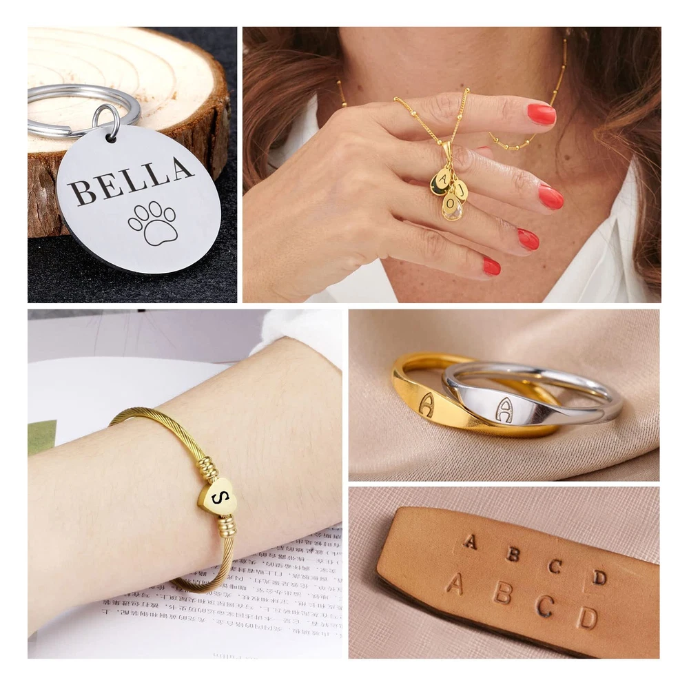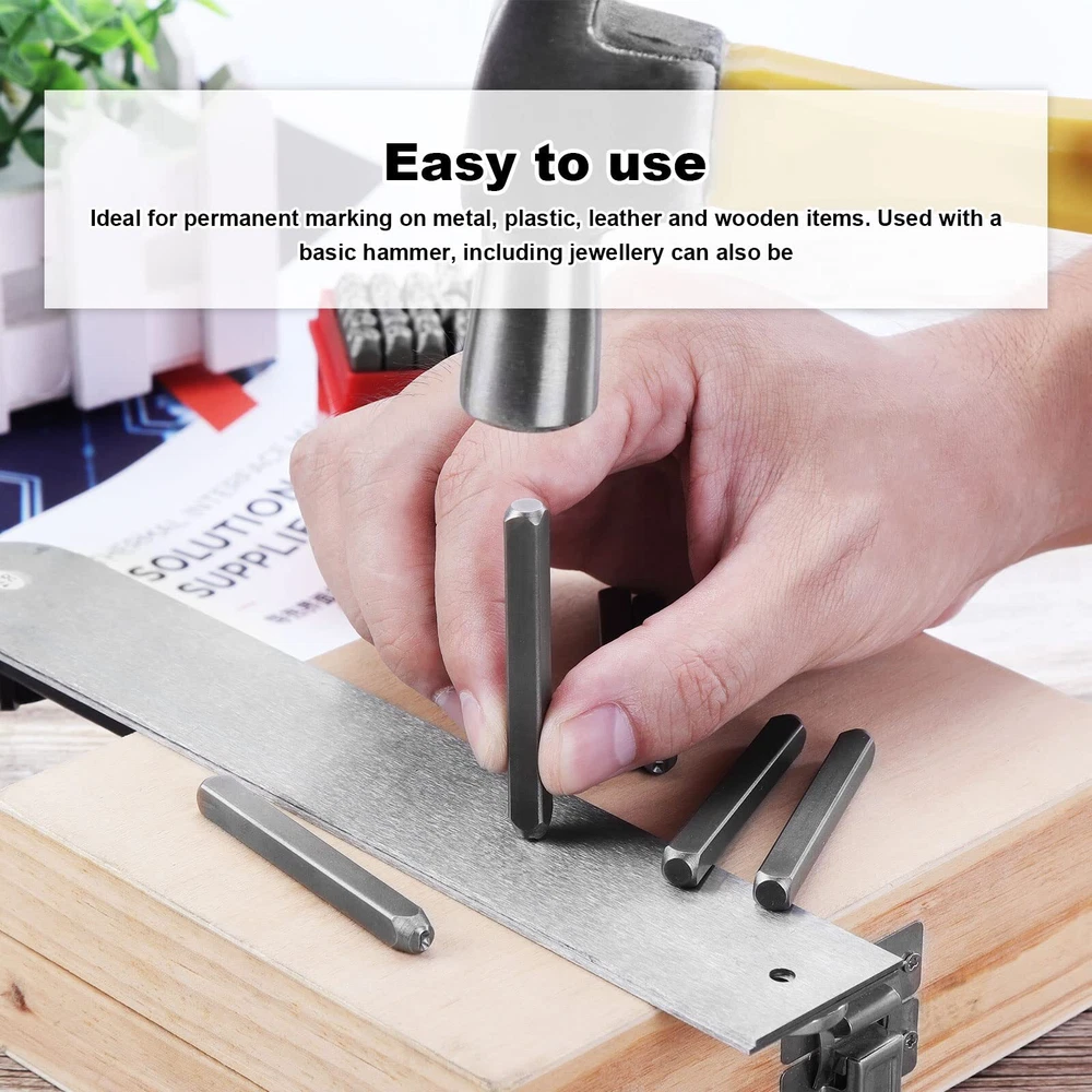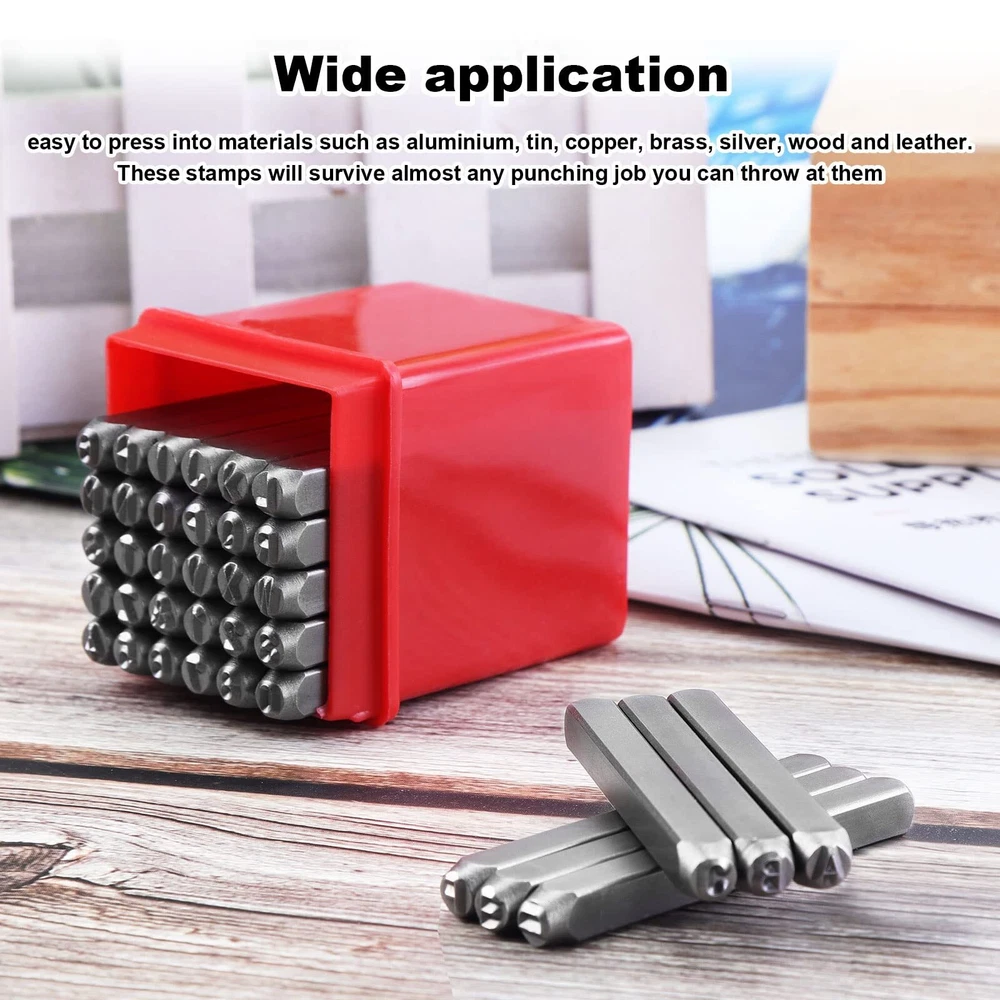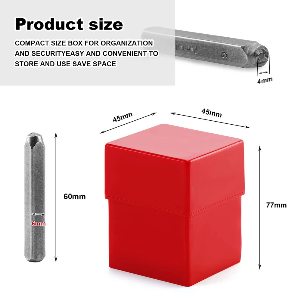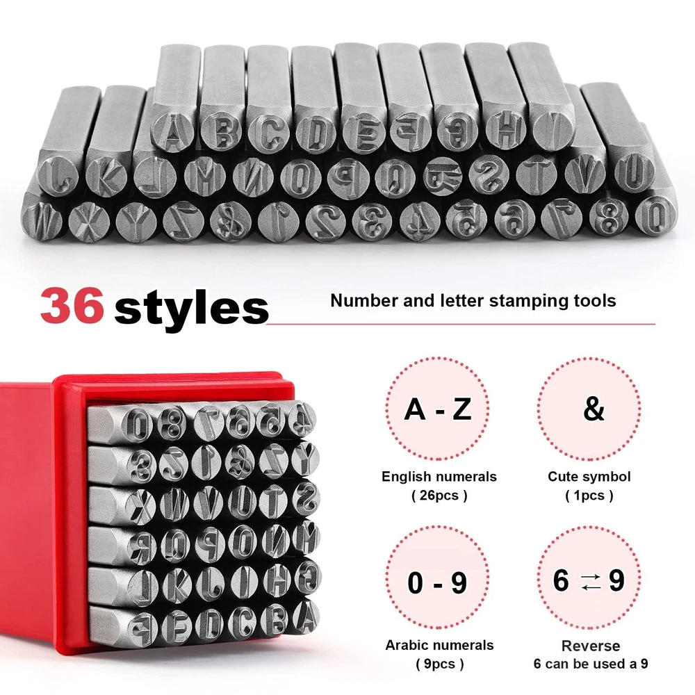 Product Description: --The letter number and symbol metal stamp set is great for jewelry and fashion projects, crafts, DIY gifts, marking personal items, etc. --Please check the picture is upside down before use. Specification: Material: iron Size: Alphabet, number and symbol 5/32'' (4mm) in diameter Stamps punch press tool 1/4''(6mm) wide, 2.36''(60mm) long Package Includes: 26 Pieces x Capital Letters: A to Z 1 Piece x Symbols: "&" 9 Pieces x Number: 0, 1, 2, 3, 4, 5, 6/9, 7, 8 1 Piece x Plastic box Instructions: Step 1: Practice punching on paper 8 to 10 sheets thick. Determine the correct position and use a felt-tip pen or fingernail polish to make a mark on the stamps punch press tool that is facing you. Step 2: Place the blank label on the metal letter stamp set. You can mark where you want to stamp on your label with a pencil. (Permanent ink requires solvent to remove). Or you can write the word on a sticky note and place it over your object as a guide. Step 3: Choose a letter number and symbol metal stamp set and stick it with the marker. Place the letter number and symbol metal stamp set in the right place on the label where you want the imprint. Step 4: Keeping the number and letter stamp set steady and straight, hit the top of the punch hard with an iron hammer and hit several hits. Step 5: After you complete the above steps, the word will be engraved on the blank label. Step 6: Repeat the steps and fill in the label with the words. You can also try it on other forms of blank tags, or unskilled crafts, leatherwork, wood material, etc. NOTE: Iron rust may contain some oil 【36 Piece Metal Stamp Set】Letter number and symbol stamp set includes 26 capital letters A to Z, numbers 0 to 8 (6 and 9 are interchangeable) and symbols "&". 【Letter Punch Set Size】Alphabet, number and symbol are about 5/32'' (4mm) in diameter, letter and number punch set 1/4''(6mm) wide, 2.36''(60mm) long. 【Durable Material】Metal stamping kit are made from high quality iron for strength and hardness. These attributes reduce wear and tear and ensure that these stamps punch press tool are durable. 【Personalize Letter Stamp Set】Personalize your handicrafts, jewelry, cards, leather decorations etc with these metal stamp number & letter punch set. Punch number set is a practical tool set for craft enthusiasts. 【Wide Application】Letter stamping tool set is very suitable for imprinting marking on materials such as metals, plastics, leather and wooden objects. The surface of the 4mm symbol punch set may contain some oil that protects it from rust.