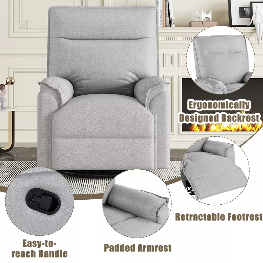 Rocking &360 Degree Swiveling - The nursery recliner swivels 360 degrees and can be moved back and forth in addition to its recline feature adjustable from 90 to 160 degree,which is ideal for breastfeeding or for those who need a convenient recliner. User-friendly Manual Recliner - With the simple reclining pull device, you can adjust the angle you want. Pull up the device under armrest and lean backwards to recline the chair. Like reading a book, watching a movie, taking a nap, all you could adjust a suitable angle to enjoy. Designed for Comfort - The recliner chair has padded back and cushions, as well as wide padded armrests, which will relieve the stresses that accumulate during long workdays, giving you a more comfortable sitting feeling and a warm ... 360 Degree Swivel Upholstered Manual Recliner Chair Theater Recliner Sofa Nursery Glider Rocker for Living Room, Grey Rocking &360 Degree Swiveling - The nursery recliner swivels 360 degrees and can be moved back and forth in addition to its recline feature adjustable from 90 to 160 degree,which is ideal for breastfeeding or for those who need a convenient recliner. User-friendly Manual Recliner - With the simple reclining pull device, you can adjust the angle you want. Pull up the device under armrest and lean backwards to recline the chair. Like reading a book, watching a movie, taking a nap, all you could adjust a suitable angle to enjoy. Designed for Comfort - The recliner chair has padded back and cushions, as well as wide padded armrests, which will relieve the stresses that accumulate during long workdays, giving you a more comfortable sitting feeling and a warm feeling of wrapping. Premium Material - This recliner is meticulously crafted using high-quality Linen Fabric, ensuring durability and long-lasting comfort. The back and seat cushions are wrapped with high-density foam, providing a luxurious feeling that enhances your relaxation experience. Reliable Quality - This contemporary recliner chair has been constructed on a robust frame and a reclining steel rail system with the weight capacity up to 264 lbs for long lasting use, which ensures the stability and durability of the recliner. Item Specifics Brand Unbranded Type sofa Color Grey Upholstery Fabric Linen Item Length 33.86 in Item Width 33.86 in Item Height 28.94 in About us Dear buyer, Thank you for visiting my store! Our warehouses are located in many regions around the United States. According to the customer's delivery address. Use USPS/UPS/DHL logistics transportation service. Prioritize the best quality logistics solutions to transport packages. Ensure package delivery time, At the same time. Have any after-sales problems, Feel free to contact us. At your service Payment PayPal is our preferred method of payments it's the quickest, easiest and most secure way to pay for your goods or services online. PayPal offers buyer and seller protection should there be a problem. If you do not have a PayPal account, to get started and buy your first item with us is very easy. Simply click on the 'Buy It Now' button and follow the eBay checkout steps. Select PayPal as the payment method you then will be given the chance to enter your card details in to PayPal's secure checkout in order to pay for your order. Shipping 1. Your purchase is shipped directly to you as soon as we have received your cleared payment. 2. Normally all of parcels would be shipped within 3days(From Monday to Saturday). 3. We will send information on eBay or email if the parcel was delayed due to our holiday. 4. We provide three kinds of shipping for choice. Shipping way depend on delivery address. Returns If an unit is received defective, of course we take it back or replace it. If the unit is received as expected, we must charge for our expenses if you want to send it back. We have to charge for the work of handling, retesting and restocking. DESCRIPTION PAYMENT SHIPPING RETURN POLICY CONTACT US Shop Category Store Home Other Hot Item Flextreme 5/8 in. Dia x 50 ft. Black Performance Rubber Garden Hose USD 46.70 5.5 cu. ft. Heaped Poly Smart Plastic Garden Cart USD 70.98 6 cu. ft. Steel Tub Wheelbarrow with Wooden Handles and Pneumatic Tire USD 113.90 Co-op Cycles DRT 1.1 Mountain Bike USD 419.29 Fox DropFrame Pro Mips 2.0 Bike Helmet USD 279.95 Delivery New List Item COOLMORE Corduroy Swivel Barrel Chair, Comfortable Accent Sofa Chair for Living USD 548.52 COOLMORE Corduroy Swivel Barrel Chair, Comfortable Accent Sofa Chair for Living USD 548.52 COOLMORE Corduroy Swivel Barrel Chair, Comfortable Accent Sofa Chair for Living USD 548.52 COOLMORE Corduroy Swivel Barrel Chair, Comfortable Accent Sofa Chair for Living USD 548.52 COOLMORE Corduroy Swivel Barrel Chair, Comfortable Accent Sofa Chair for Living USD 548.52 Help & Info Payment Policy Shipping Policy Return Policy FAQ About Us 360 Degree Swivel Upholstered Manual Recliner Chair Theater Recliner Sofa Nursery Glider Rocker for Living Room, Grey Rocking &360 Degree Swiveling - The nursery recliner swivels 360 degrees and can be moved back and forth in addition to its recline feature adjustable from 90 to 160 degree,which is ideal for breastfeeding or for those who need a convenient recliner. User-friendly Manual Recliner - With the simple reclining pull device, you can adjust the angle you want. Pull up the device under armrest and lean backwards to recline the chair. Like reading a book, watching a movie, taking a nap, all you could adjust a suitable angle to enjoy. Designed for Comfort - The recliner chair has padded back and cushions, as well as wide padded armrests, which will relieve the stresses that accumulate during long workdays, giving you a more comfortable sitting feeling and a warm feeling of wrapping. Premium Material - This recliner is meticulously crafted using high-quality Linen Fabric, ensuring durability and long-lasting comfort. The back and seat cushions are wrapped with high-density foam, providing a luxurious feeling that enhanc