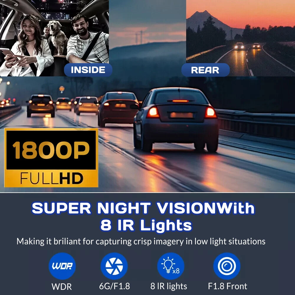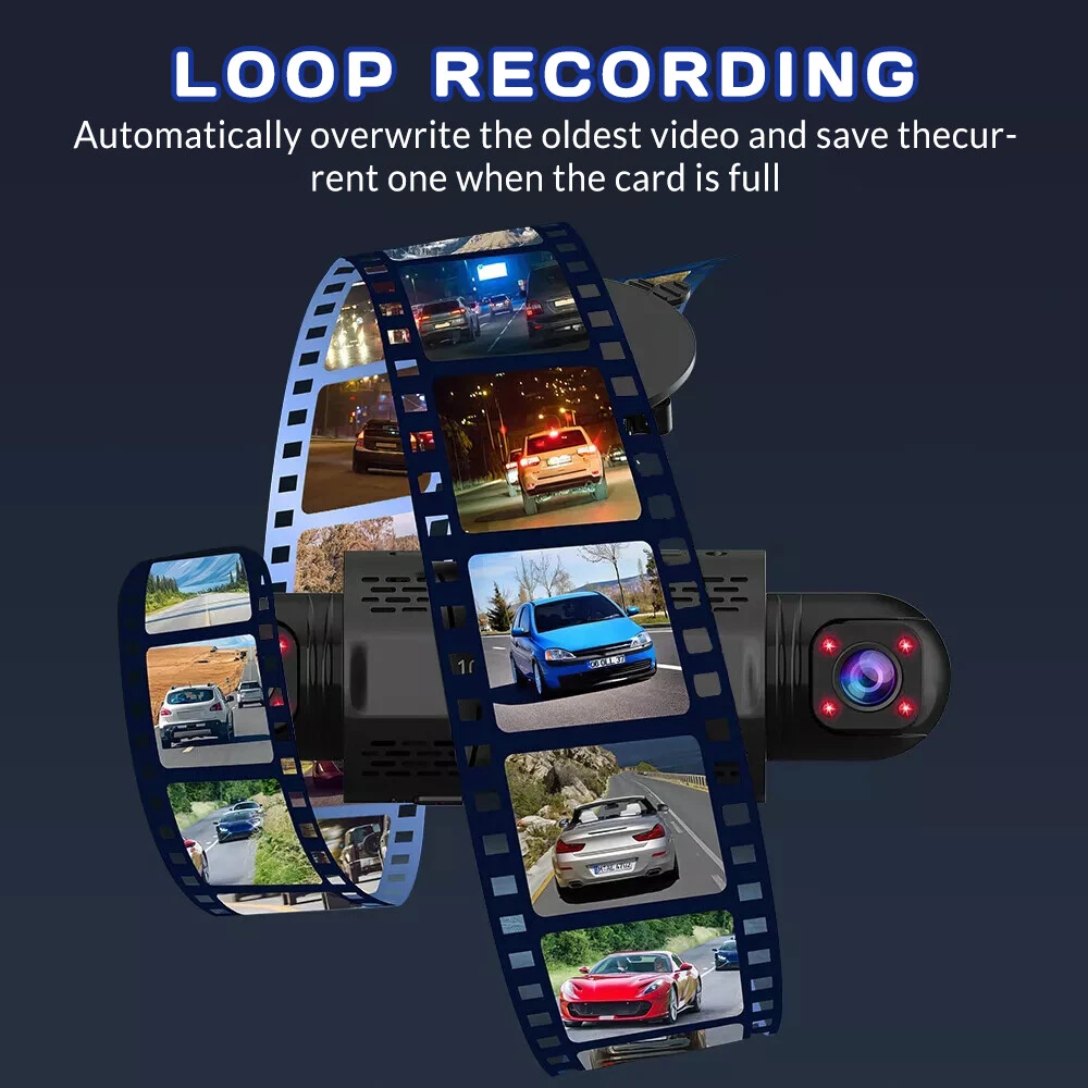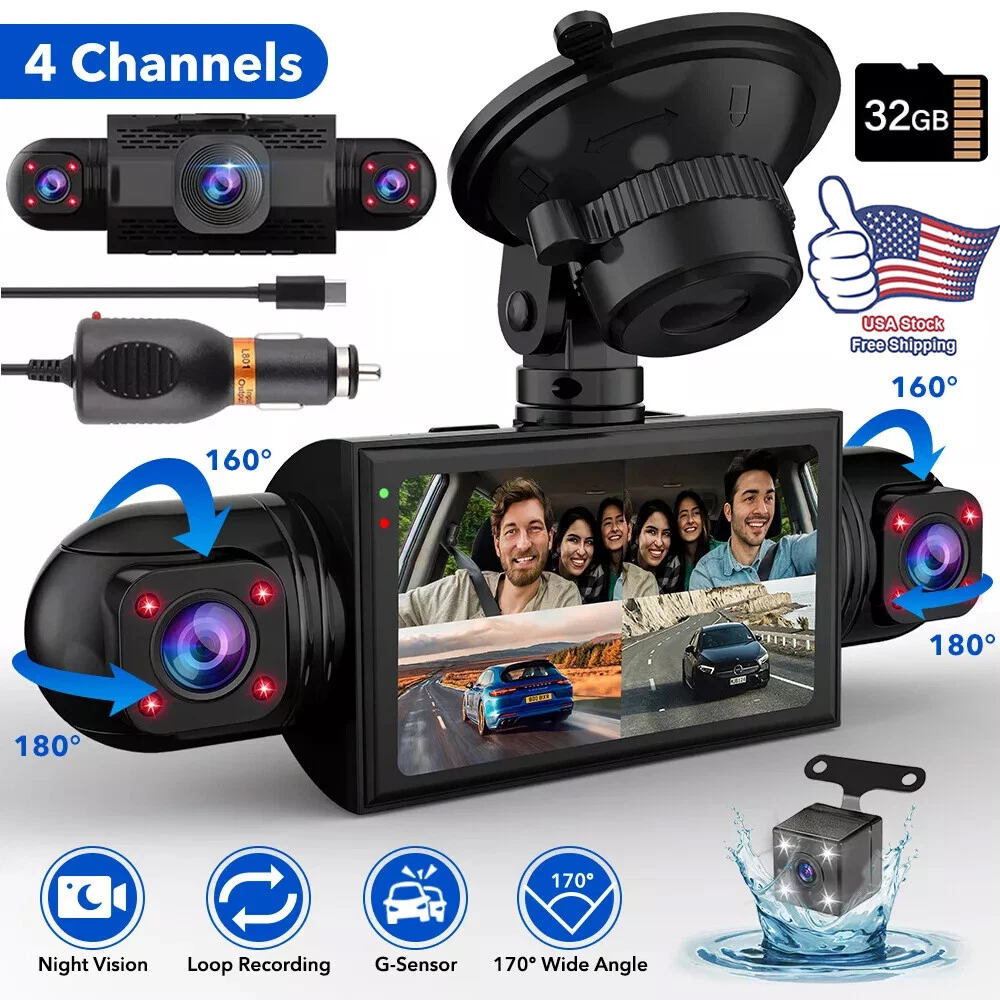 ✔【 360 Degree View 4 Channel Dash Cam 】: 4 channels car dash cam, the ultra-wide-angle lens allows 170° field of view, it can monitor the front, rear, and interior of your vehicle while providing audio, ensuring Degree View full protection. Video recording modes 1080P are available. 4 Channel Videos are displayed on the IPS screen giving you live time video feedback of your car. ✔【 4 Channel Dash Cam for All Round Protection 】:The dash cam with a 170°wide-angle front camera and a 170°in-car camera, as well as a 120°rear camera. The dash cam captures footage from all angles, providing thorough coverage of the vehicle’s surroundings. ✔【 G-Sensor Dashcams and Loop Recording 】:Then the dash cam detects a collision or bump happens, the sensor will auto-lock the footage as evidence. The Loop recording function can overwrite the oldest unprotected files when the TF card is about full. 3.0'' IPS screen 1080p car camera with 32GB SD card, can work infinitely with a loop recording function. ✔【 Superior Night Vision with 8 IR Lamp 】:The left and right camera both has 4 IR lamps. Equipped with F1.8 aperture and Upgraded sensor, dash cam can ensure super clear image at night. Even it’s totally dark, it will show the image Protect your car at any time. 4 videos will display on the screen at the same time, providing the whole views around the car. ✔【 Car Cameras 24 Hours Parking Mode 】:When you park and turn off your vehicle, the 4 channel dashcam will automatically switch to parking mode, enabling 24-hour surveillance recording, providing 24 hours protection for your car. ✔【 Easy Ins tallation 】: The dashboard camera is very easy to install and use with the help of the reference images in our user manual. The included suction mount is easy to install on your windscreen in seconds. Specifications: Resolution: 1920 * 1080P /30 Frames Display:3.0 inch IPS Screen 16:9 360*640 View angle:170 Degrees Cycle recording: Support Motion Detection Function: Support Date stamp: Support G-sensor: Support Night Vision: Support Parking Detection : Support Memory card: 32GB (Included) Power interface :USB 2.0 Battery:150 MAH Output:HDMI Current frequency:50/60HZ Language:Russian, Japanese, French, Italian, German, , English, Chinese (simplified), Chinese (Traditional), Korean ,Spanish, Portuguese Operation Temp:-20°-+70° Package Included: 1 x 4 Channels Dash Cam 1 x 32G TF Card 1 x Cigarette Port Power Cord 1 x Rear Camera 1 x Mounting bracket 1 x Instruction manual