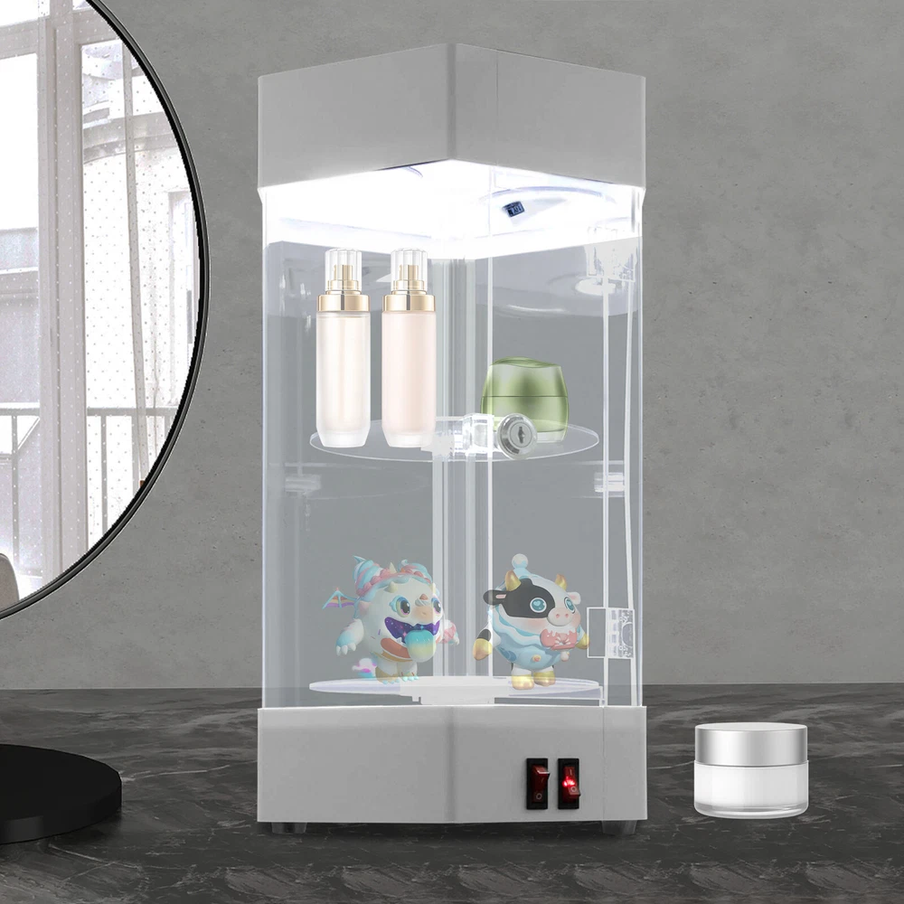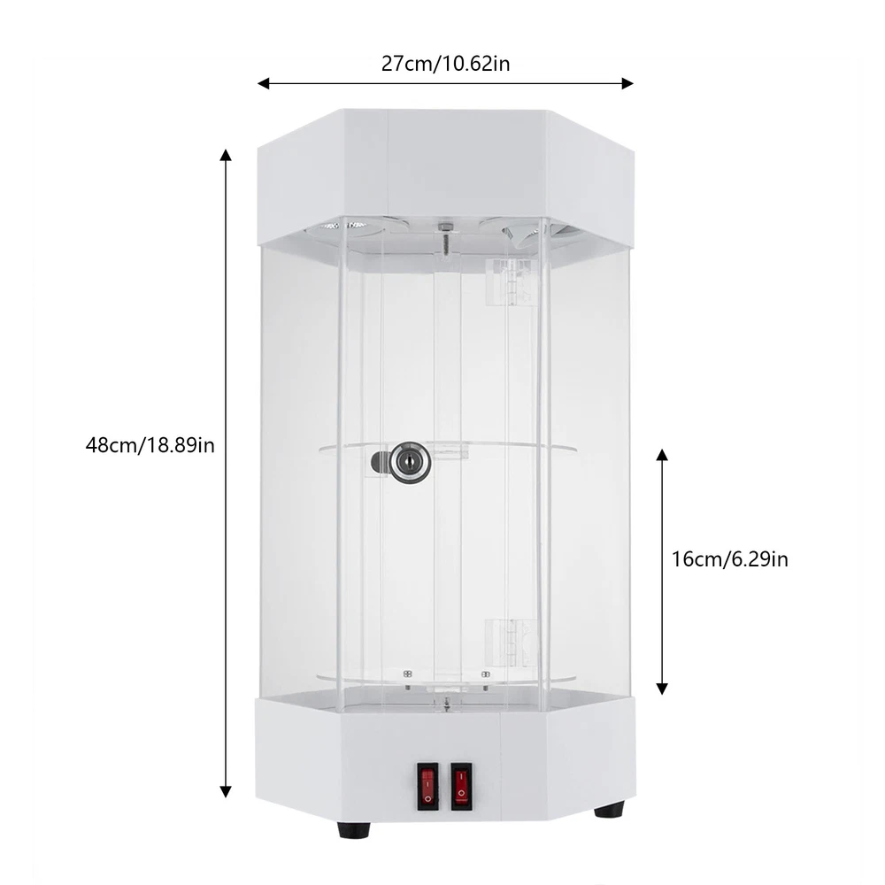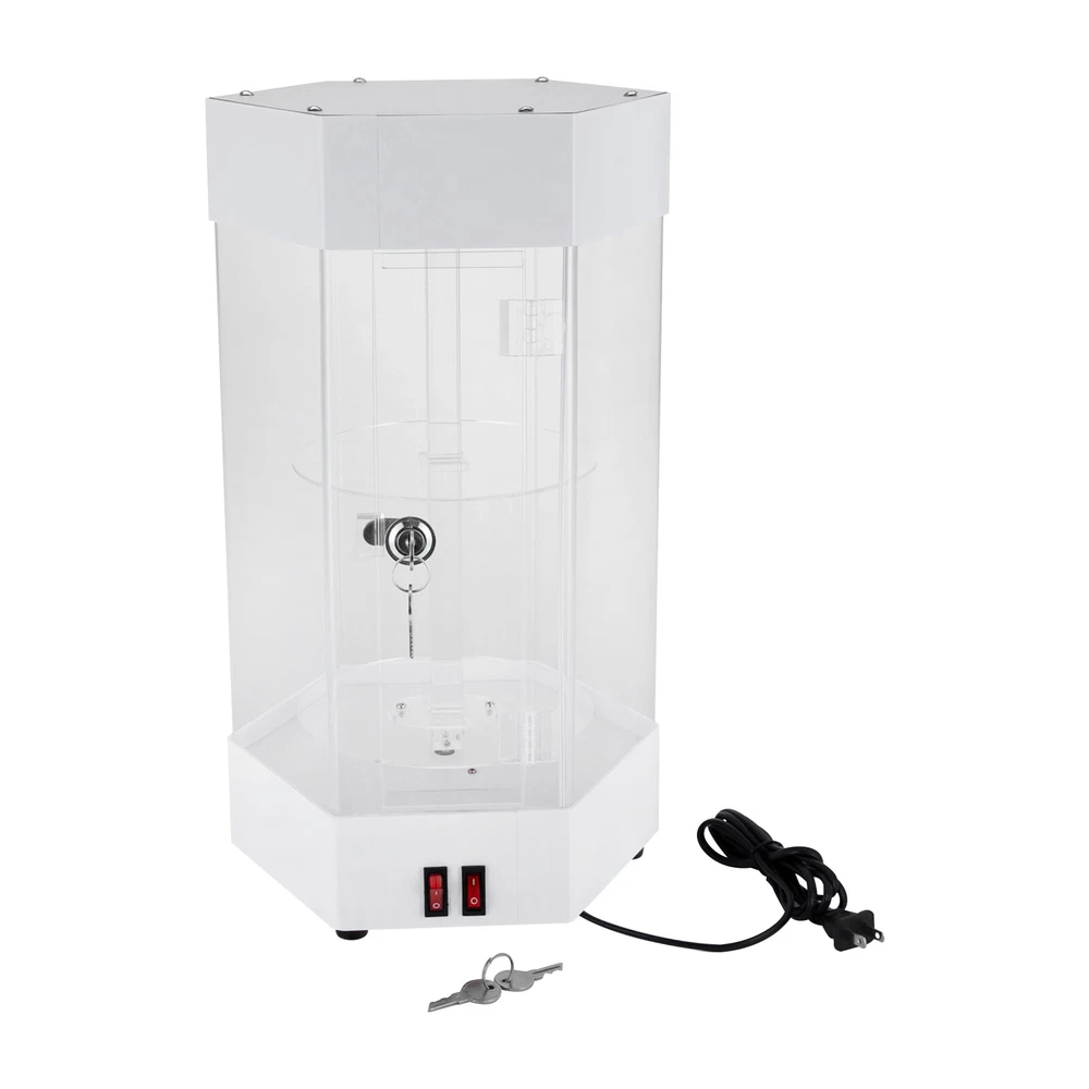 Specifications Color: Clear, White Style: Modern Shape: Hexagonal Material: Acrylic Process: Hot Bending Plug Type: US Standard Mount Type: Free Standing Assembly Required: No Light Source: 2* LED(Included) Each LED Power: 3W Product Size(D*H): 27*48cm/10.63*18.9in Rotating Tray Diameter: 18cm/7.09in Package Size: 53*32*26cm/20.87*12.6*10.24in Gross Weight: 5kg/11.02lbs Net Weight: 4.5kg/9.92lbs Package Included 1* Electric Rotating Display Case 2* Keys 360° Electric Jewelry Rotating Clear Display Case with Built In LED 10.63"x18.9" Description If you're looking for an eye-catching way to display your collections or merchandise, this electric rotating display case with LED lights is a great choice. Made of clear acrylic, it has a modern look and a long service life. The 360° rotating design will display your item from all angles. Quickly buy it, and make every display an unforgettable visual feast! Key Features Build to Last: The product is made of high-quality acrylic with a hot bending process, which is sturdy, wear-resistant, and waterproof , ensuring a long service life. Excellent Lighting: The product comes with two 3W LED lights to provide excellent illumination for your exhibits, making your exhibits look more brilliant and eye-catching. 2-tier Design: The 2-tier design provides you with more space to display your products. Good Display Effect: The 360° auto-rotating design and clear body allow the viewer to see the whole exhibit from any angle, giving your exhibit a complete display. Simple Operation: You can easily control the rotating and LED lights with the two switches on the base. Easy to Clean: Its smooth surface and simple structure make it easy to clean with a soft cloth. Safety Guard: It comes with a lockable door and two keys, which can prevent people from touching, stealing, or damaging it. Customer Service: We aim to provide quality products and services. If you have any problems, please feel free to contact us. We will reply and solve the problem for you as soon as possible. Details Non-slip Feet: They provide the product and your collection sturdy support to prevent it from sliding or shaking during daily use. Rounded Corners: They can protect your hands from being scratched when you touch the product. Application The product is suitable for personal uses, exhibition halls, antique stores, watch stores, etc. for safe storage and display of cosmetics, perfumes, figurines, souvenirs, jewelry, watches, sunglasses, glasses, and other valuable collectibles. Specifications Color: Clear, White Style: Modern Shape: Hexagonal Material: Acrylic Process: Hot Bending Plug Type: US Standard Mount Type: Free Standing Assembly Required: No Light Source: 2* LED(Included) Each LED Power: 3W Product Size(D*H): 27*48cm/10.63*18.9in Rotating Tray Diameter: 18cm/7.09in Package Size: 53*32*26cm/20.87*12.6*10.24in Gross Weight: 5kg/11.02lbs Net Weight: 4.5kg/9.92lbs Package Included 1* Electric Rotating Display Case 2* Keys Notes Please check the size carefully before ordering. Please note that the product only includes one display cabinet, and the displayed items in the picture are not included. There may be a slight noise when the motor rotates, please place your order carefully if you mind. After rotating the motor for 3-4 hours, it should be stopped for about 30 minutes to avoid overheating and damage, which may affect the service life of the motor. Please allow the slight color difference caused by the shooting light and 1-3cm error due to manual measurement, and make sure you do not mind before you order. Welcome to 💛 If you have any question , please contact us , and we will reply you as soon as possible. Payment Delivery details Terms of sales About us Contact us Payment We accept ebay payment 。 Fees such as import duties, taxes are not included in the item price or shipping costs. These charges are the buyer's responsibility. Delivery details Shipping: 2-9 working days to: USA Terms of sales We maintain high standards of excellence and strive for hundred percent customer satisfaction. Feedback is very important to us. We hope that you contact us immediately before you give neutral or negative feedback, so that we can address your concerns. It is impossible to address issues if we do not know about them! About us Your satis faction is our ultimate goal. We work hard to earn your trust and future business. Our certified technicians have tested each item before shipping. The unit comes with 1 year limited warranty on all manufacturing defects. a) If you receive a defective item, you may return it or ask for a discount. Please contact us within 14 days after you receive the package. b) What you returned must be intact and in its original packaging as re? u. Customer is responsible for shipping costs of the returned item. c) We will cover the cost of shipping back t with the shipping rate indicated in the registration page. We will send you a new unit or refund the full payment you paid. Thank you. Contact us Business Hour Business Hour: Monday To Friday: 8:30 AM to 5:00 PM (Beijing China time) Due to time zones, our reply to your questions may not be immediately. But within above working time, we will reply your email within 24 hours. If it's non-workdays, please kindly be patient and wait till Monday. Please contact us with ebay message. Please feel free to contact us if you have any questions. Monday To Friday: 8:30 AM to 5:00 PM (Beijing China time) Due to time zones, our reply to your questions may not be immediately. But within above working time, we will reply your email within 24 hours. If it's non-workdays, please kindly be patient and wait till Monday. Please contact us with ebay message. Please feel free to contact us if you have any questions.