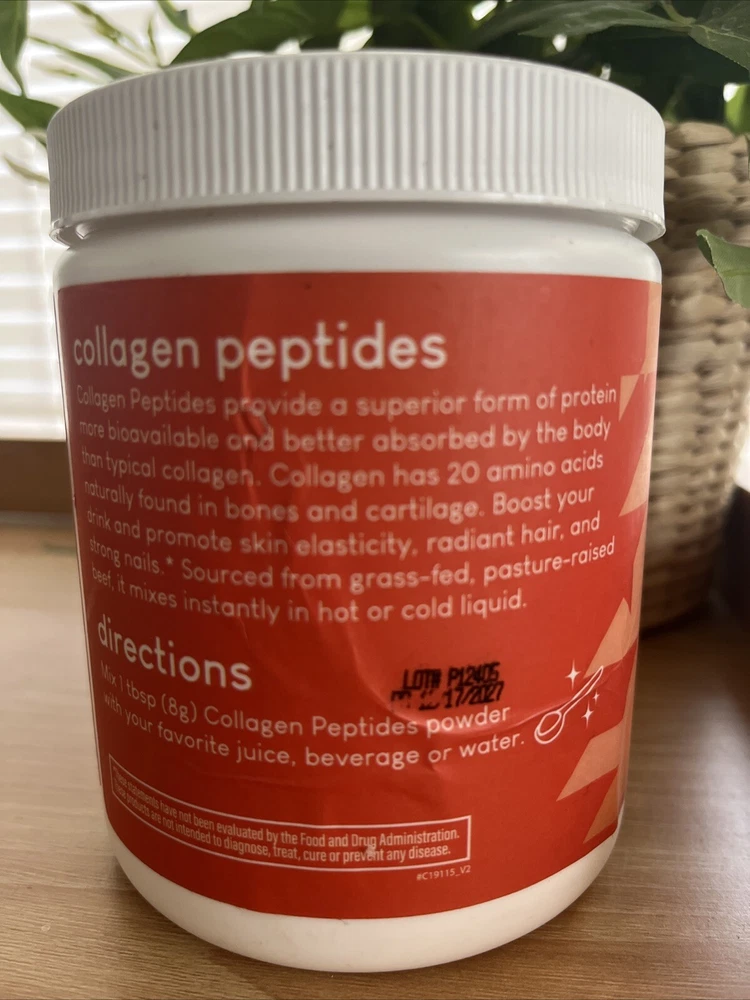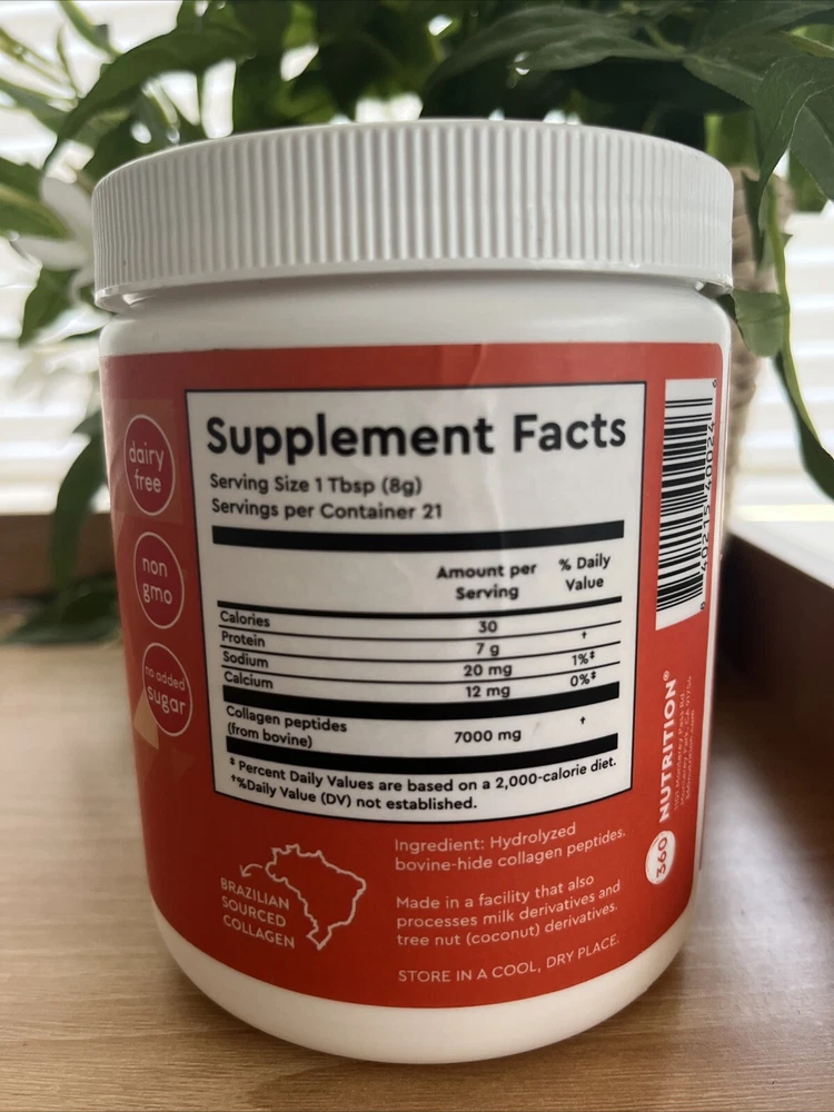 Type:Dietary SupplentMPN:4002Item Weight:6 ozFlavor:UnflavoredNumber of Pills:PowderUPC:840215400246Features:Grass Fed, Dairy free, Gluten free, no sugar addesDosage:1 Tbsp into 8 ounces of water, milk, or your favorite juicegtin13:840215400246Expiration Date:11/27Nutrition Facts Label:YesCountry/Region of Manufacture:United StatesFormulation:PowderActive Ingredients:Collagen PeptidesWhen to Take:DailyVolume:6 ozBrand:360 NutritionIngredients:CollagenType of Diet:Keto, PaleoMain Purpose:Anti-Aging, Bone & Joint Health, Digestive Support, Hair, Skin & Nail HealthDepartment:Adult, Unisex