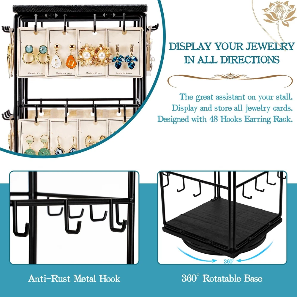 Rotating Wooden Jewelry Display: This earring holder organizer sits on a rotating stand, which display your jewelry in all directions. It can display various types of earrings and necklaces or keychains in four sides, increasing earring display opportunities. Attractive and Sturdy: Our rotate jewelry display racks are made of solid wood and strong metal, durable and sturdy to ensure long term use. This earring display stands are perfect for showcasing your beautiful earrings and attracting your customers' attention. Easy to Install: This spinning earring display stand tower is so easy to put this turning earring storage organizer together, all you need to do is just screw the 4 metal parts between the 2 wood parts, then you are done with your installation and can get a high-end, beautiful rotating jewelry stand to properly display your earring cards or jewelry. Perfect Size: Earring display rack measures 7.28"L x 7.28"W x 15.74"H that doesn’t take up a lot of space and perfectly fit any counter, earring display jewelry display for vendors 48 hooks offer maximum storage capacity for hanging all of your jewelry collection easily and beautifully. Where to Use: This wood jewelry display stand is practical and convenient, which commonly used in retail stores, trade shows, or exhibitions, earring display, jewelry display for vendors, and you also can be applied it for selling, showing.