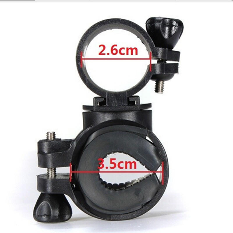 Description Features: This Bicycle Flashlight Holder is easy to mount on your bicycle with a screw,very easy to take off flashlight when you leave bikeThis light clip, can rotate 360 degrees, up and down can be quick-release separation, cost-effective, stylish and practical Color:Black Model: 360°circumrotate Material : strong plastic with high quality design 20 x 68 x 1 mm elastic Anti-slip Pad 24 x 70 x 5 mm elastic Anti-slip Pad 2.6cm Diameter for Flashlight 3.5cm Diameter for Bicycle Package Include: 1 x 360° Bicycle Flashlight Mount Preview
