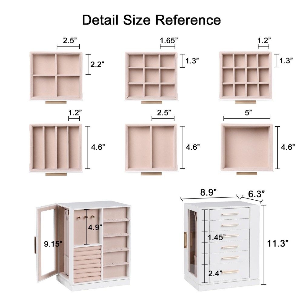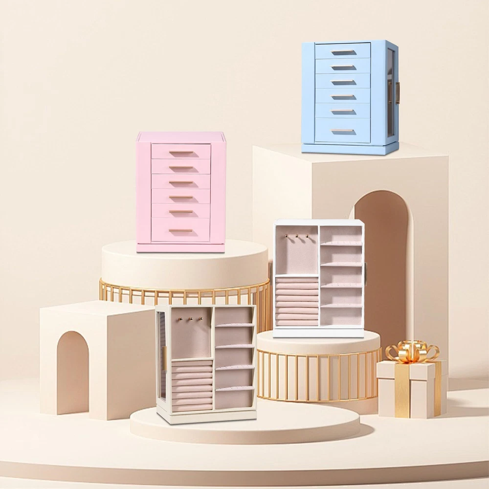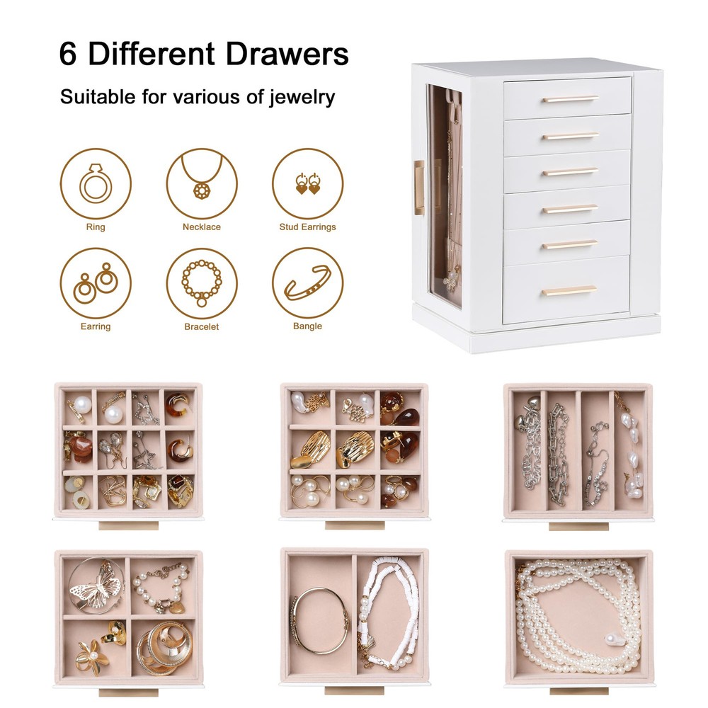 360° Rotating Design:Our jewelry box & organizers features a unique 360° rotating design, along with a three-sided visual design and vertical storage, which allows you to display and quickly access the jewelry you want effortlessly Large Versatile Capacity:This jewelry holder organizer measures 11.3"x 8.9"x 6.3"which can provide spacious storage space for your jewelry.It comes with 3 bracelet hooks,7 ring slots for storing at least 21 rings,48 stud earring holes,18 hooks for hanging necklaces and 6 drawers with different layout,this is a perfect jewelry box for women Premium Quality Material:This jewellery box has a sturdy MDF construction and is of high quality.The synthetic leather exterior is durable and easy to clean,and the soft velvet interior can keep your jewelry well protected.In addition,all the sparkling metal handles are cast by special craftsmanship,combining practicality and aesthetics Chic and Stylish :Elegant gold handles, minimalist style, and rotatable design come together to form this unique jewelry box with a stylish look that is suitable for a variety of scenarios including vanity,dressing table and jewelry stores Ideal Gift for Your Loved One:Looking for a gift for a jewelry collector? Look no further!This jewelry box is the ideal combination of functionality,style,and durability,making it a great gift for any occasion.Surprise your loved ones with this elegant jewelry box