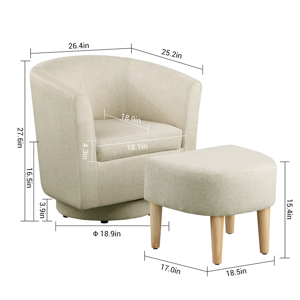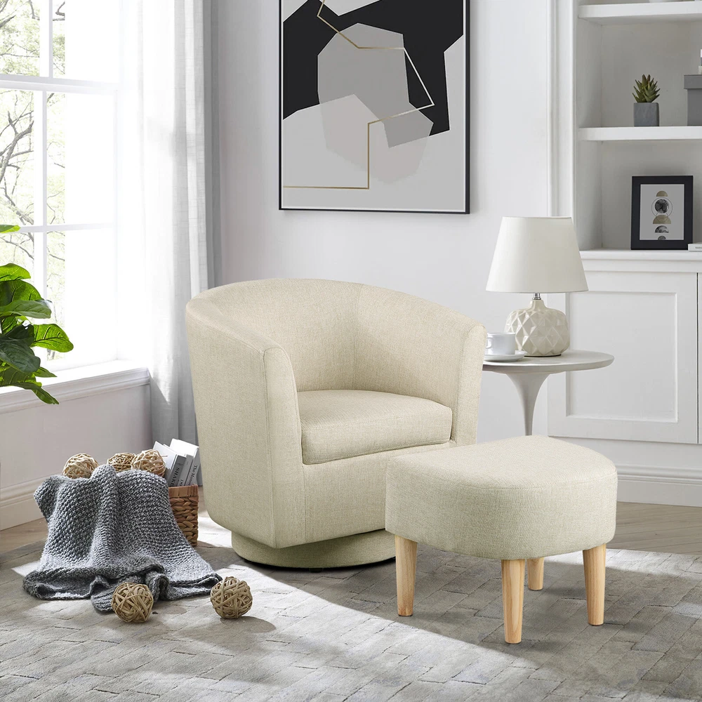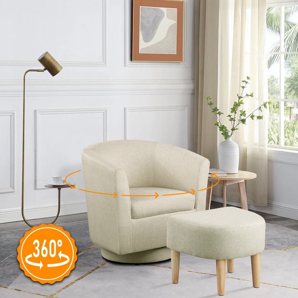 360° Swivel Armchair for Livingroom Bedroom, Fabric Chair Accent Sofa w/ Ottoman Feature Comfortable with its shoulder-blade-high backrest and heavy-filled foam cushioning, this modern swivel accent barrel chair is a cool addition to any room in your home! No matter where your need, whether it is your living room, family room, bedroom or office, this chair is ideal for any need. Graceful silhouette with sloped arms, this club armchair is a classic piece with a fresh twist and might. The heavy duty 360-degree swivel base features tasteful wood accent base detail & allows great flexibility in the home. Metal base offers smooth 360 degree swivel for turning to face any direction with ease This swivel chair is fully assembled, simply pull it out of the box & have a seat. Rounded back and sloped arms offer a secure, encompassed feeling. Swivel chair for leisurely sitting; ideal for living room, reading nook, home office, bedroom, or reception area. Provides comfort & durability. Construction: Strong solid wood frame & 360-degree swivel wood base construction. Specification The total size of the swivel chair is about 26.4in*25.2in*27.6in(L*W*H) Ottoman size: 18.5in*17in*15.4in(L*W*H) Fabric material: linen Color: Beige Package Gasket *4 Hex screw *4 Hex wrench*1 Swivel Accent Chair*1 Ottoman*1 Pedal*1 Foot *4 Delivery details Payment Terms of sales Feedback Contact us Delivery details 1. BUSINESS DAY MONDAY- FRIDAY FAST SHIPPING FROM USA. 2. All orders and payments received before 4PM EST (1PM PST) will be shipped the same business day. 3. No shipping on Saturday,Sunday or USA Public Holidays 4. No responsibility for any custom duty Payment We accept payment by PayPal only. Terms of sales 1. We offer a 60 day money back guarantee or exchange. 2. Buyer pays return shipping and we pay replacement shipping. 3. If you want to initiate a return,please contact us to get a returning address before sending the item back. Feedback 1. We strive to provide the best products and services. 2. Your positive feedback 5 stars DSR help us do better. 3. If anything about your transaction did not meet expectations, please CONTACT US and give us the opportunity to make things right. We are always here to help. Contact us Please do not hesitate to CONTACT US . You can message 24/7 on eBay for all questions and inquiries. We will get back to you within one business days at the latest from Monday- Friday.