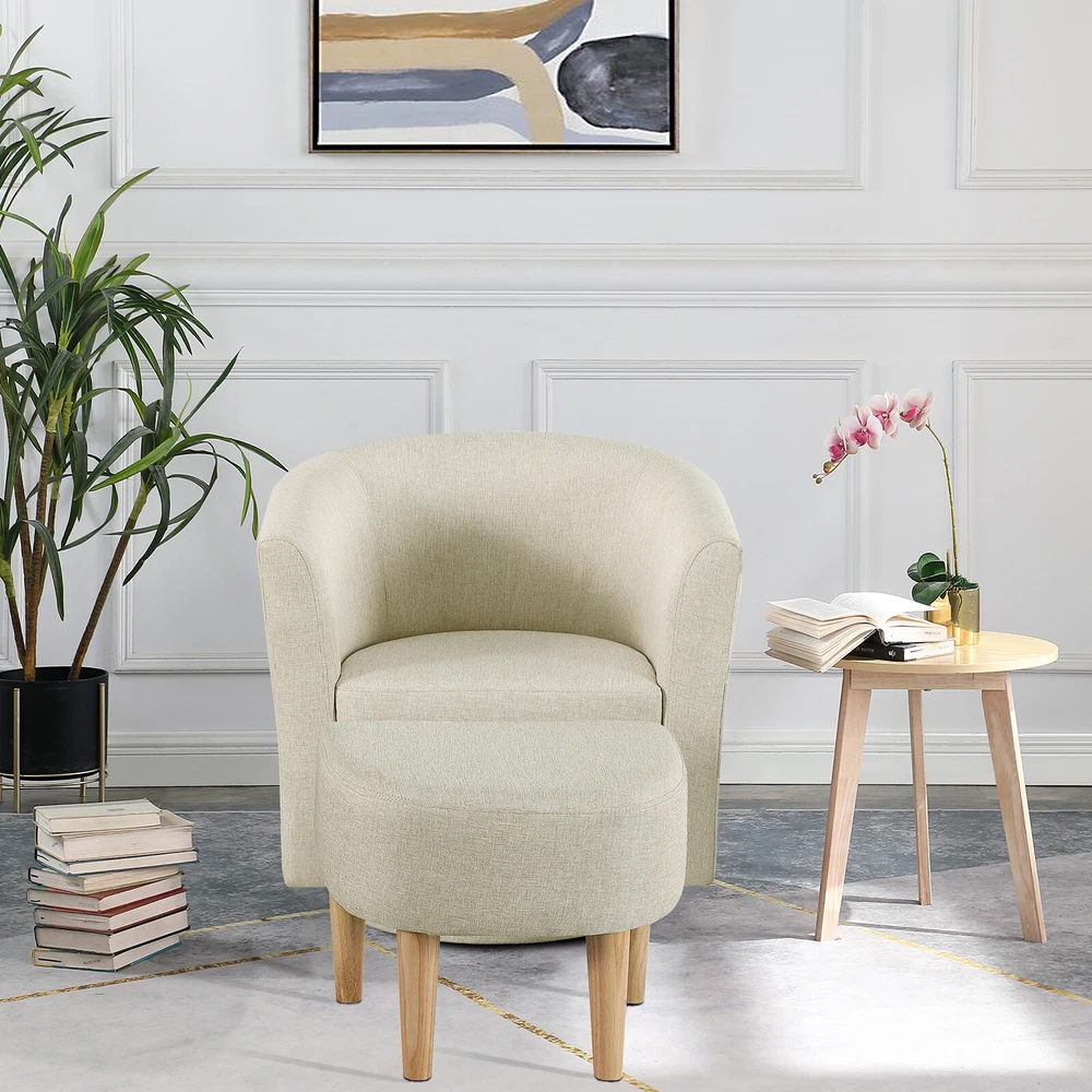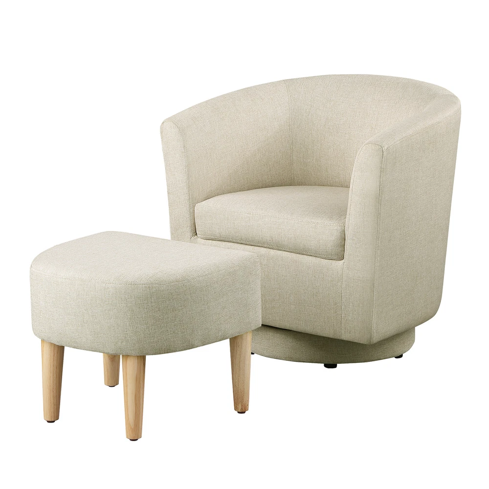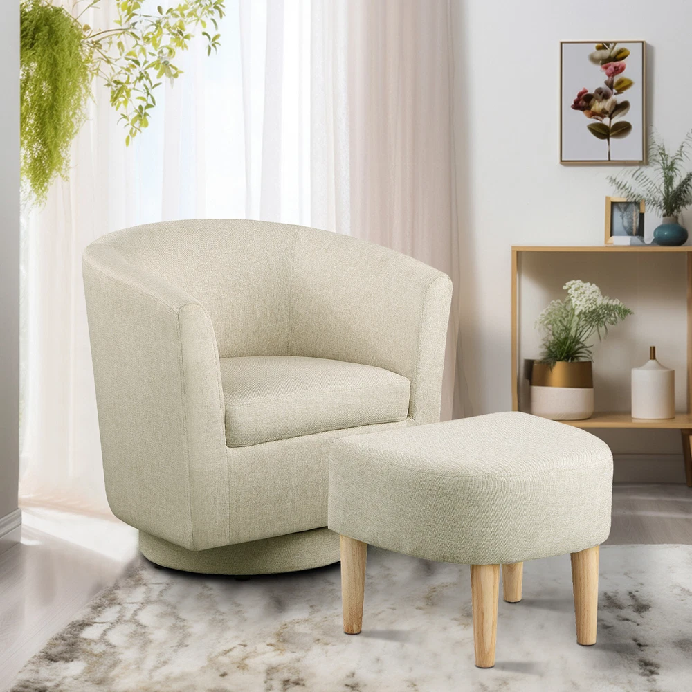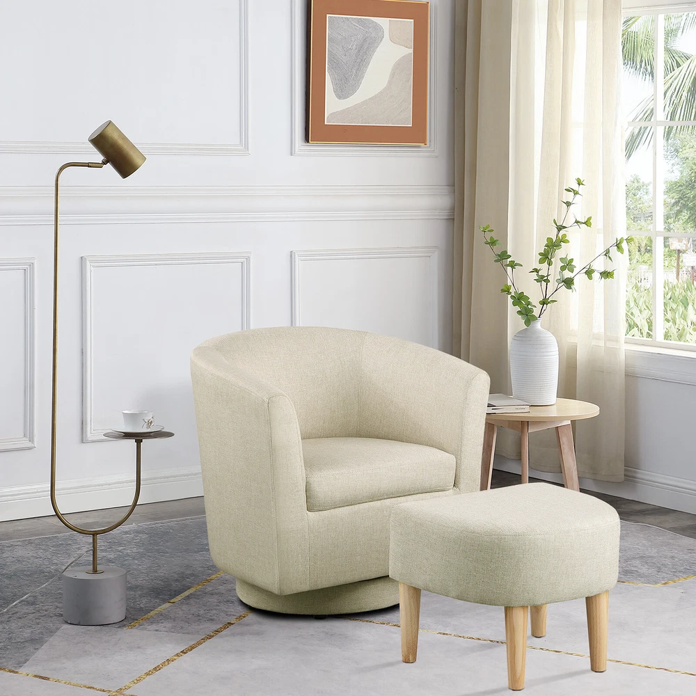 360° Swivel Armchair for Livingroom Bedroom, Fabric Chair Accent Sofa w/ Ottoman Feature Comfortable with its shoulder-blade-high backrest and heavy-filled foam cushioning, this modern swivel accent barrel chair is a cool addition to any room in your home! No matter where your need, whether it is your living room, family room, bedroom or office, this chair is ideal for any need. Graceful silhouette with sloped arms, this club armchair is a classic piece with a fresh twist and might. The heavy duty 360-degree swivel base features tasteful wood accent base detail & allows great flexibility in the home. Metal base offers smooth 360 degree swivel for turning to face any direction with ease This swivel chair is fully assembled, simply pull it out of the box & have a seat. Rounded back and sloped arms offer a secure, encompassed feeling. Swivel chair for leisurely sitting; ideal for living room, reading nook, home office, bedroom, or reception area. Provides comfort & durability. Construction: Strong solid wood frame & 360-degree swivel wood base construction. Specification The total size of the swivel chair is about 26.4in*25.2in*27.6in(L*W*H) Ottoman size: 18.5in*17in*15.4in(L*W*H) Fabric material: linen Color: Beige Package Gasket *4 Hex screw *4 Hex wrench*1 Swivel Accent Chair*1 Ottoman*1 Pedal*1 Foot *4 Delivery details Payment Terms of sales Feedback Contact us Delivery details 1. BUSINESS DAY MONDAY- FRIDAY FAST SHIPPING FROM USA. 2. All orders and payments received before 4PM EST (1PM PST) will be shipped the same business day. 3. No shipping on Saturday,Sunday or USA Public Holidays 4. No responsibility for any custom duty Payment We accept payment by PayPal only. Terms of sales 1. We offer a 60 day money back guarantee or exchange. 2. Buyer pays return shipping and we pay replacement shipping. 3. If you want to initiate a return,please contact us to get a returning address before sending the item back. Feedback 1. We strive to provide the best products and services. 2. Your positive feedback 5 stars DSR help us do better. 3. If anything about your transaction did not meet expectations, please CONTACT US and give us the opportunity to make things right. We are always here to help. Contact us Please do not hesitate to CONTACT US . You can message 24/7 on eBay for all questions and inquiries. We will get back to you within one business days at the latest from Monday- Friday.