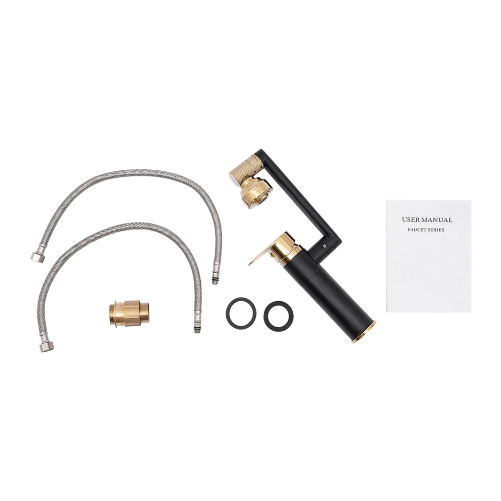 360° Bathroom Sink Faucet Single Handle Waterfall Vanity Basin Mixer 2 Function Sink Tap 360° Swivelling Kitchen Sink Tap Mixer Tap New Designed Washbasin Mixer Tap with One Handle, 2 Water Outlet Modes Hose Connection, Multifunctional Rotating Tap Bathroom Sink Faucet with Degree Swivel Faucet for Bathroom Modern Vanity Faucet,2 Water Outlet Modes,Each Joints 360° Swiveling,Newly-Designed Basin Faucet Mixer Tap for Multi-Scene Use Description This upgraded bathroom sink faucet that rotates 360° is ideal for modern homes. It makes it easy to brush your teeth, wash your face, and wash your hair without a towel or cup, bringing you a pleasant, hygienic, and convenient washing experience! Key Features Rotation Function : The sink faucet is designed to rotate 360° not only expanding the range of activities of the faucet but also increasing the flexibility of use. A rotatable faucet allows you to experience a more clean and convenient experience without a water cup brushing teeth. Double Water Effects : By turning the nozzle part, the faucet provides strong flushing and bubble anti-splash two kinds of the water outlet. Powerful water is suitable for cleaning sinks, fruits, and vegetables, while bubble water is suitable for hand and face washing. Sturdy and Durable : The body of this faucet is made of thickened brass, which is very strong, durable, corrosion-resistant, pressure-resistant, and explosion-proof. Easy to Operate : The faucet is equipped with a lift switch, which can be easily activated by gently lifting the switch. The rotatable nozzle, support arm, and faucet bring you flexible and easy operation. Superb Craftsmanship : The faucet uses a superior painting process to improve its gloss, corrosion resistance, and wear resistance, presenting a luxurious and elegant style while being more durable. Ceramic Spool : The ceramic spool has excellent wear resistance, high-temperature resistance, sealing, and compressive strength so that the faucet can maintain excellent sealing for a long time to avoid leakage. Dual Control : The bathtub shower unit is designed with dual control of hot and cold. The right turn is cold and the opposite direction is hot, so you can shower in winter without worrying about getting cold. Elegant Appearance : Matte black and gold present an elegant, luxurious style that can enhance the overall style of the bathroom. Customer Service : We aim to provide quality products and services. If you have any problems, please feel free to contact us. We will reply and solve the problem for you as soon as possible. Details Sealing Rings : High-quality and durable sealing rings can increase the sealing performance and prevent leakage effectively. Anti-slip Surface : The nozzle is equipped with anti-slip surfaces to facilitate use and prevent slipping. Application This sink faucet is suitable for homes, RVs, schools, hotels, public service places, etc. Specification Material: Brass, Ceramic Color: Black and Gold Style: Modern Process: Painting Spool: Ceramic Spool Handle Type: Lever Recommended Uses for Product: Bathroom Special Feature: Dual Function Sprayer Temperature Resistant: 70℃/158℉ Gross Weight: 1.25kg/2.75lbs Net Weight: 1.1kg/2.42lbs Package Size: 36.5*24*7cm/14.37*9.44*2.75in Product Height: 20.5cm/8in Rotating Bar Length: 20cm/7.8in Distance Between Bottom and Rotating Bar: 13cm/5.1in Inlet and Outlet Pipe Length: 50cm/19.68in Package Included 1*Faucet 2*Sealing Rings 2*Pipes 1*English User Manual All Accessories Needed for Installation Notes 1. This product applies to single-hole sinks, not three-holes. 2. It is recommended to regularly clean the surface of the faucet with water or mild detergent, and then dry the faucet with a soft towel. Avoid using a rough cloth, metal wire or scrub pad with hard particles. To keep the faucet smooth and bright, do not use salt or vinegar-based detergents. 3. Do not contact with organic solutions and corrosive chemicals to avoid damaging the coating on the surface of the faucet and affecting the brightness of the coating on the faucet. 4. This product applies to the installation after the completion of all decoration projects to avoid damage and corrosion of faucets. 5. Please allow the slight color difference caused by the shooting light and 1-3cm error due to manual measurement. Please make sure you do not mind before you order. Payment Delivery details Terms of sales About us Contact us Payment We accept ebay payment 。 Fees such as import duties, taxes are not included in the item price or shipping costs. These charges are the buyer's responsibility. Delivery details Shipping: 2-9 working days to: USA Terms of sales We maintain high standards of excellence and strive for hundred percent customer satisfaction. Feedback is very important to us. We hope that you contact us immediately before you give neutral or negative feedback, so that we can address your concerns. It is impossible to address issues if we do not know about them! About us Your satis faction is our ultimate goal. We work hard to earn your trust and future business. Our certified technicians have tested each item before shipping. The unit comes with 1 year limited warranty on all manufacturing defects. a) If you receive a defective item, you may return it or ask for a discount. Please contact us within 14 days after you receive the package. b) What you returned must be intact and in its original packaging as re? u. Customer is responsible for shipping costs of the returned item. c) We will cover the cost of shipping back t with the shipping rate indicated in the registration page. We will send you a new unit or refund the full payment you paid. Thank you. Contact us Business Hour Business Hour: Monday To Friday: 8:30 AM to 5:00 PM (Beijing China time) Due to time zones, our reply to your questions may not be immediately. But within above working time, we will reply your email within 24 hours. If it's non-workdays, please kindly be patient and wait til