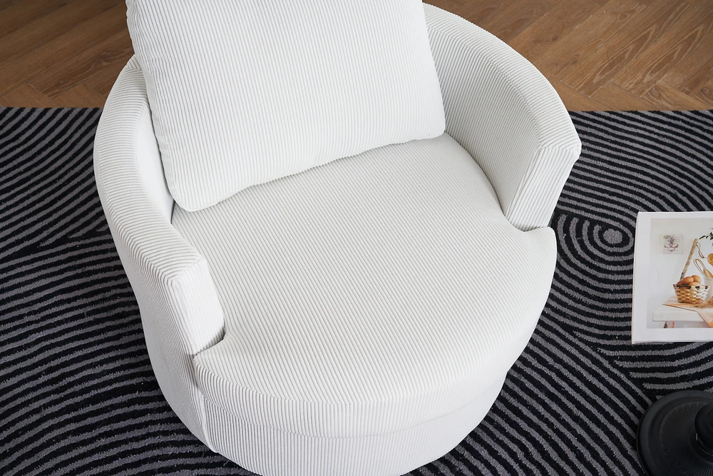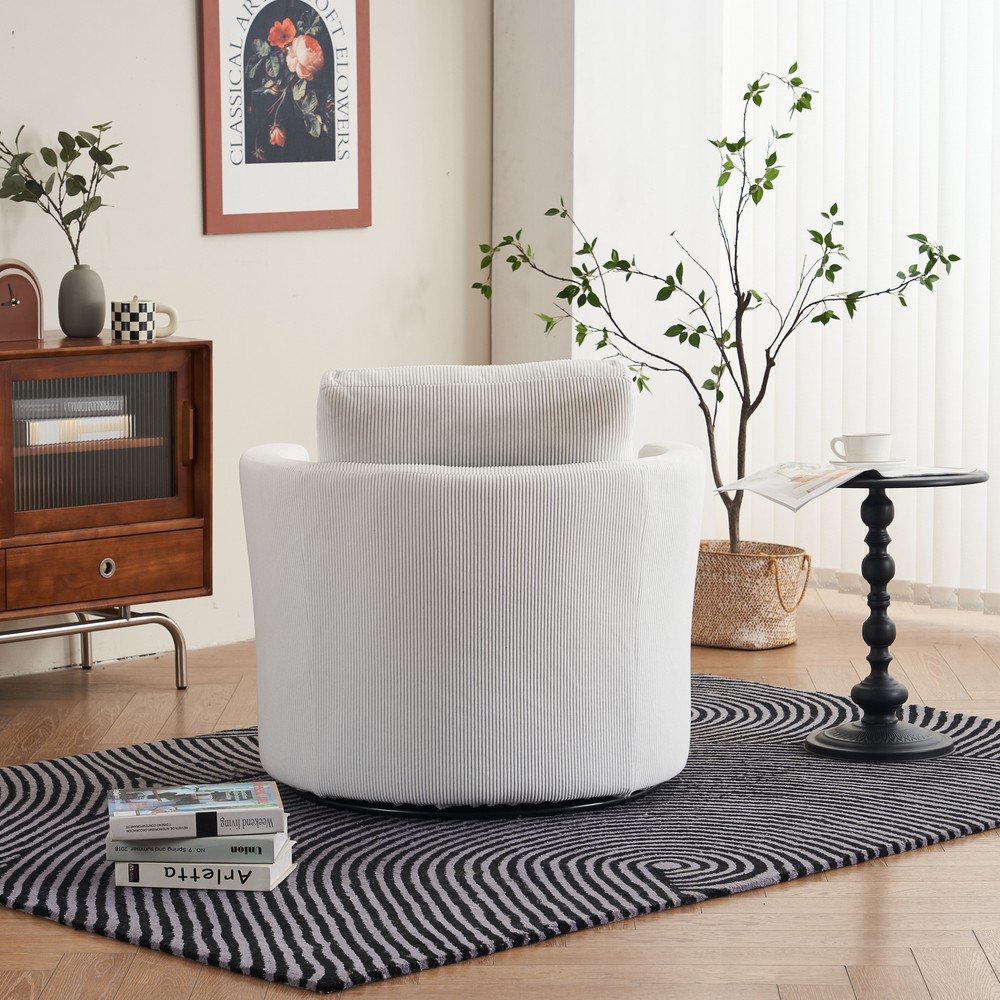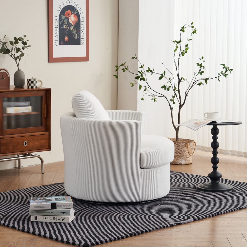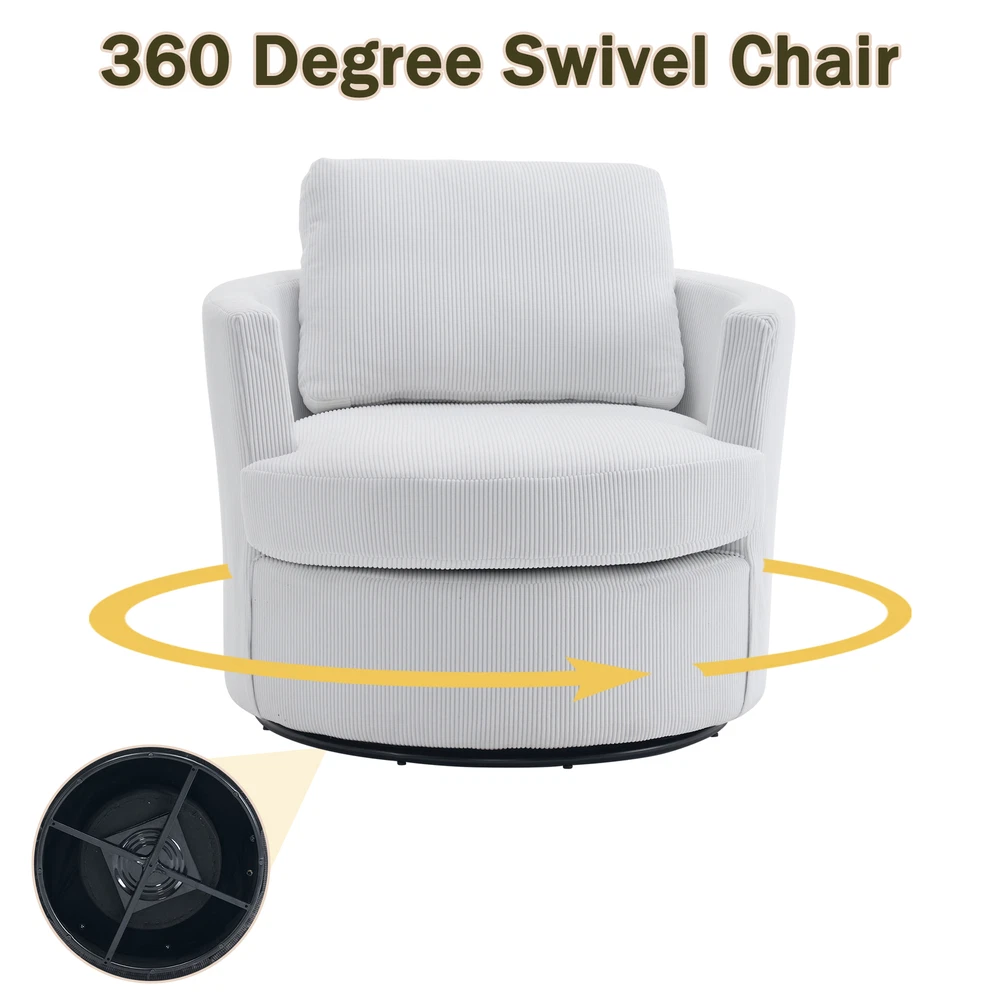 This swivel barrel chair is a fantastic addition to any living space! The 360-degree rotation is smooth and silent, making it perfect for relaxing or entertaining. The reversible, high-density foam cushion is incredibly comfortable, and the removable cover makes cleaning a breeze. The sturdy metal base and supportive arms add both durability and convenience. The soft polyester fabric feels premium and holds up well over time. Compact yet spacious enough to curl up in, this chair offers both style and comfort at an unbeatable value. Highly recommend!