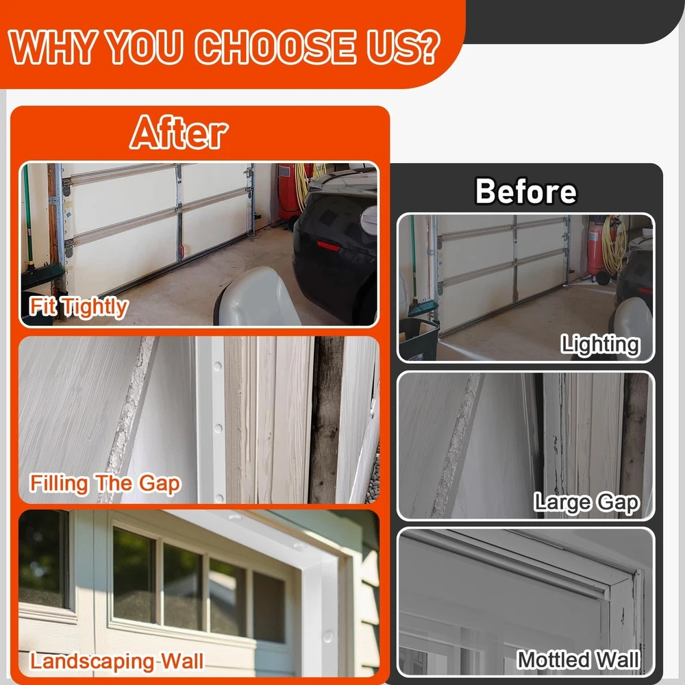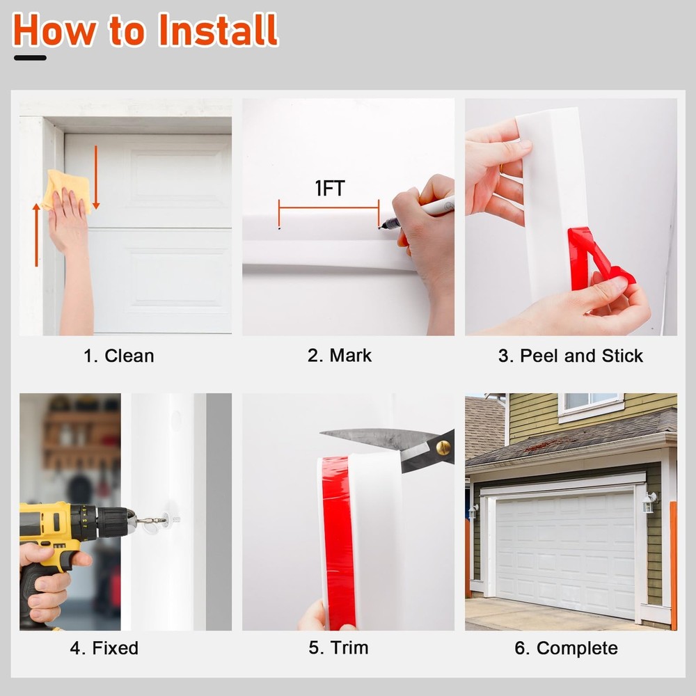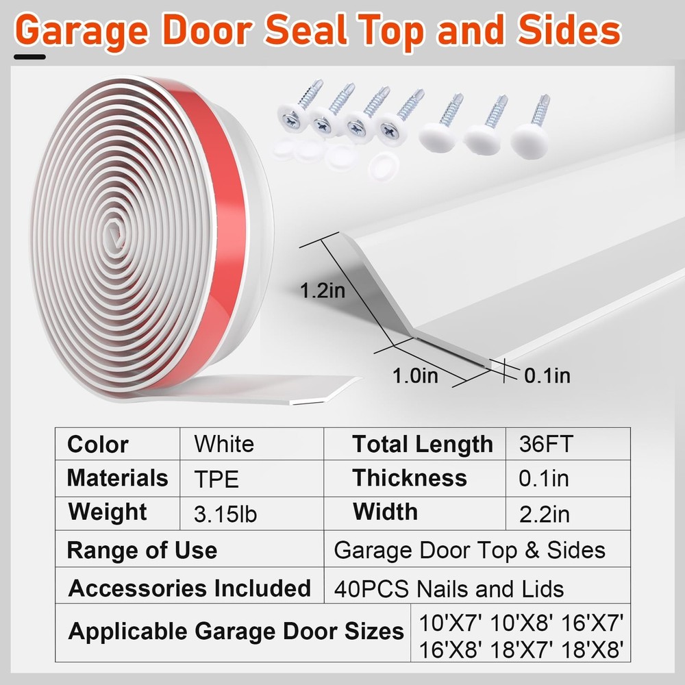 Garage Door Seal Top and Sides - Jobon 36FT White Self Adhesive Universal TPE Garage Door Weather Stripping Replacement Kit, Easy Installation for DIYers & Commercial Use Product Details Size: 36FT Color: White Brand: Jobon MPN: CKCBMFT-001 UPC: 717813088926 EAN: 0717813088926 Brand: Jobon Material: Thermoplastic Elastomer (TPE) Color: White Product Dimensions: 1.3"L x 1"W Item Thickness: 0.38 Inches Brand: Jobon Material: Thermoplastic Elastomer (TPE) Color: White Product Dimensions: 1.3"L x 1"W Item Thickness: 0.38 Inches Recommended Uses For Product: garage door top and side UPC: 717813088926 Number of Items: 1 Manufacturer: Jobon Unit Count: 1.0 Count Part Number: CKCBMFT-001 Item Weight: 3 pounds Country of Origin: China Item model number: CKCBMFT-001 Size: 36FT Style: Shapes/Stripes Shape: Rctangular Item Package Quantity: 1 Included Components: Nails Batteries Included?: No Batteries Required?: No Date First Available: March 19, 2025 Weatherproofing Garage Door Seals: Say goodbye to muddy puddles, dusty corners, and piles of leaves! Our garage door seal top and sides seal strip blocks rain, wind, dust, and debris from sneaking inso you spend less time sweeping and more time enjoying a spotless garage Energy Efficiency & Stay Cosy: Stop cold drafts and heat loss! Our garage door side seal weather strip locks in warmth during winter and blocks hot air in summer, cutting energy costs while keeping your garage (and home) more comfortable Easy DIY Installation - No Pro Needed: No tools? No problem! The self-adhesive garage door weather stripping side seal sticks firmly to your door frame, and included screws (40pcs) add extra security. Replace old, cracked seals in a few minutes - skip the handyman and save on costly installations Universal Fit for Most Garage Doors: This 36ft garage door top and side seal is suitable for garage doors sized 10'X7' 10'X8' 16'X7' 16'X8' 18'X7' 18'X8'. Ideal for residential and small commercial garage use Flexible & Durable TPE Materials: Made of tough, flexible TPE material, our garage door weather seal top and sides wont crack, warp, or fade easily even in extreme heat, ice, or storms. Year after year, it stays snug against your door for reliable protection