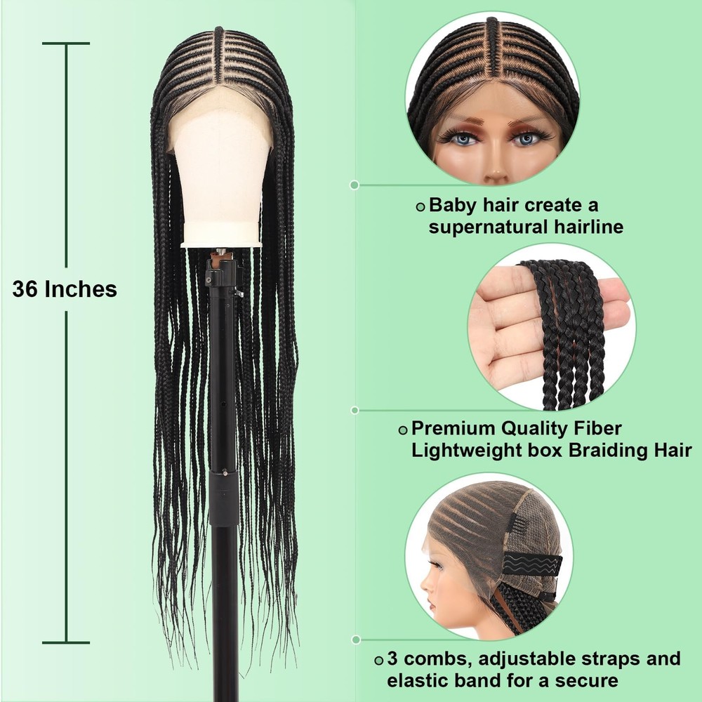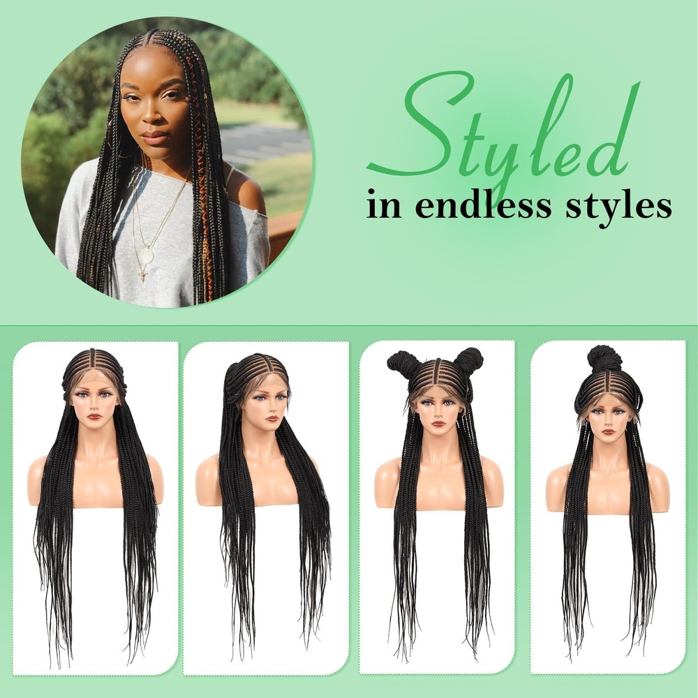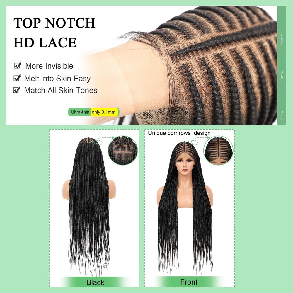 Style: HD Lace front Braided Wig You Will Get: Braided Lace Wig*1, Pack Wig Cap*1, False Eyelashes*1 Hair Material: Japan-made Synthetic Fibers Length: 36 inch Weight: 14 oz Cap Size: Circumference of the cap is 21.5-22” Density: 150% Warm Notes 1. Do not use any form of heated equipment at close range on your wig. This includes hair dryers. Remember that your wig is made of synthetic, heat can make it melt. 2. Do not sleep in your braided wigs because this can cause the tips to tangle. 3. Always hang your braid wig when not it use. Do not tie it in a nylon bag or something like that. Always keep it in an airy place. 4. Take care of your natural hair underneath. Remember to loosen the weaves, wash, and remake every 2-3 weeks. 5. Do not allow your wig to remain damp too long, as this will cause it to become a bacteria breeding ground. How to care for the braids wigs? 1. Wash your braid wig in either lukewarm or cold water with a mild shampoo. 2. Never wash wigs in steaming hot water as this can cause the braids to look chapped and because braided wigs are synthetic, washing them with hot water will damage the fibers and your braids will fall out. HD Lace Front Wig Cap: braided hair wigs cover 13x8" HD lace front with half back double lace which looks very realistic. Lace partings throughout the frontal area and the transition units from front to back are very clean, with no bumps, lumps, or gaps. The synthetic braided wigs for women are soft & easy to maintain. Looks and feels so realistic you would never tell it's not real hair Unique Geometric Braid Design: our cornrow braided wig comes with 64 braids and a Unique geometric braided design on the top, which can better modify the whole head shape. An entire geometric pattern of the box braided wigs is braided one by one by hand. The bold braiding style can better reflect the personality of the wearer. Wear the braided wig for women to take your beauty to a higher level Natural Baby Hair: the cornrows braided lace wigs come with pre-plucked baby hair creating a seamless hairline transition you would never tell it's not real hair. Not only that, the forehead is Virtually Undetectable HD lace, and extra lace can be trimmed which matches every skin tone so ideally. Bored of wearing your natural hair all the time? Come and try the natural HD full lace braided wig. You won't regret it Time-Saving: Looking for a popular braided hairstyle without sitting for hours? This is the glueless braided wigs for you. Quick and easy braided style in minutes to get a new look!! Even if you are a novice, you will have no problem installing this braided lace front wig! Also wearing the back cap knotless braided wigs for women can avoid the pain of getting your braiding hair in the salon, and reduce the risk of hair loss. Protect your scalp with this wig Widely Used Occasions: As we all know, cornrow braided are seen as a symbol of beauty, cultural identity, and social status, this 36” box braided wigs is the ideal cornrow braid hairstyle. Braided wigs for black women create a classic style. This style is exquisite for work, church, school, and a night out on the town. Premium braided hair! This is one of the most Most Popular Hairstyles For Women