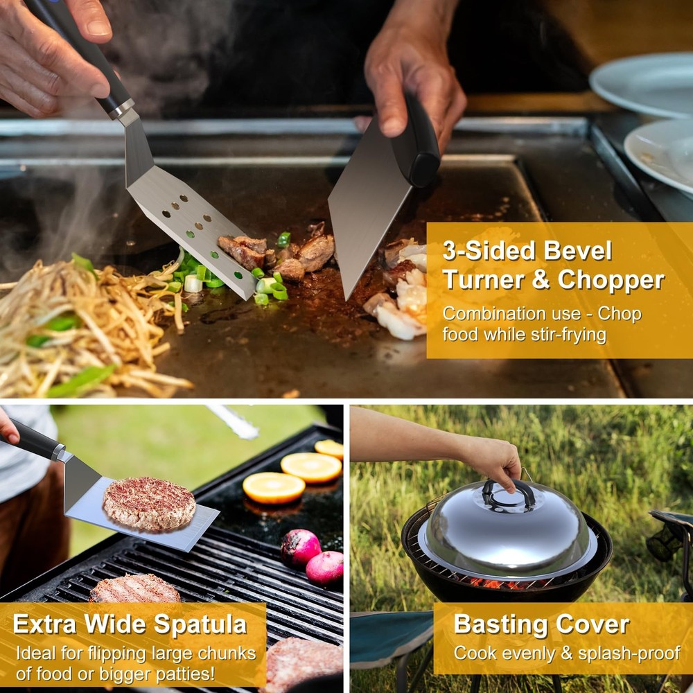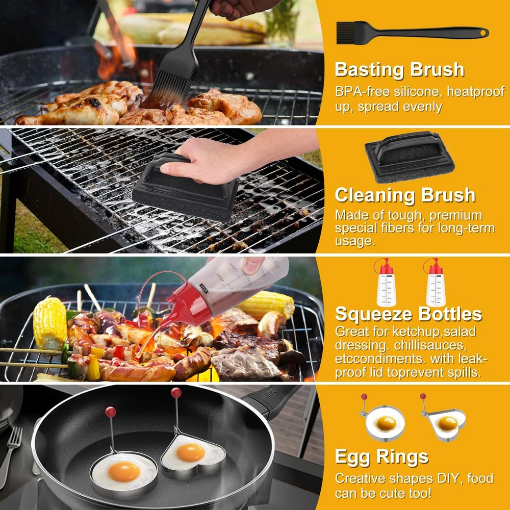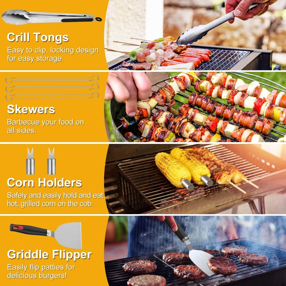 All-in-One 36Pcs Set - The blackstone griddle accessories includes essential tools like a long spatula, short spatula, buger press, scraper, chopper, flipper, tong, skewers, corn holders, egg rings, bottles, cleaning brush, carry bag, tailored for every grilling scenario. Whether flipping juicy steaks, applying marinades, or grilling delicate vegetables, this kit equips you to cook like a pro. Premium Quality BBQ Tools - It is made of premium stainless steel, designed to withstand high heat and resist rust. The sturdy construction ensures each tool remains in top condition after repeated use and won't bend, break, or rust over time. Enjoy professional-grade grilling equipment designed for all your BBQ needs. Ergonomic Design for Comfort - Each tool features an ergonomic handle for a comfortable, secure grip, reducing hand fatigue during extended grilling sessions. The long handles keep your hands safely away from heat, allowing you to grill with precision and confidence, no matter the outdoor cooking challenge. Compact and Portable for Easy Storage - The set comes with a durable carrying bag, keeping all tools neatly organized and ready for your next BBQ. Its compact design makes it easy to transport for picnics, camping trips, or backyard gatherings. Take the joy of grilling anywhere you go with this portable tool set. Thoughtful Gift for Any BBQ Lover - Looking for the perfect gift for a grill enthusiast? This 36pcs griddle accessories kit, Packaged in an attractive case, makes an excellent choice for birthdays, Father’s Day, housewarming parties, or holidays. It's a practical and stylish choice that will delight any grilling enthusiast.